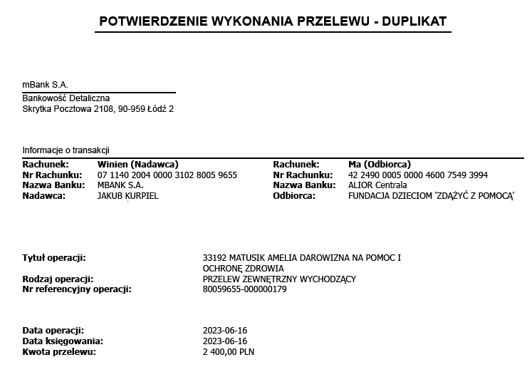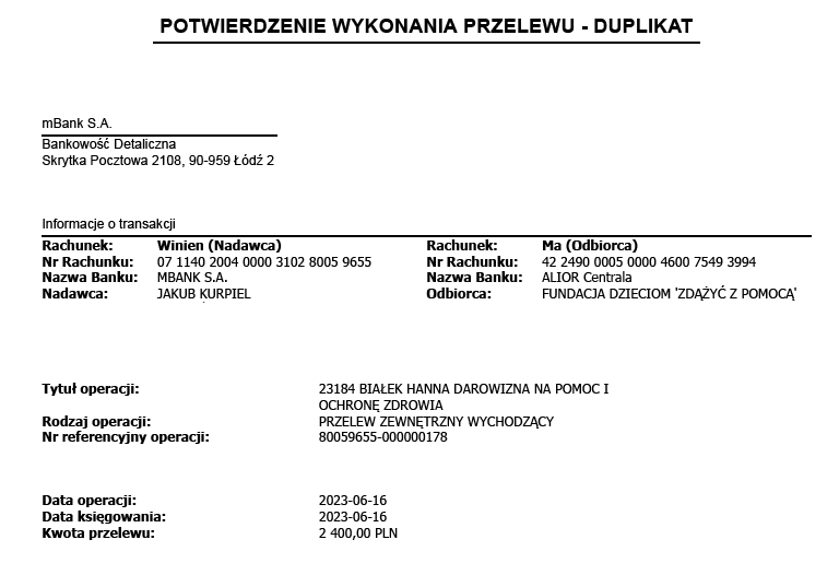 Potwierdzamy wpływ środków na subkonto Hanki w fundacji. Całość przeznaczamy na opłacenie kilku sesji rehabilitacji.