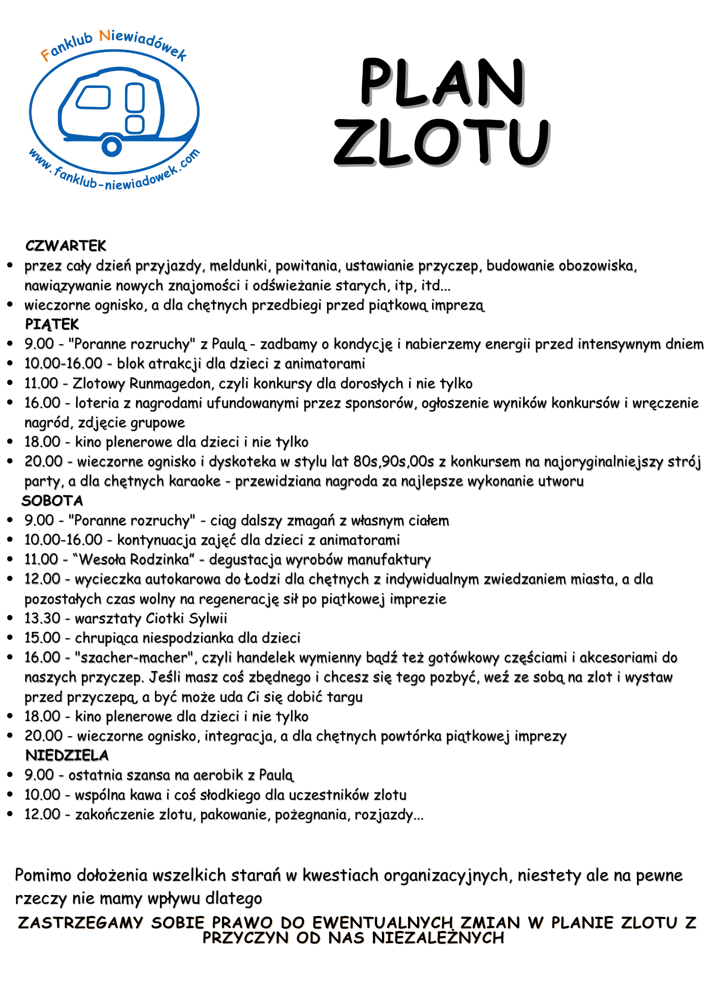 - uczestnictwo w zlocie oznacza akceptację Regulaminu Zlotów Fanklubu Niewiadówek
