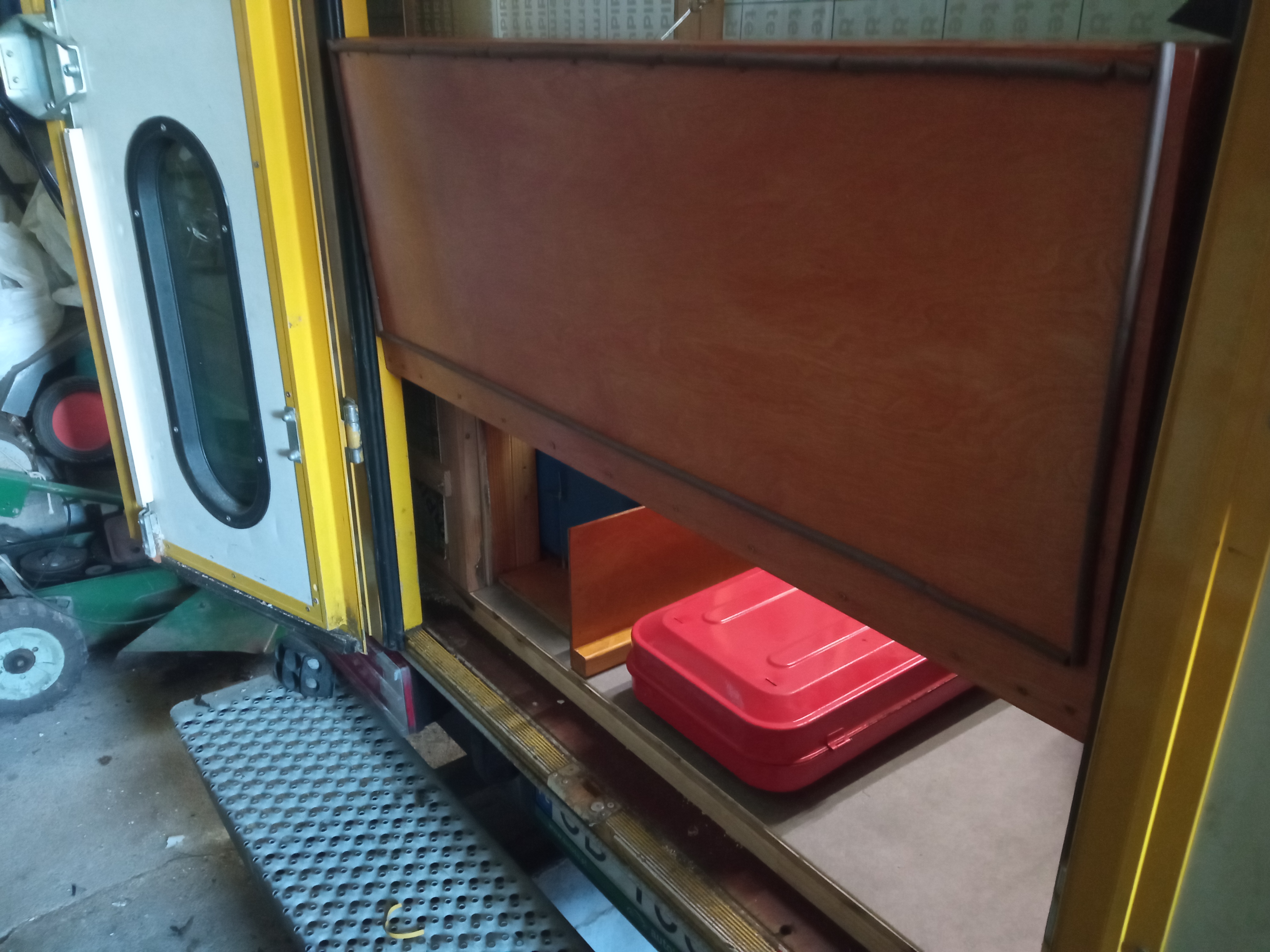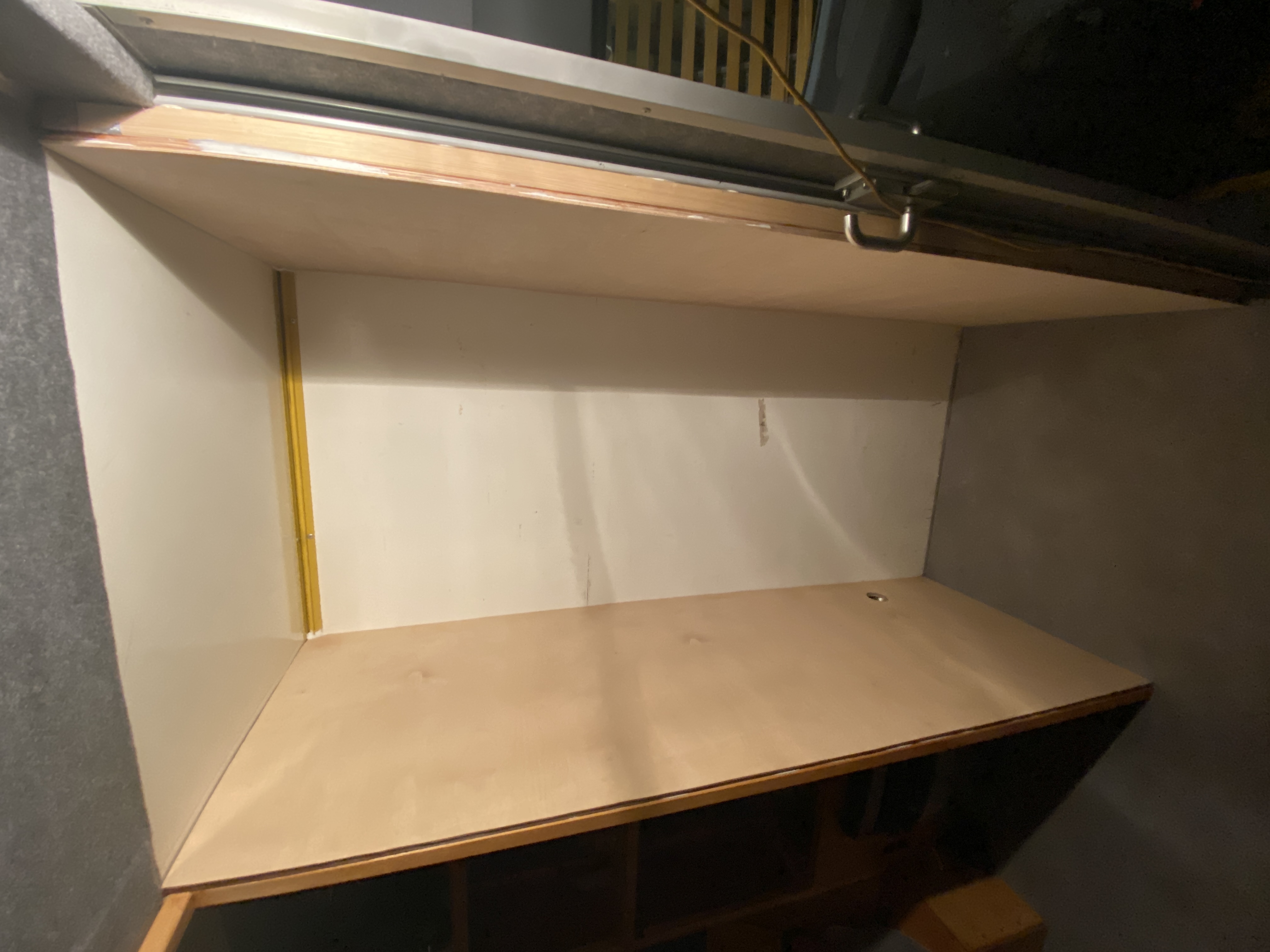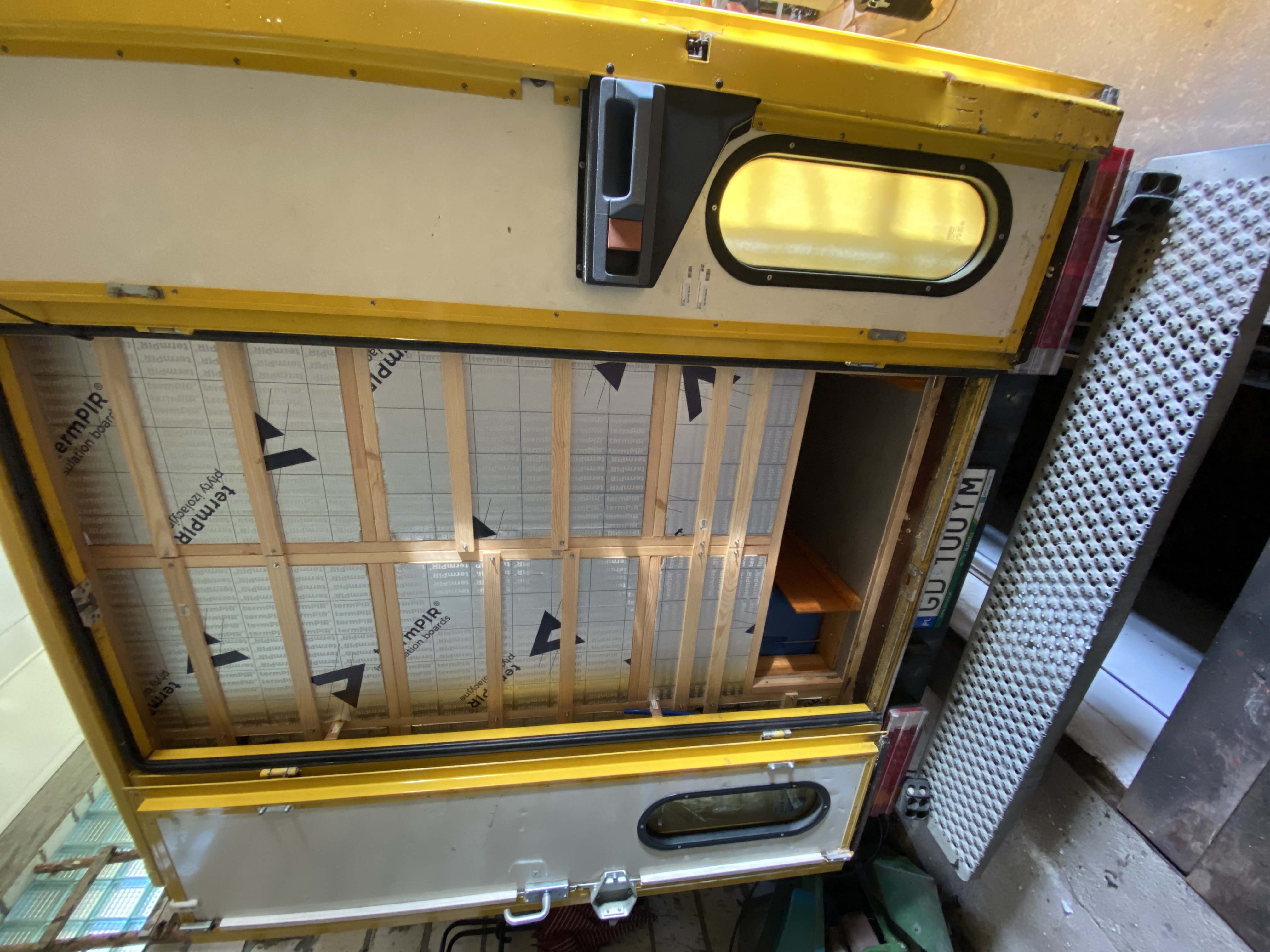 Widok z tyłu po otwarciu drzwi. Ściana do wykończenia, bo była budowana przy dostępie wyłącznie od strony wnętrza samochodu. Na ścianie zamierzam zrobić hak na przewód elektryczny.