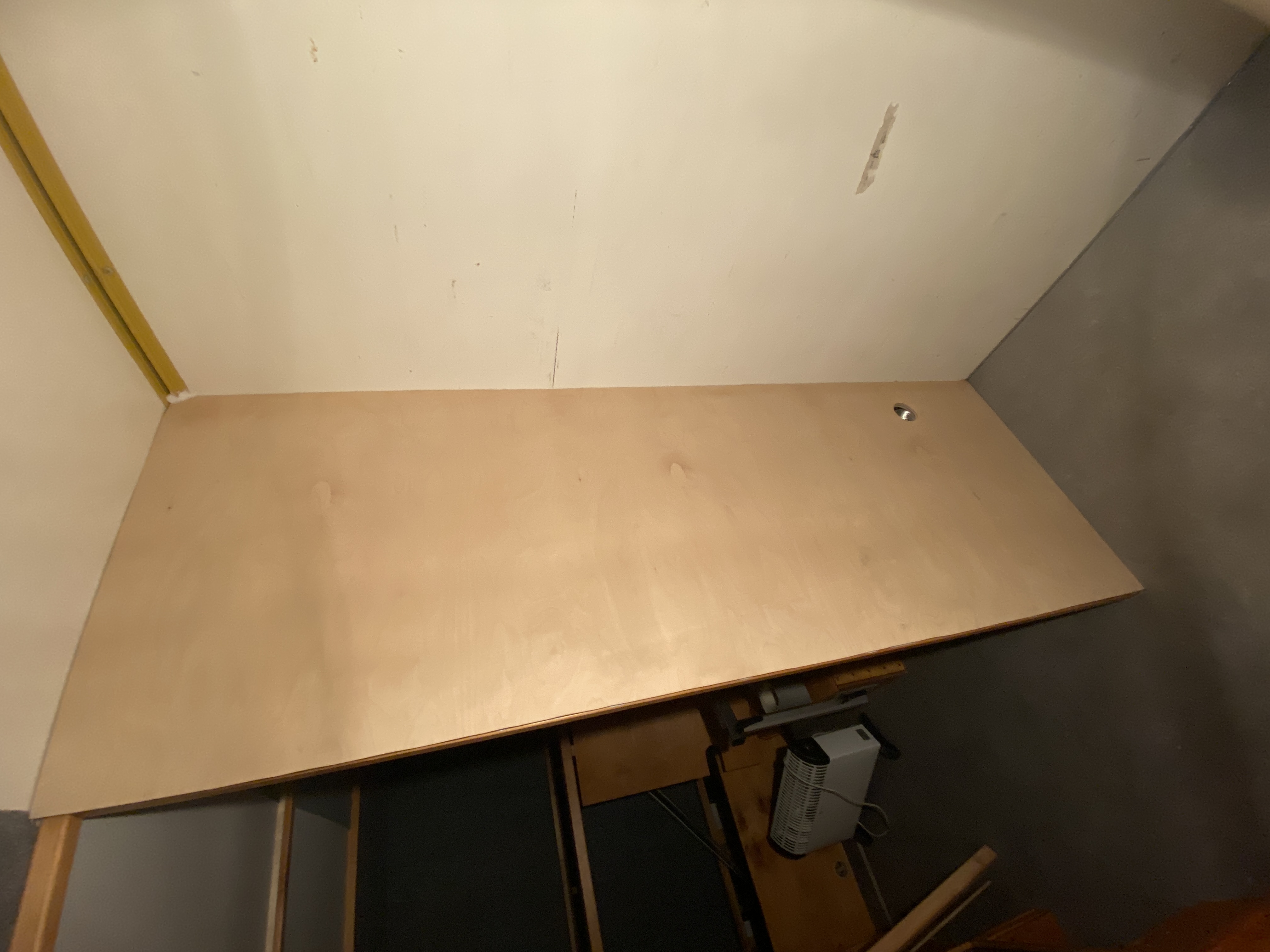 Następnym krokiem będzie ostatnia ściana łazienki. Tu też będzie częściowo montaż na wkręty, a częściowo klejenie, tak aby wewnątrz kabiny sklejka była jedną powierzchnią bez żadnych łączeń ani naruszeń ciągłości struktury wkrętami (brzmi uczenie ale wiadomo o co chodzi :) ) Sprawa nie będzie taka prosta, gdyż najchętniej zarówno od strony kabiny jak i części mieszkalnej nie chcialbym mieć widocznego stelaża, więc trzeba będzie zrobić sandwicha na szkielecie z kantówek, a może być z tym ciężko, bo chyba nieszczęsna klamka drzwi przesuwnych będzie kolidować z pogrubioną ścianą łazienki. Tak czy siak będę relacjonował co tam wymyśliłem :)