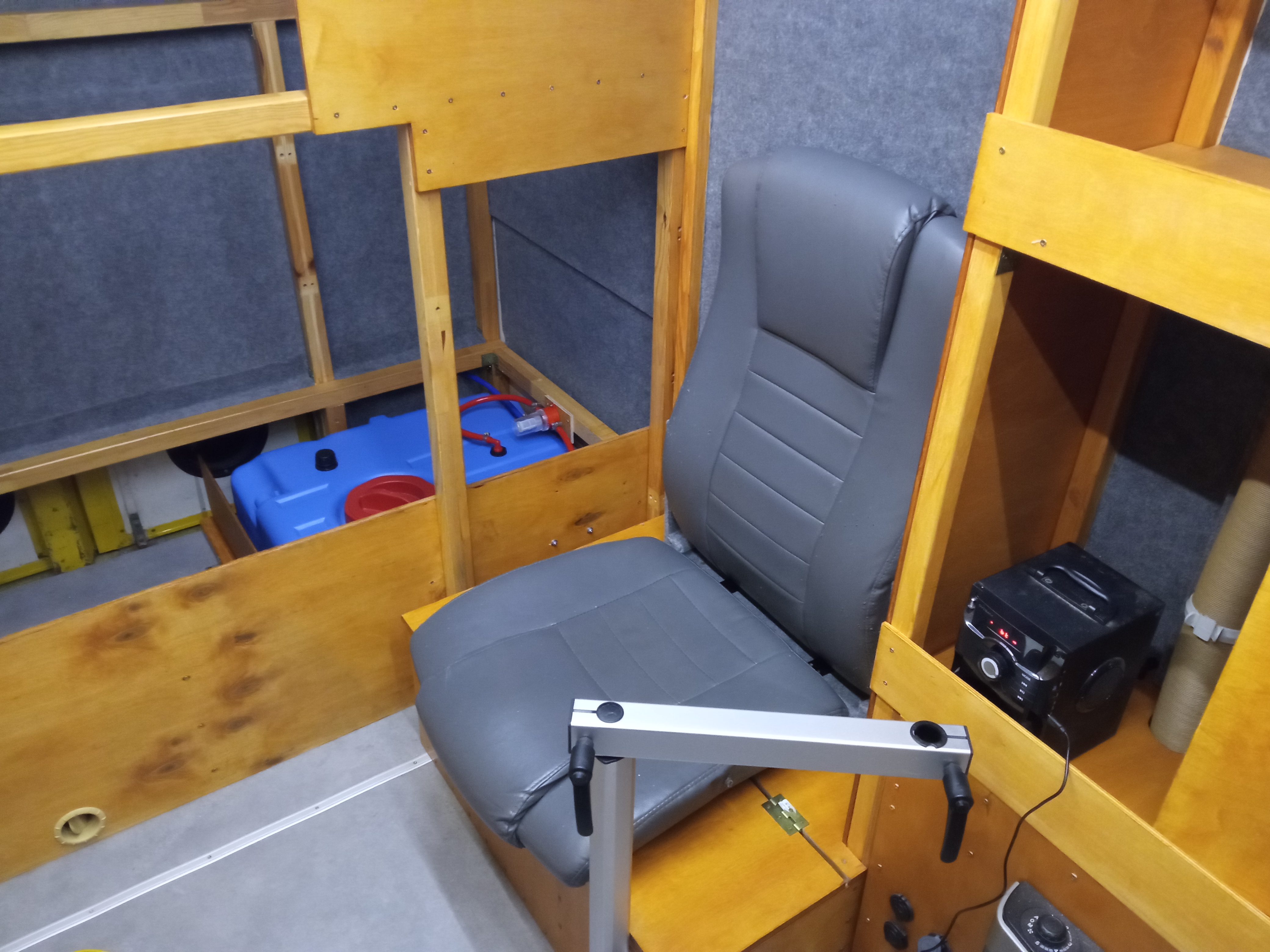 Krzesło komputerowe zaadaptowane na siedzisko :) Poddupek jest na zawiasach - można go unieść i nie blokuje dostępu do schowka w bakiście siedzenia. Dodatkowo powstał schowek za oparciem, oraz miejsce na przechowywanie zdemontowanego blatu między szafką trumy a siedzeniem.