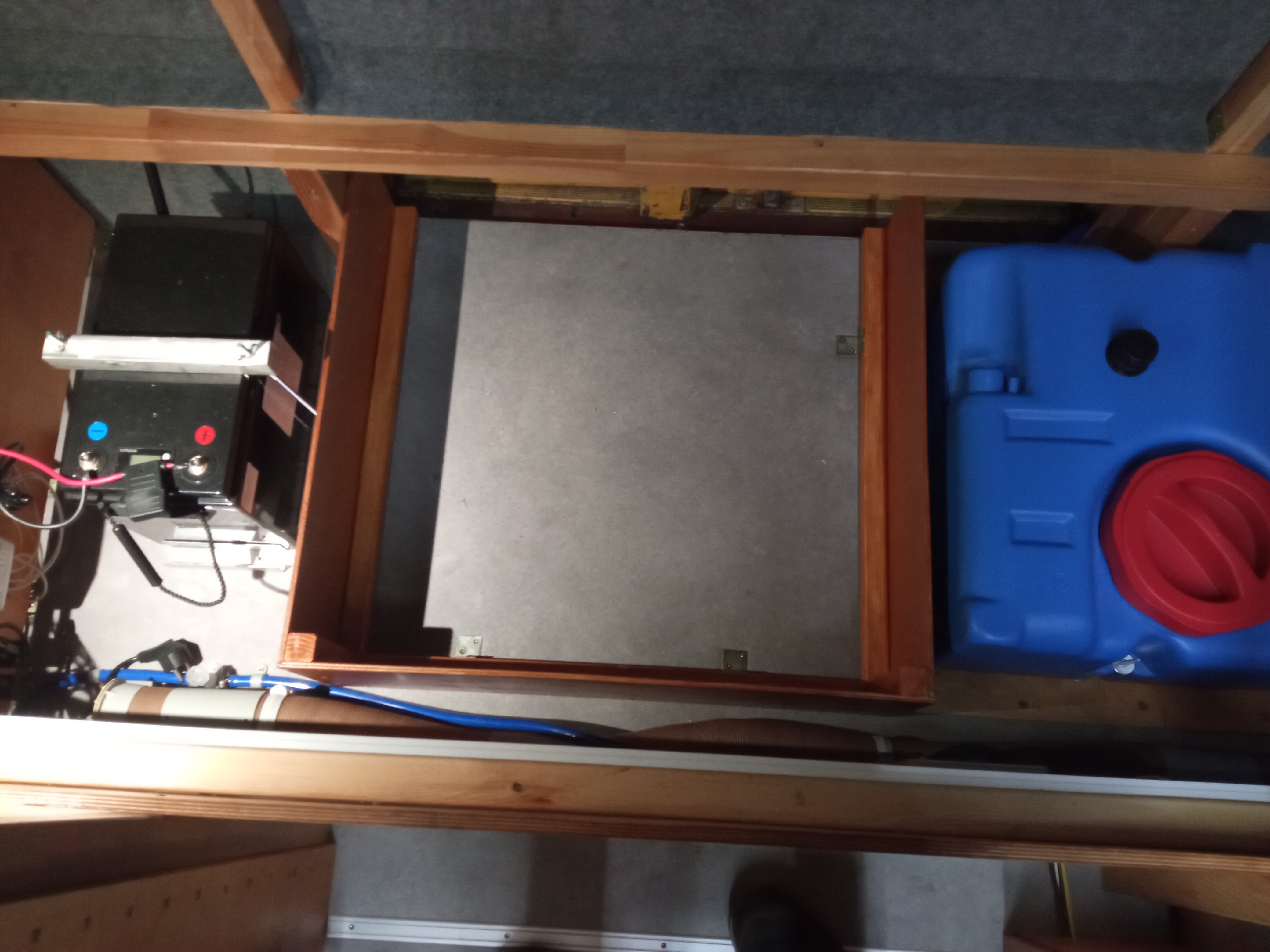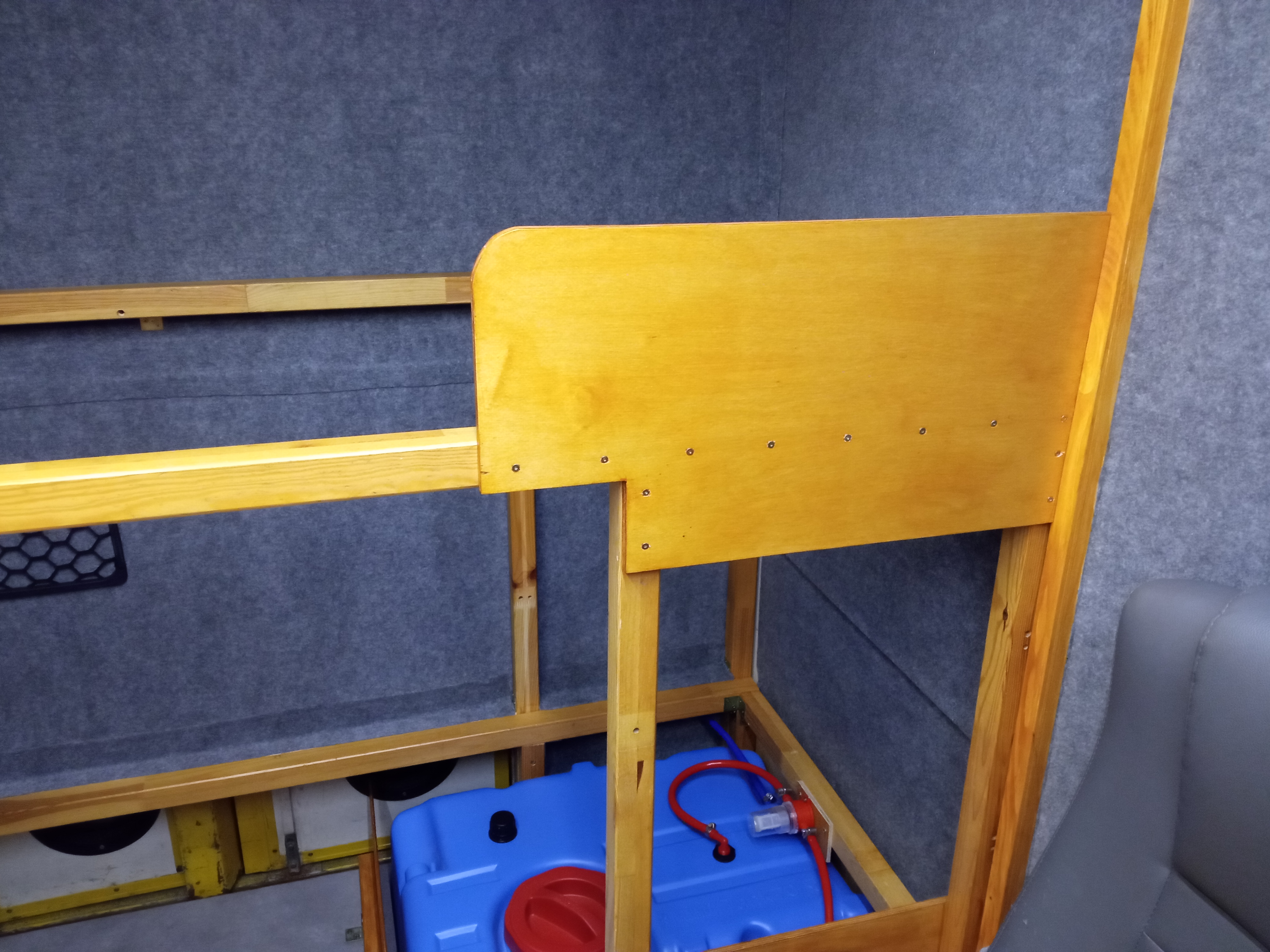 Zrobiliśmy także małą przeróbkę stelaża dolnego łóżka. Jest to typowy stelaż z listewkami poprzecznymi, a więc tak naprawdę ażurowa konstrukcja. Na odcinku około 50cm licząc "od głowy" od spodu zyskał on podłogę ze sklejki, aby odseparować obszar w bakiście przeznaczony na bezpieczniki/ładowarkę/akumulator od materaca oraz wszelkich szpar, którymi potencjalnie coś mogłoby wpaść do elektrowni od strony materaca (a wiadomo że niby nic nie powinno, ale masa pierdół powpada :) ).