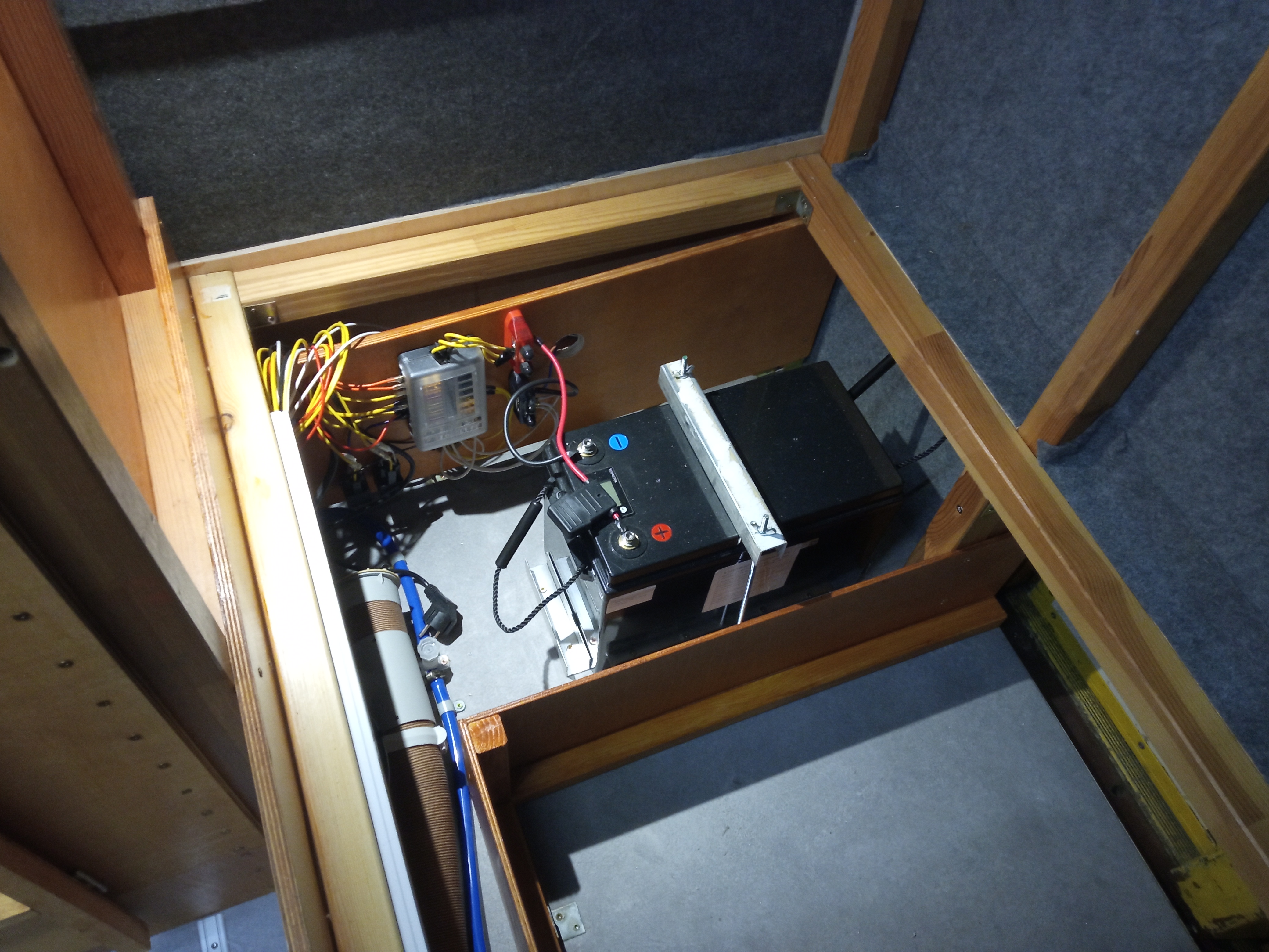 Elektrownia - dokładnie akumulator 200Ah, skrzynka bezpieczników, za pionową sklejką jest ładowarka sieciowa akumulatora. Jak dojdzie ładowarka DC-DC z aku, lub regulator MPPT, jest dla nich wystarczająco dużo miejsca na pionowej sklejce.