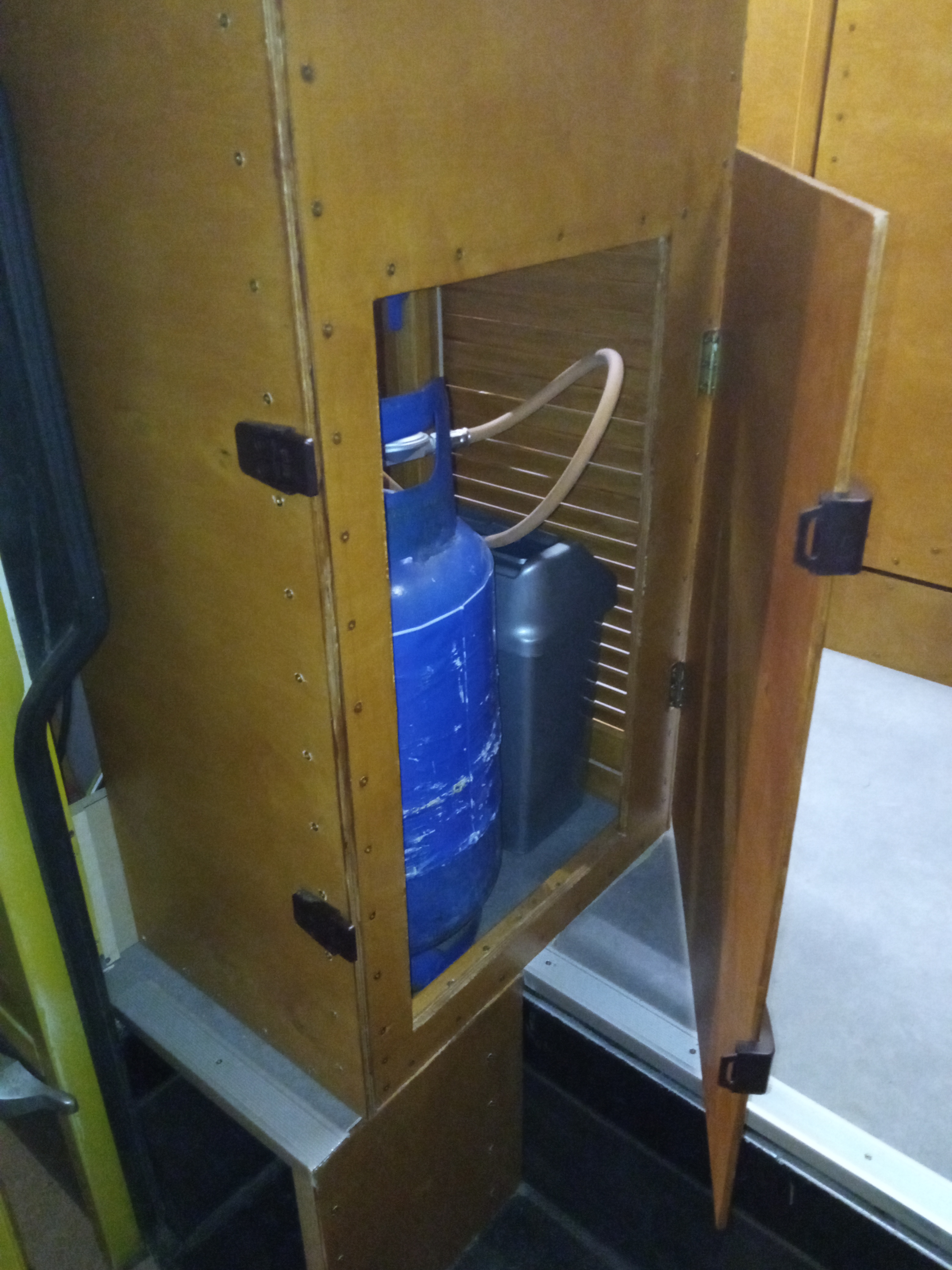 Co poza tym? Wpadły drzwiczki przez które będzie wyciągana butla z aneksu. Przy półkach nad Trumą dorobiłem barierki, dzięki którym graty przewożone na półkach nie wypadną w czasie jazdy. Muszę zabudować jakoś komin trumy żeby chronić go przed uszkodzeniami, mam na to pewien pomysł ale pochwalę się jak wyjdzie.