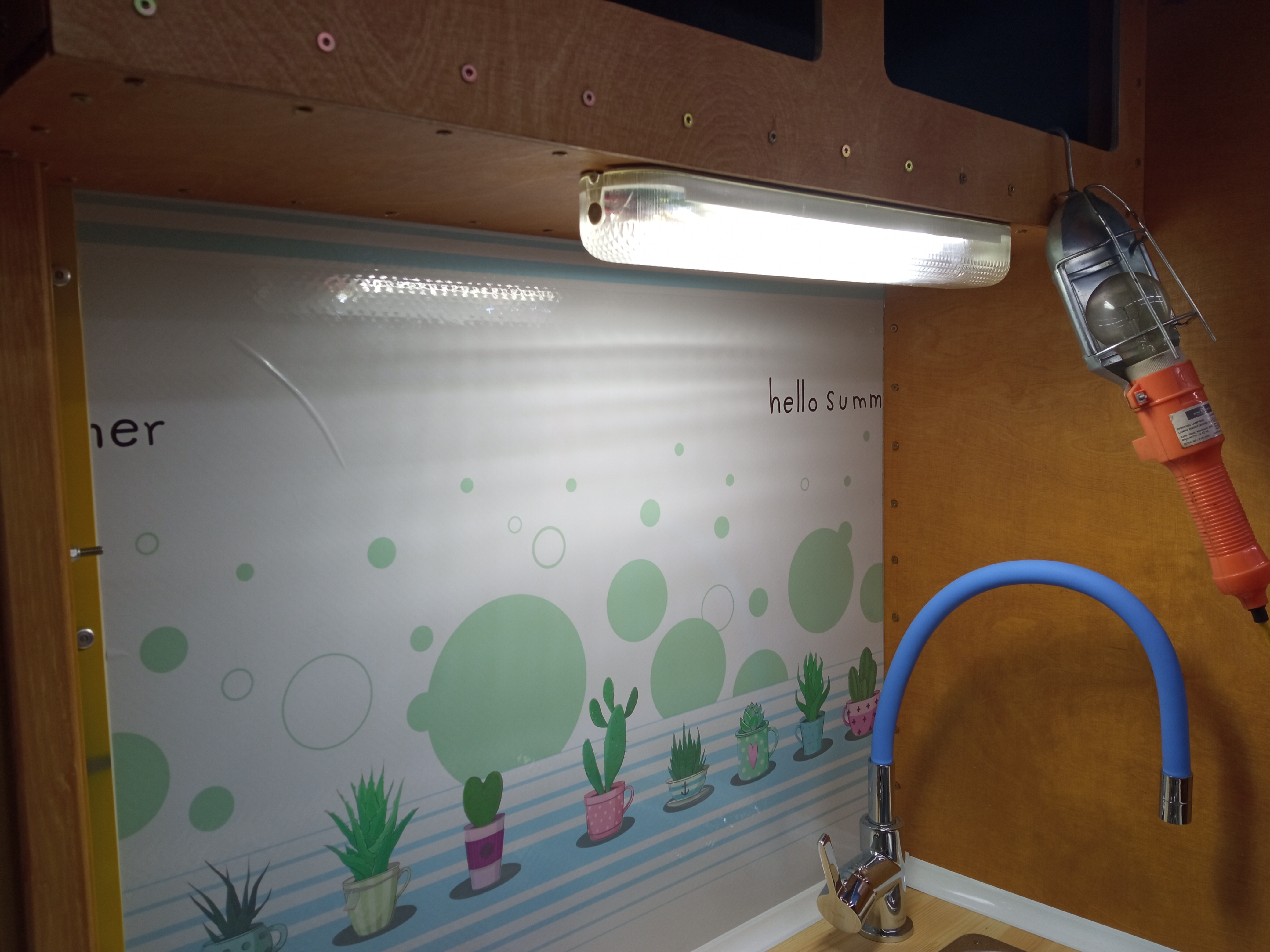Elektrycznie - mamy ledy na suficie włączane włącznikami schodowymi przy wejściu do auta, lub przy łóżkach - włącznik na szafie. Oprócz tego - lampa nad aneksem kuchennym i w łazience. Wykorzystałem oryginalne oprawy które były w samochodzie, tylko wywaliłem wsad od jarzeniówek i wkleiłem taśmę led. Bardzo fajnie świecą, a do tego jest jakiś element oryginalności auta. Przy obydwu łóżkach zamontowane są kinkieciki Dometica, żeby można było w nocy poczytać i nie oświetlać całego samochodu.