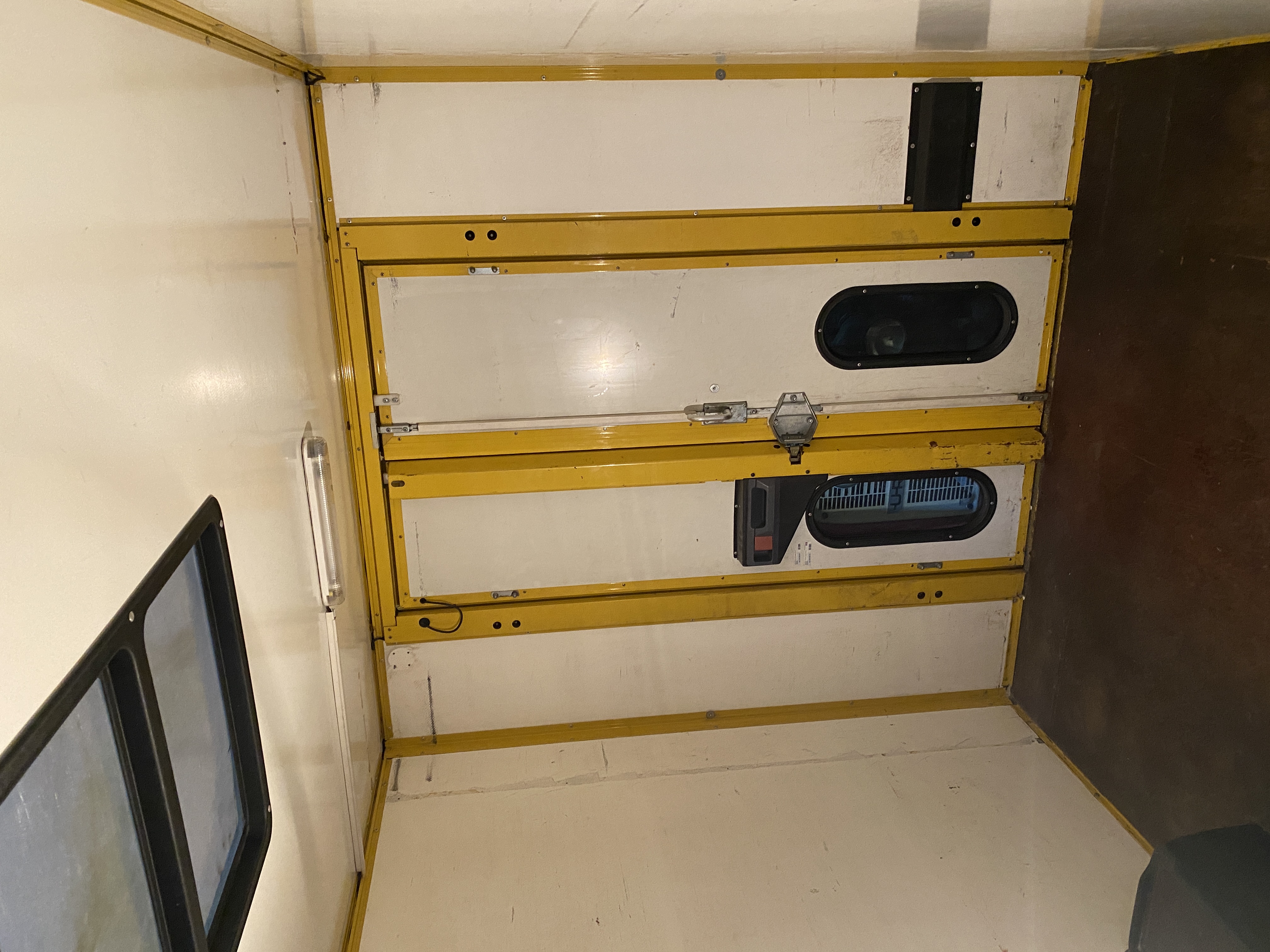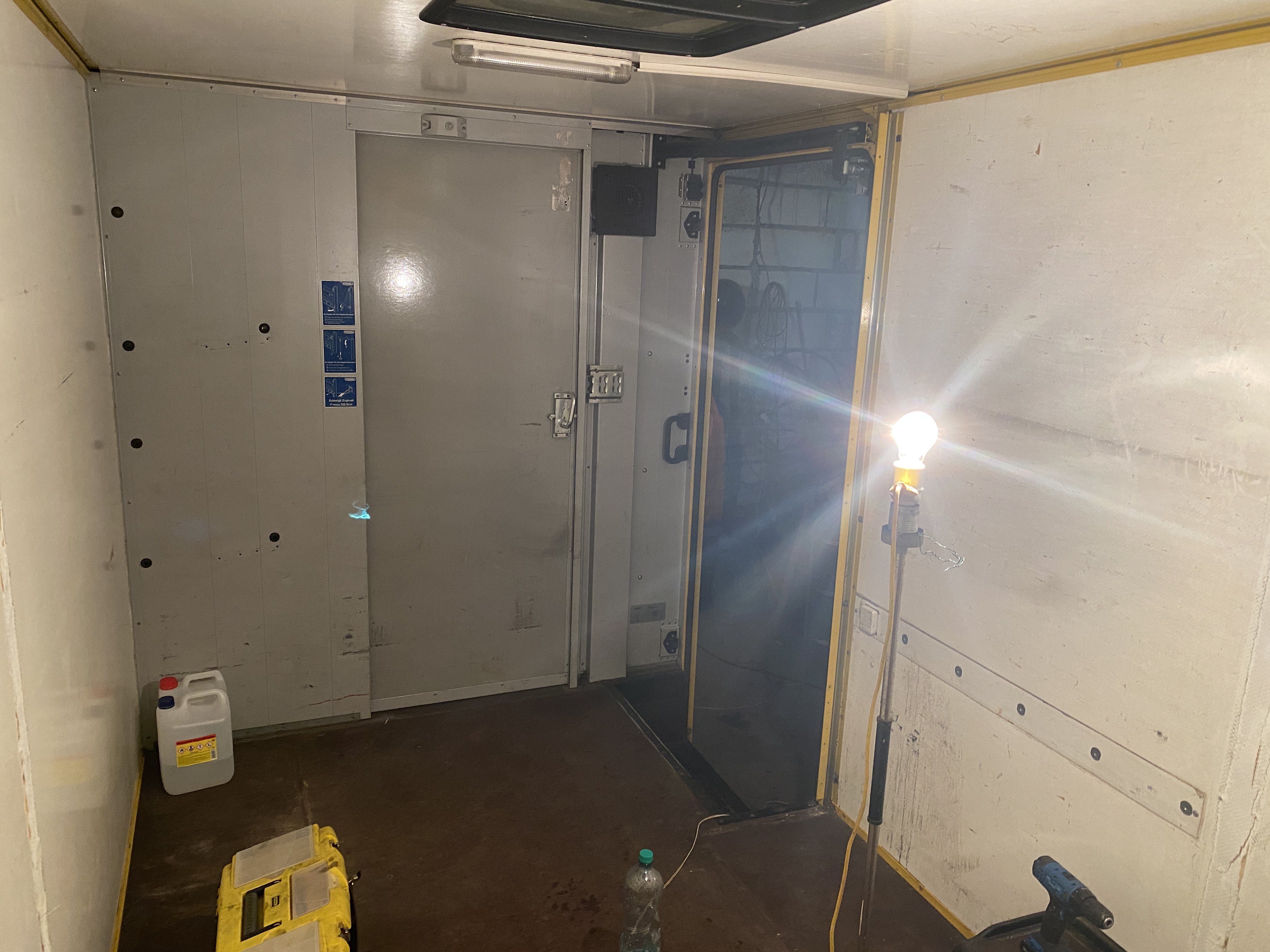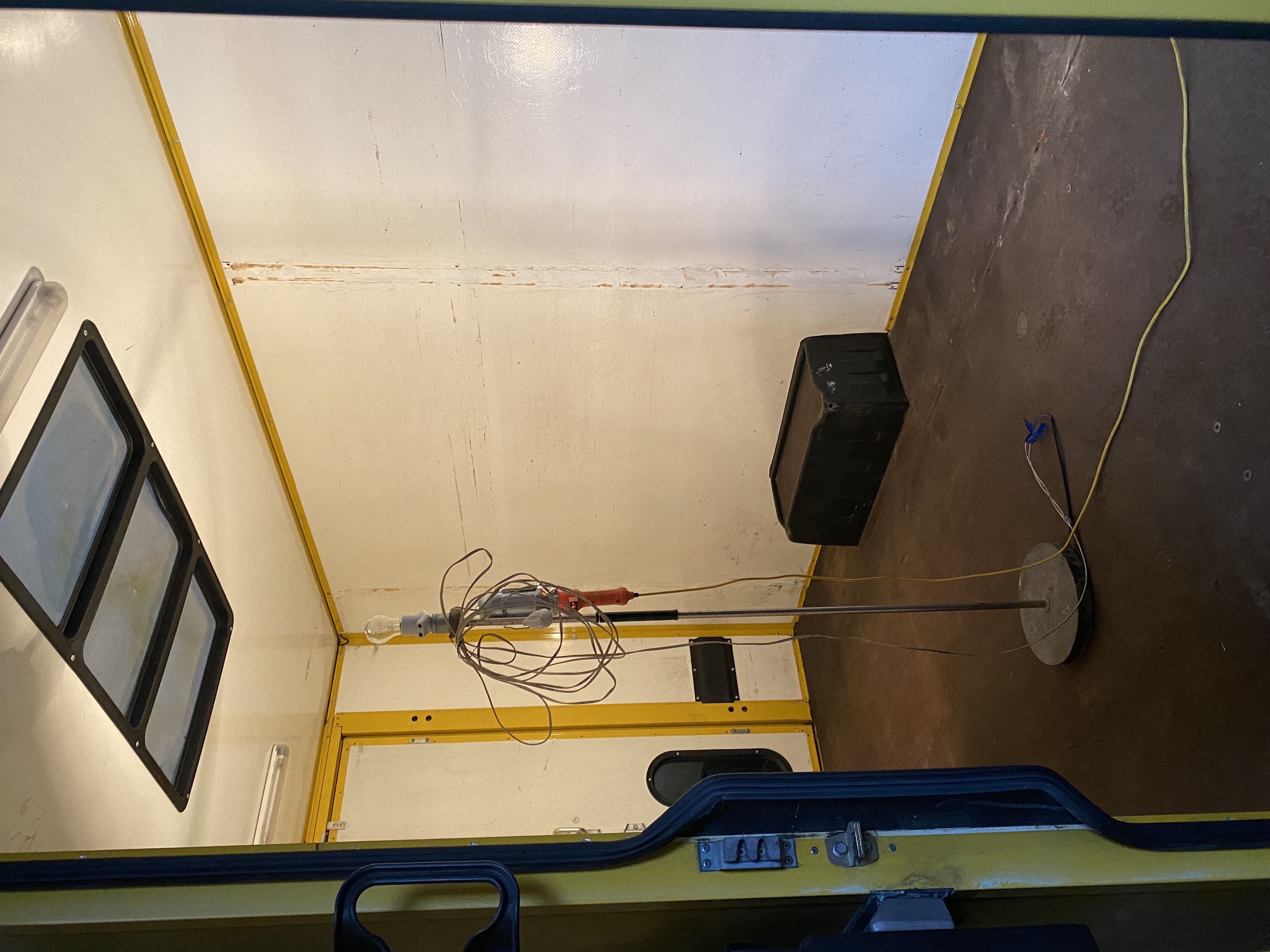 Drugim elementem są lampy sufitowe, które na przedstawianych zdjęciach nie są jeszcze zdemontowane. Są to oryginalne lampy Hella, niestety jeszcze świetlówkowe. Chciałbym je jednak zachować, jako oryginalny element samochodu - dlatego też ze środka wywaliłem świetlówkę, i wkleiłem taśmę led dającą światło około 700 lumenów. Jedna taka lampa powędróje do łazienki, druga może zostanie użyta jako oświetlenie aneksu kuchennego.