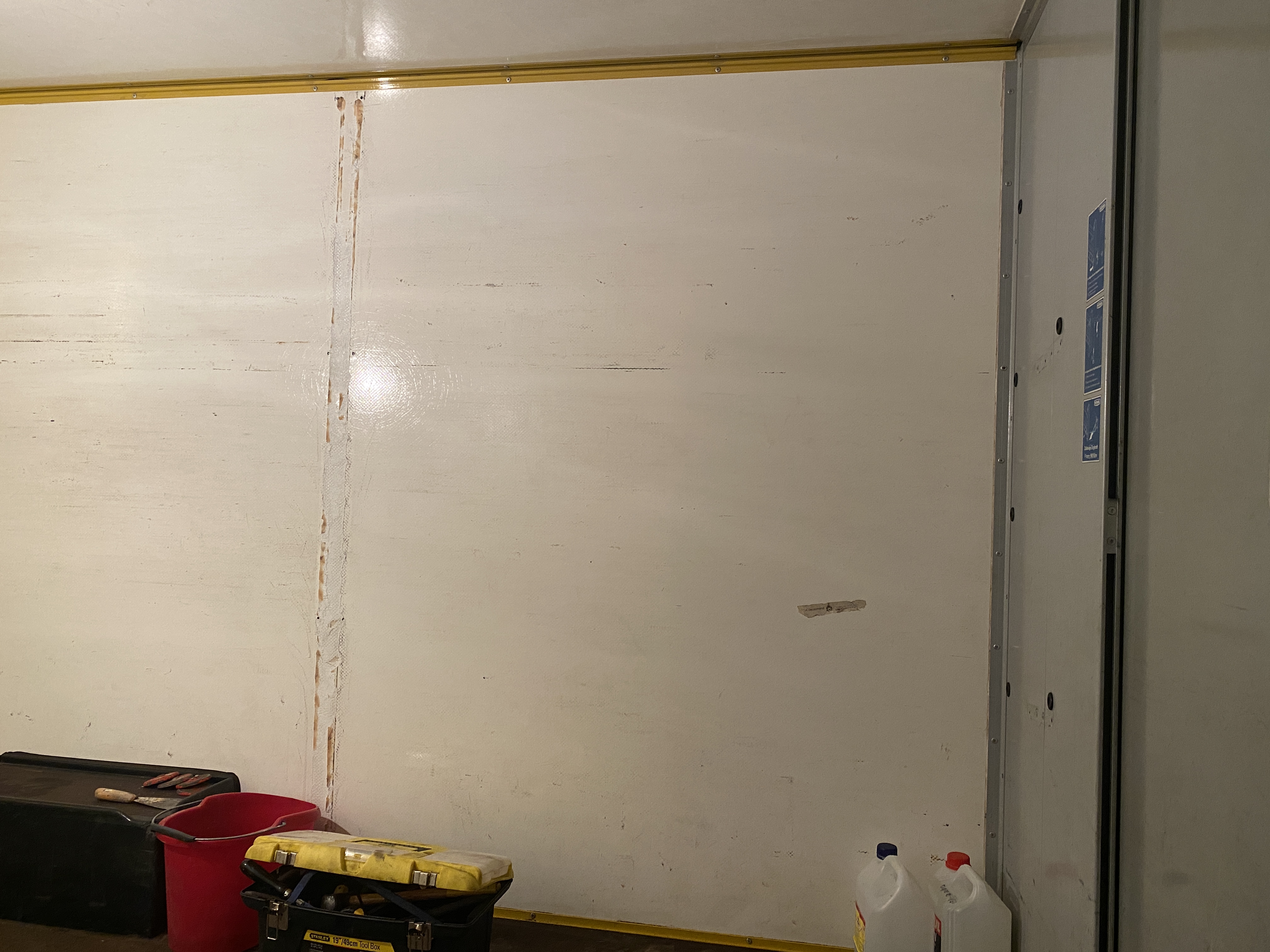 Tylna ściana powinna być dość solidna, gdyż korzystając z tego, że z tyłu kontenera znajdują się elementy aluminiowe (ościeżnica drzwi, profile po boku kontenera), przymocowałem stelaż ściany do tych elementach nitami, z użyciem kątowników. Dodatkowo, elementy stykające się ze ścianami kontenera przykleiłem mamutem.