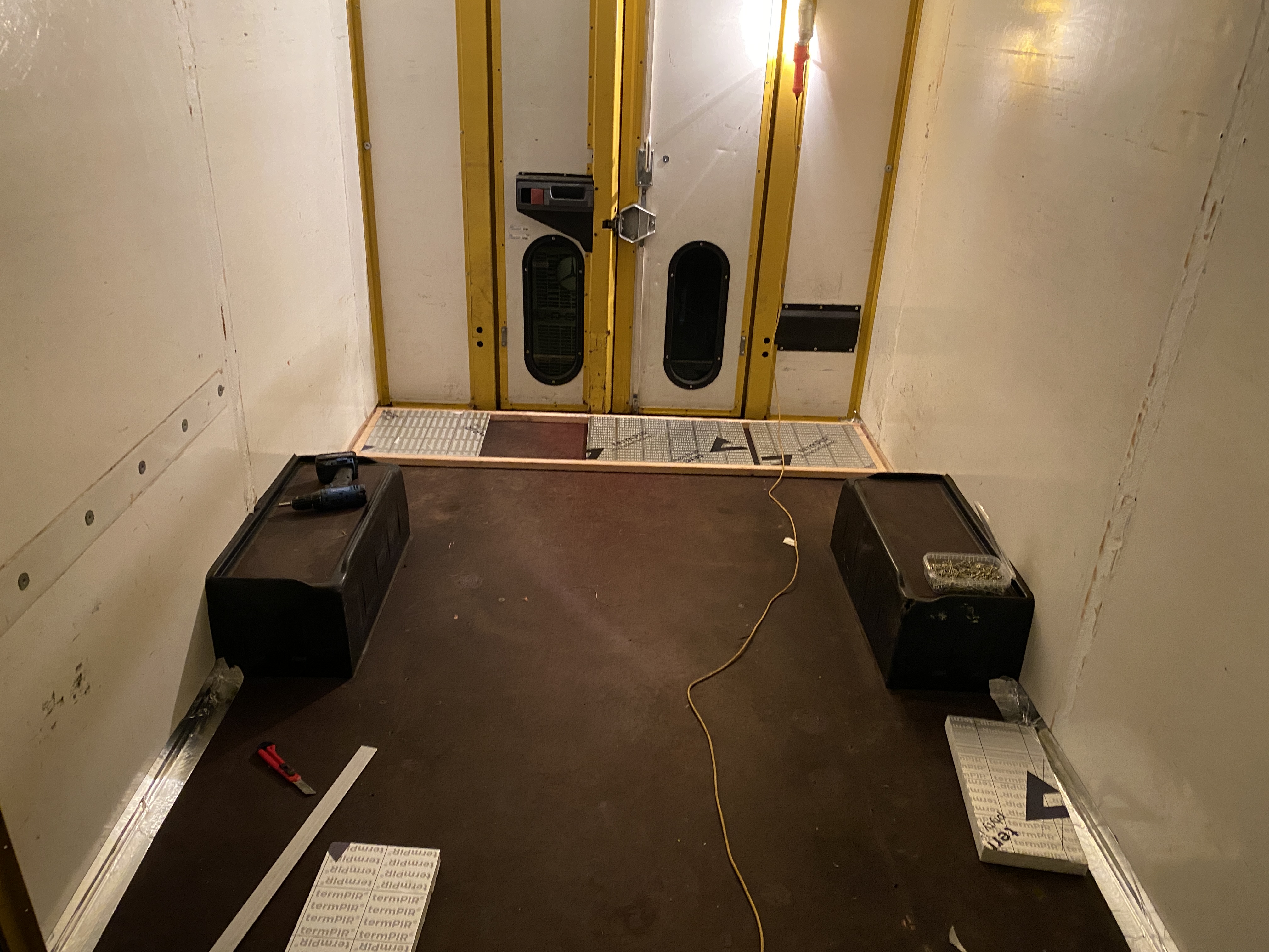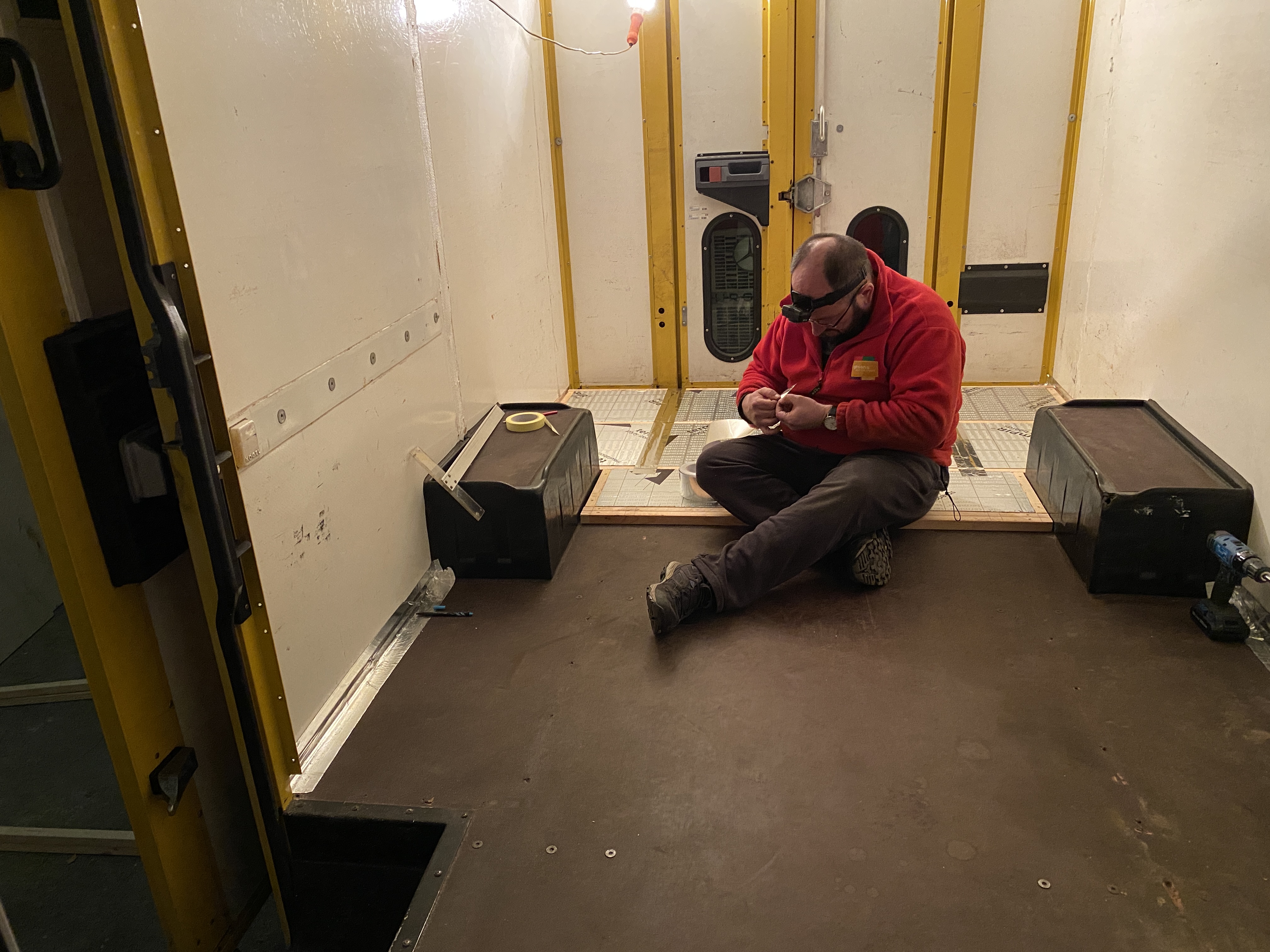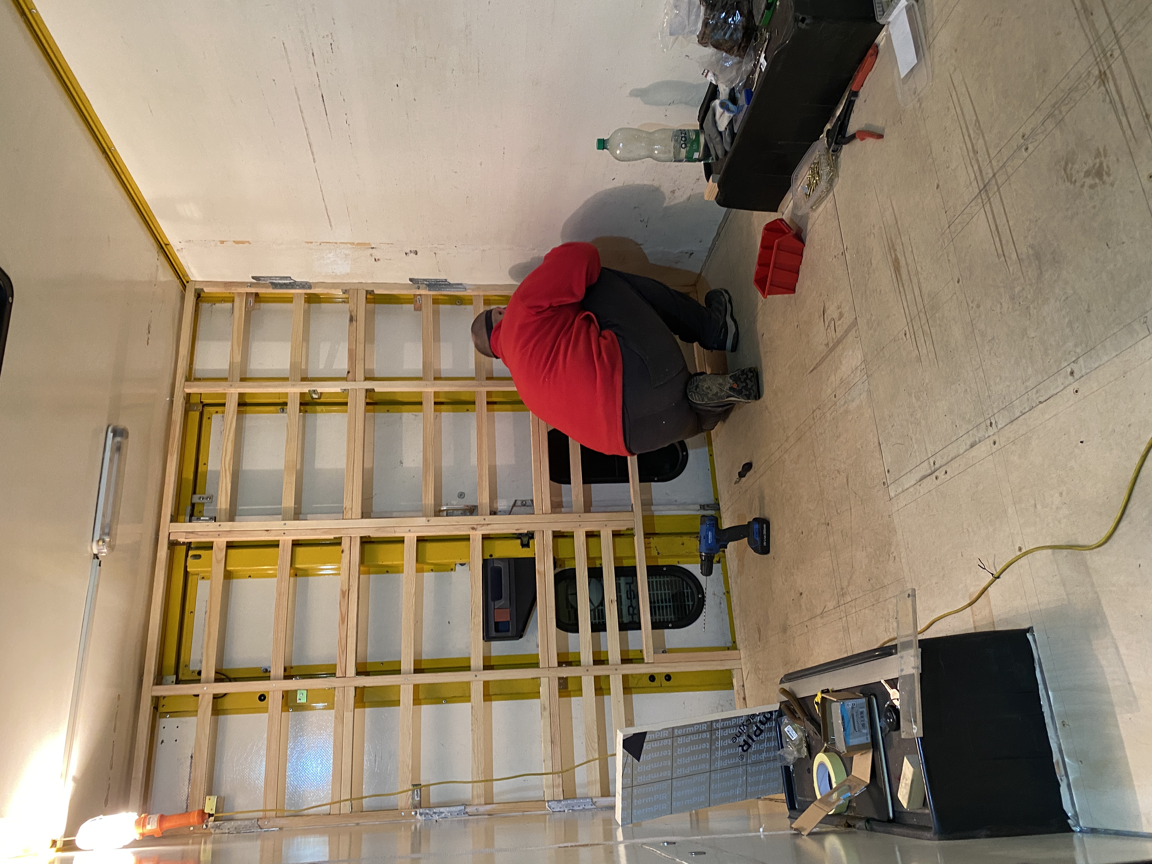 Oczywiście - podłoga. Założenie jest takie, że chcemy móc okazjonalnie użytkować auto w zimie, wczesną wiosną czy późną jesienią. Tak więc, podłoga musi zostać zaizolowana. Fabryczna sklejka o grubości 25 mm jest pancerna, i tak jak wcześniej wspomniałem w doskonałej kondycji, ale nie daje izolacji termicznej. Tutaj nie odkrywałem Ameryki na nowo, postąpiłem wg schematu popularnego przy zabudowywaniu campervanów - na fabryczną podgłogę układamy legary , przestrzeń między legarami wypełniamy izolacją, na to idzie sklejka.