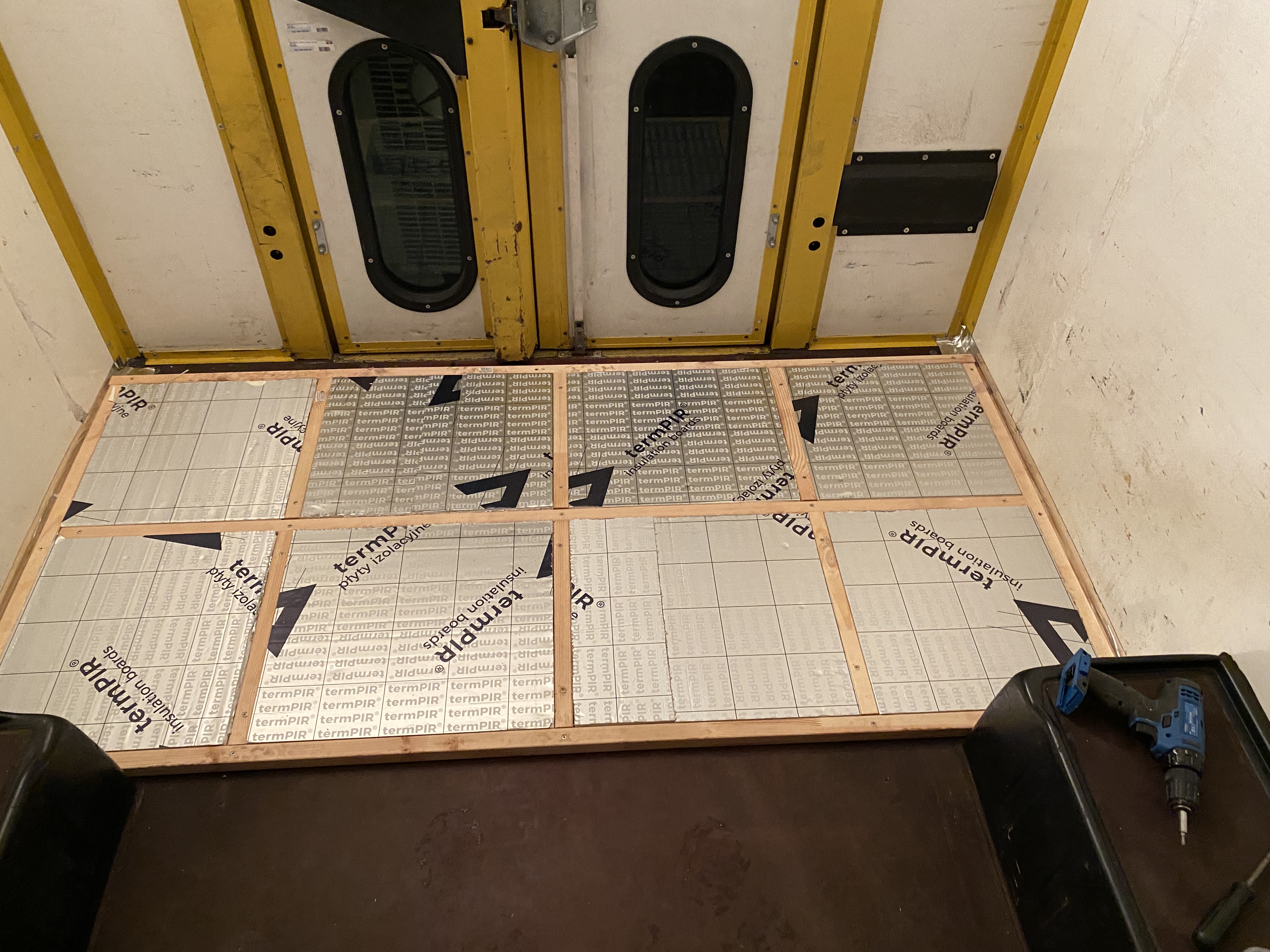 - oklejałem od góry legary oraz brzegi płyty PIR taśmą aluminiową do izolacji układów wentylacji/klimatyzacji - tu zmałpowałem sposób postępowania innych kampermajstrów, nie wiem czy to jest niezbędne, ale w sumie wszyscy tak robią, i ja też tak robiłem w niewiadówce :)