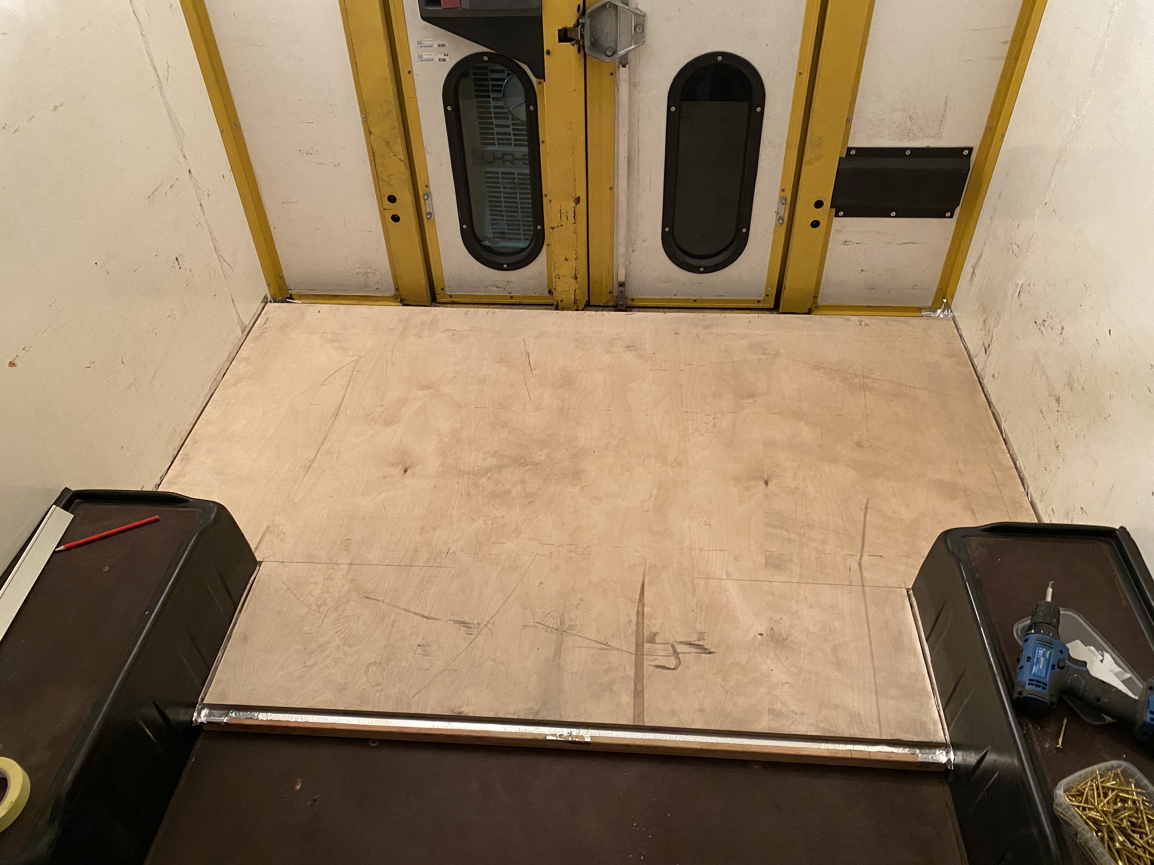 Tylne drzwi zostaną zaślepione, poprzez postawienie nowej ściany jak najbliżej drzwi, jednak żeby nie trzeba było demontować zamka itd. - tamtędy będzie dostęp od zewnątrz do bakisty pod łóżkiem, w tym do tankowania czystej wody. Nie planuję wyprowadzać wlewu wody na ścianę kampera, jedynie dorobić korek u góry zbiornika, żeby można było tam dojść z wężem i tyle. Zobaczymy jak się takie rozwiązanie sprawdzi, jeśli będzie niewygodnie to pomyślimy nad czymś innym.