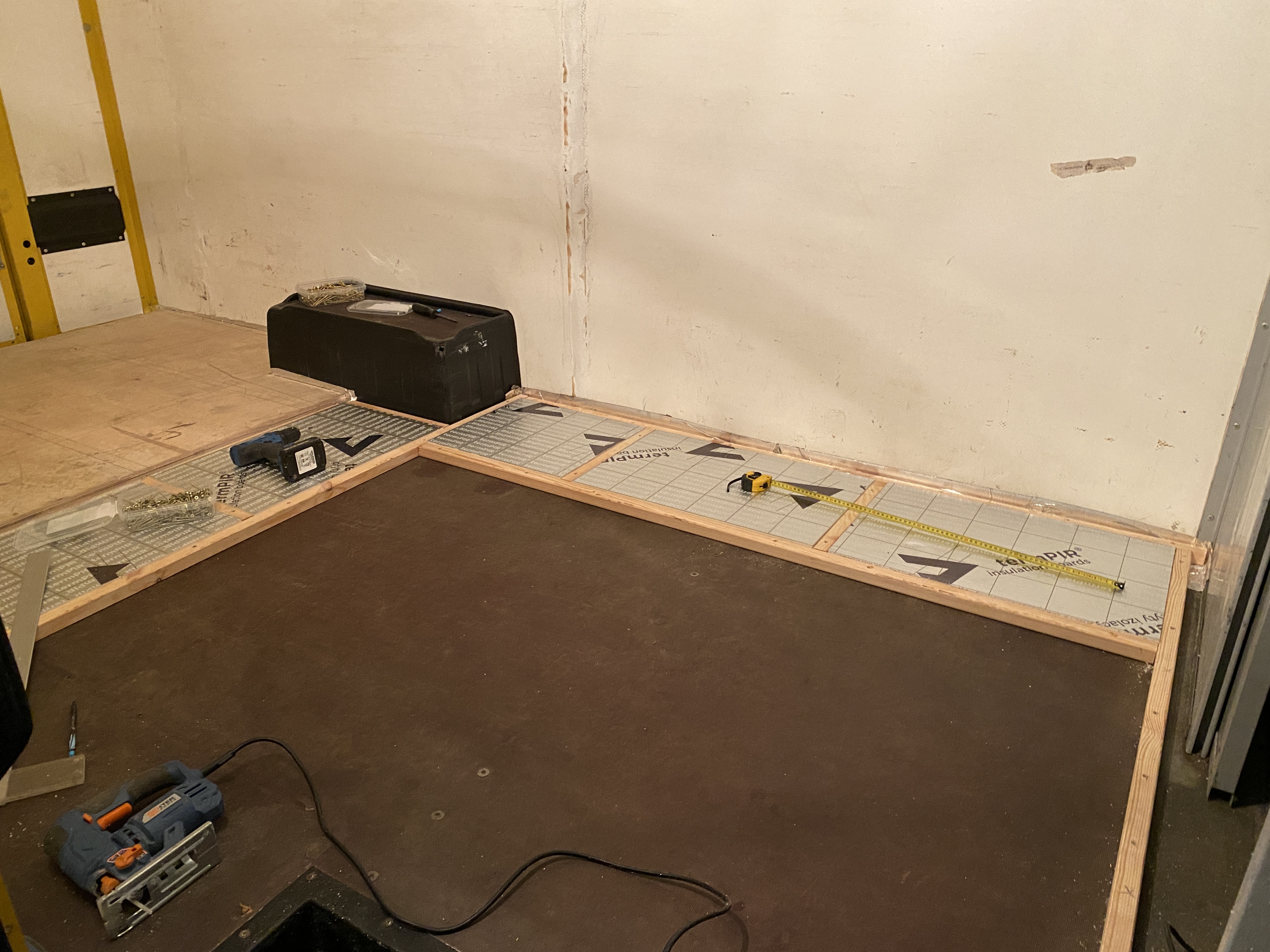 - dalej, dzielimy przestrzeń podłogi na rozsądne obszary tak, aby nie było bardzo długi odcinków na których płyta PIR jest mocno dociążana przez zabudowę a nie ma podparcia legarów - ten krok przyznam się szczerze wychodził w praniu :)