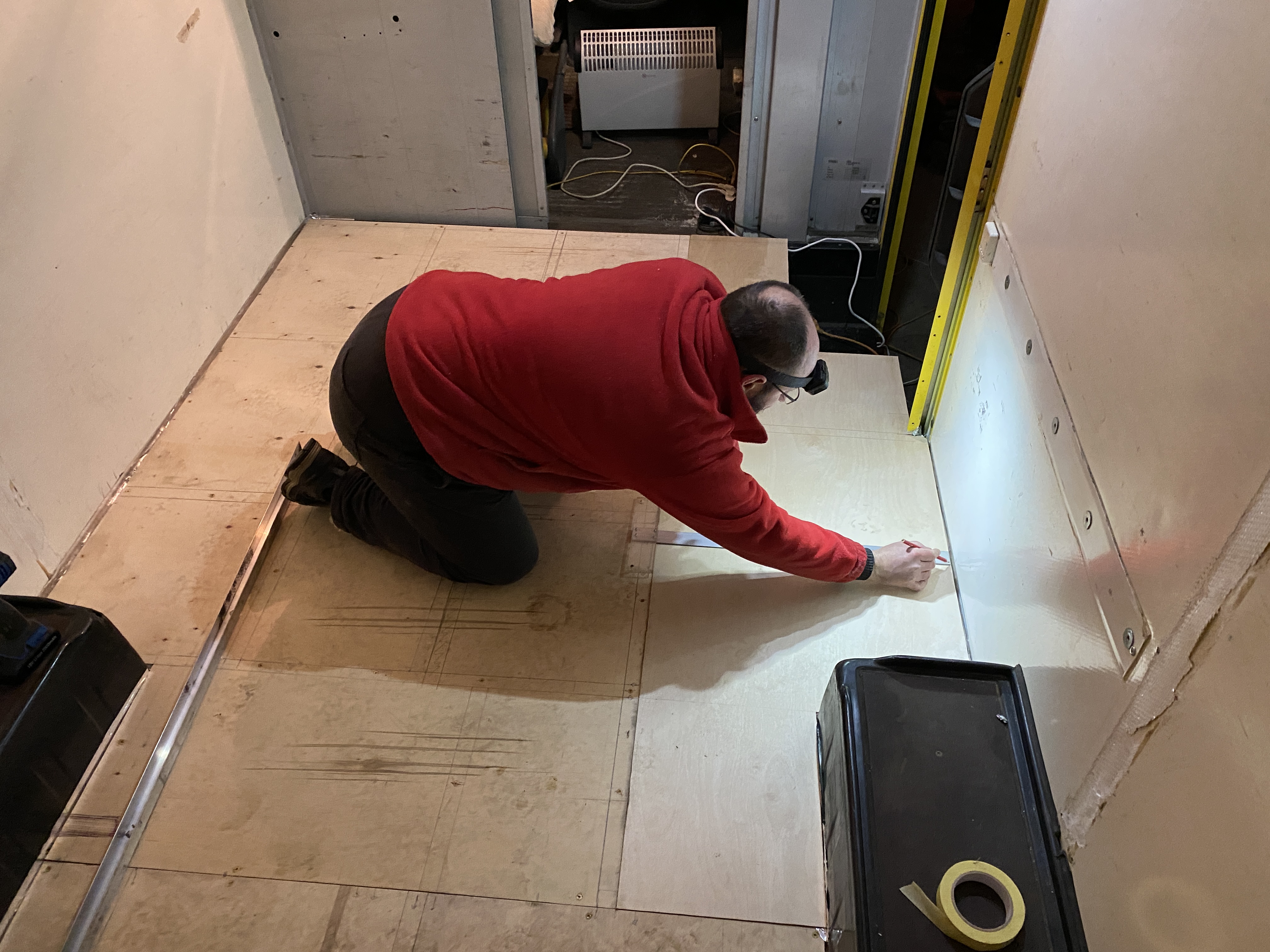 Jeśli chodzi o wykonanie, to trzeba zacząć od tego, żeby przestrzeń podłogi podzielić tak, aby sensownie wykorzystać arkusze sklejki, minimalizując odpad. U mnie na podłogę poszły 3 arkusze 250x125, oczywiście ze sporym odpadem (wykorzystanym potem, więc nie ma znaczących strat).