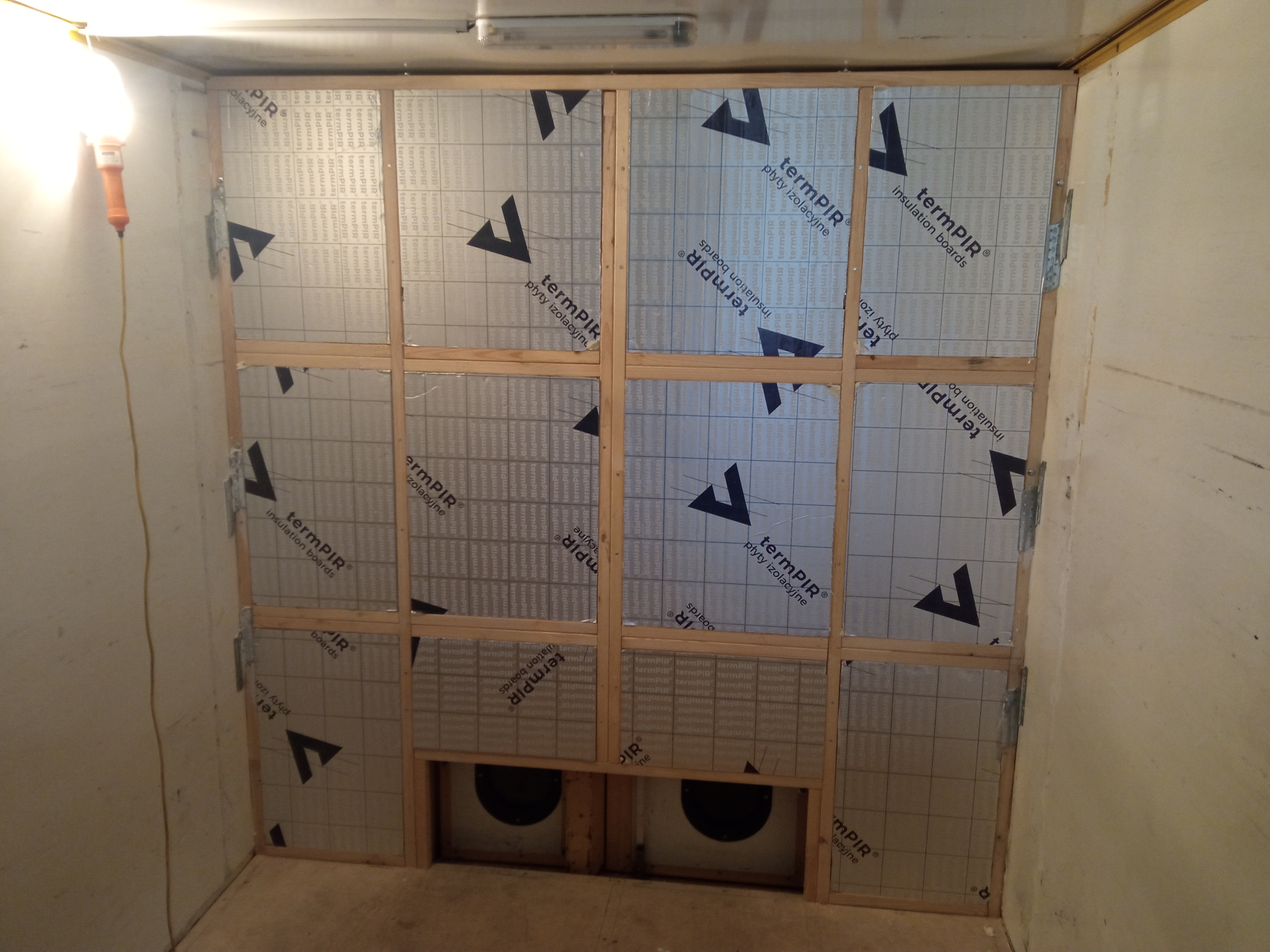 Kolejnym etapem po podłodze było postawienie tylnej ściany. Było trochę rzeźbienia, ale ogólnie poszło dość prosto - zrobiony stelaż z kantówek, w przestrzenie między kantówkami wepchnięte płyty PIR. Od środka położona na całej ścianie sklejka, od zewnątrz (czyli od strony tyłu auta) nie miałem jak dostać się ze sklejką, więc zrobiona została ażurowa krata z płaskich listewek, tak aby wepchnięte płyty PIR o nie opierały. Niestety, dopóki auto nie wyjedzie, od strony drzwi ściana nie będzie wykończona. Poczeka do wiosny :)