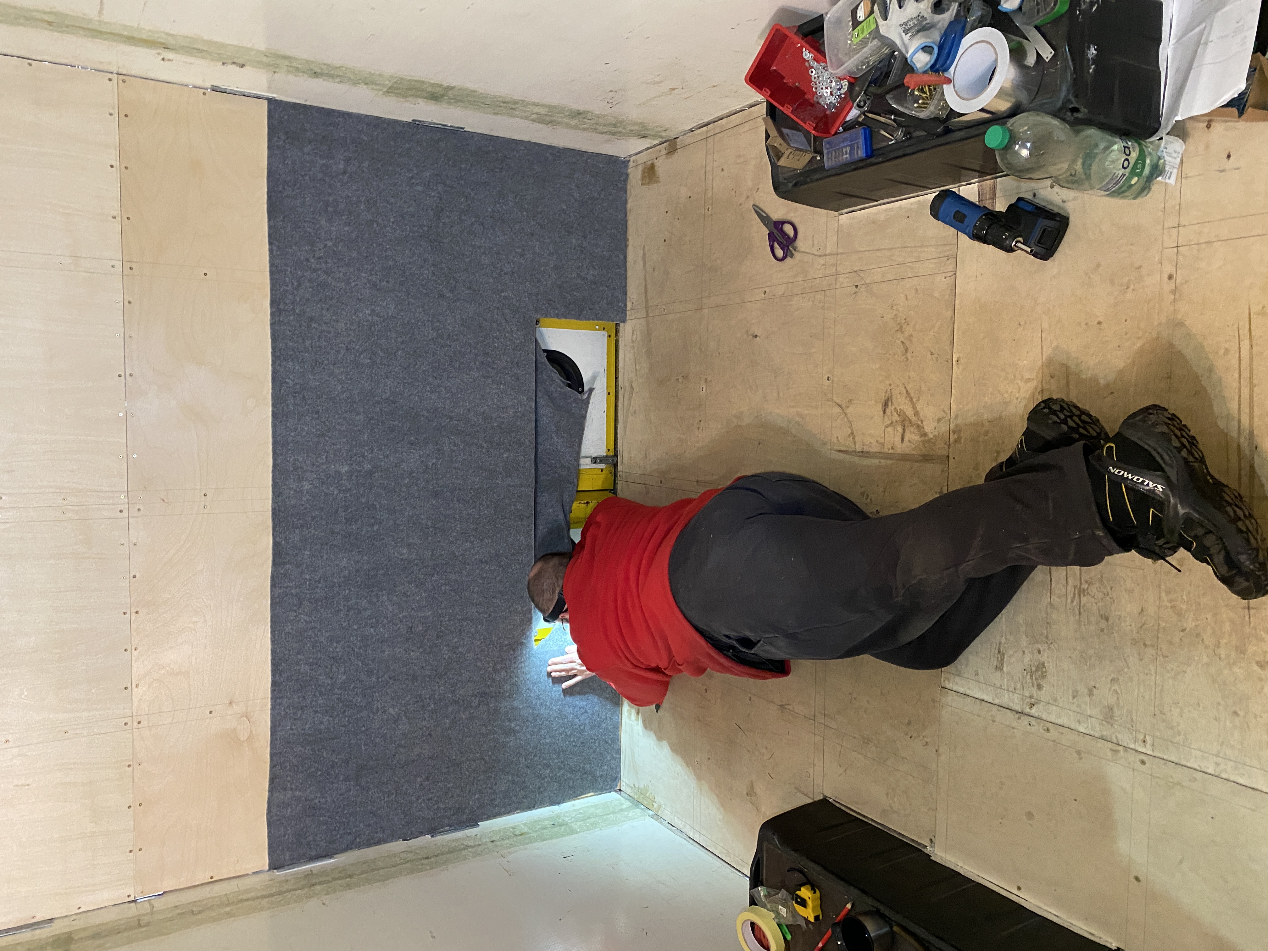 Ścianę wykleiłem filcem STP, któremu teraz poświęcę parę słów, bo może być interesujący dla przyczepkowo-kamperowych majstrów. Można w uproszczeniu powiedzieć, że to troszkę odpowiednik znanej nam remontówki, przy czym jest to faktycznie typowo motoryzacyjny filc, jaki znamy z okładzin bagażników, ścian busów, autobusów etc.