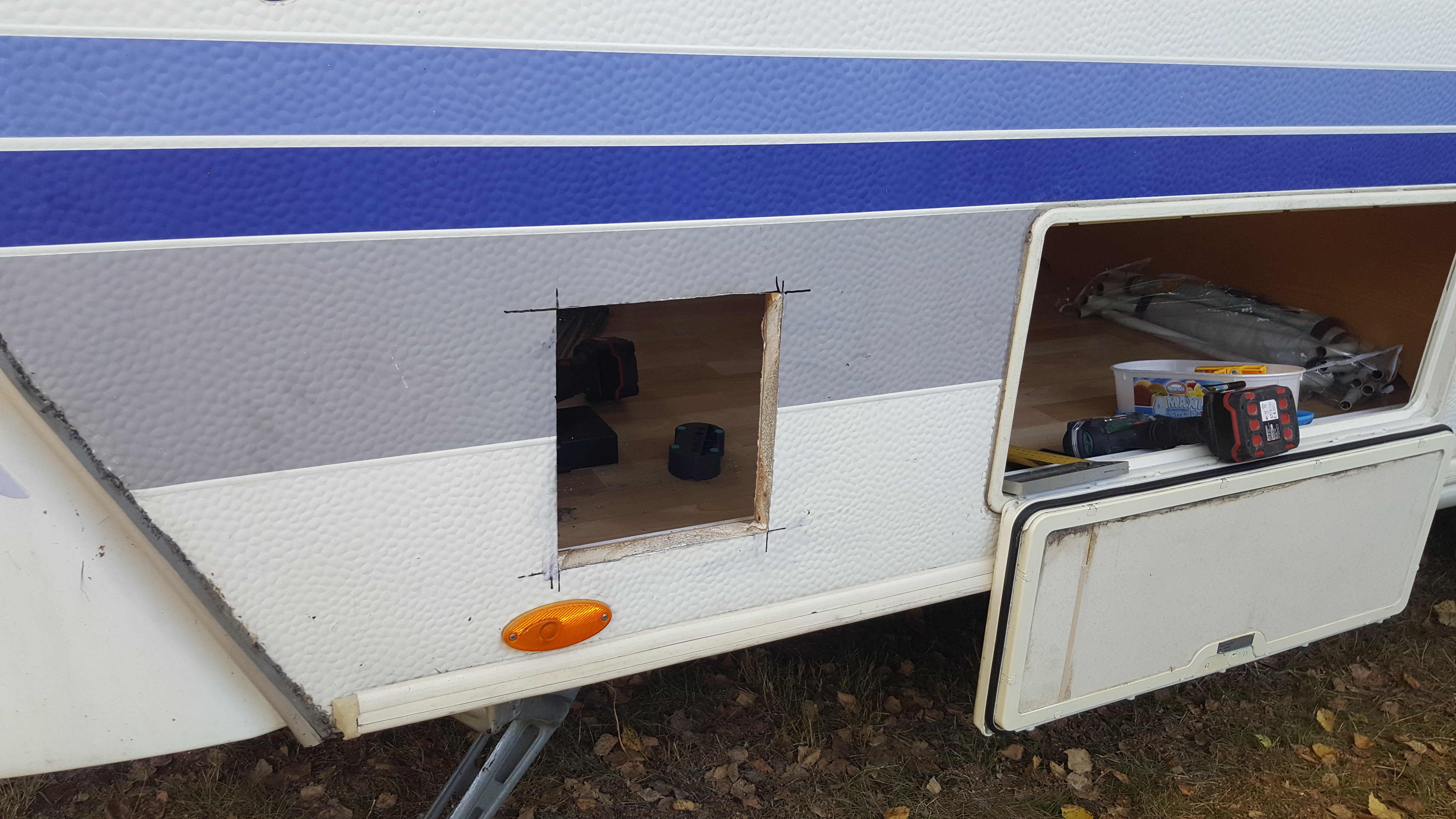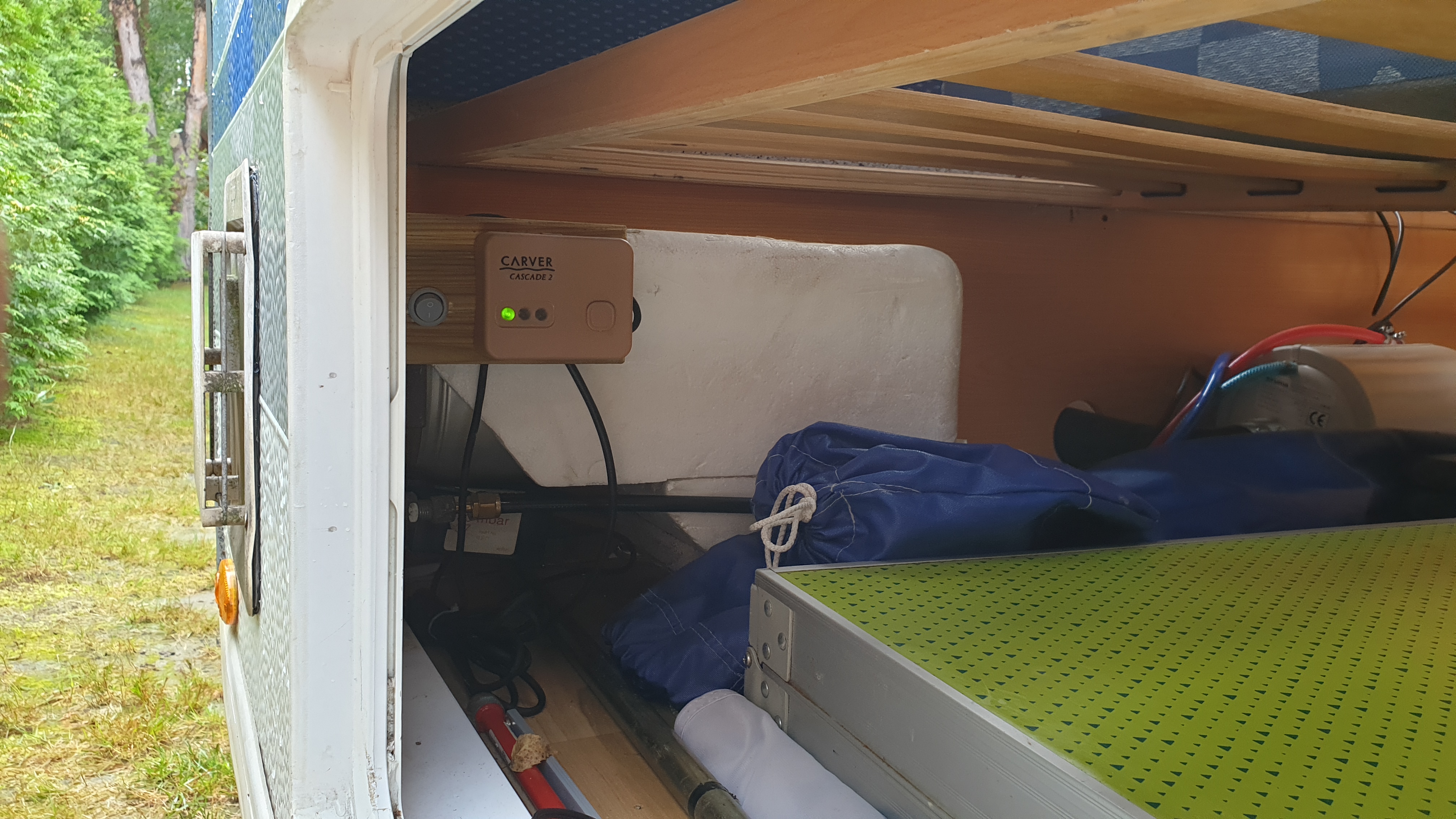 Gaz i sterowanie do bojlera podłączone. Nie bardzo miałem gdzie w przyczepie wyprowadzić sterownik bojlera, więc dałem go pod łóżkiem razem z bojlerem. Dostaję się do niego przez klapę serwisową. Doświadczenie ze 132 pokazuje, że do sterownika podczas postoju trzeba dostać się 2 razy. 1 żeby włączyć po przyjeździe i 2 żeby wyłączyć przed wyjazdem. Jakoś dam radę przez klapę :)