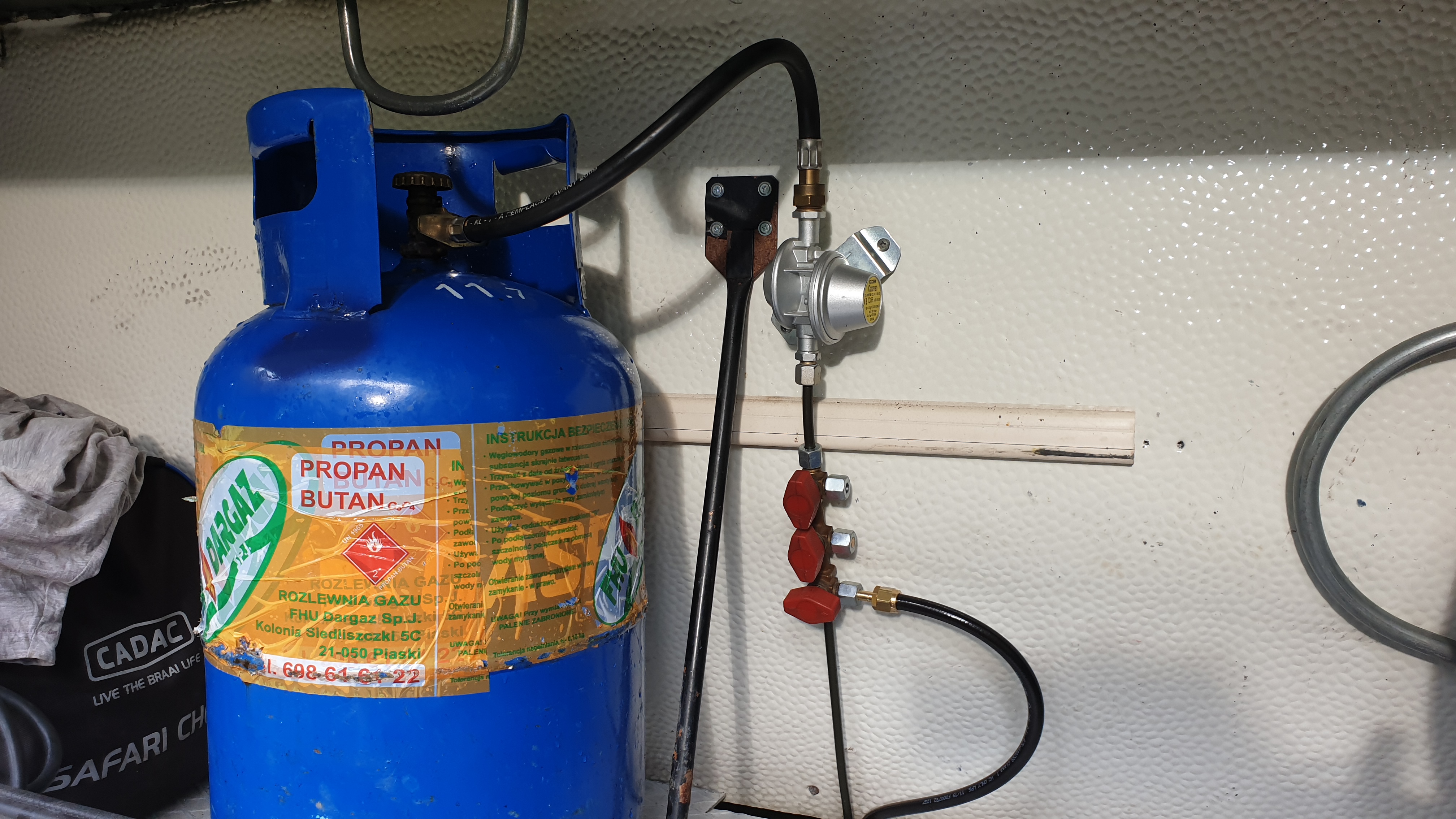 Do przedniego kufra wjechał zawór potrójny trumy. Na razie podłączony tylko bojler. Będzie jeszcze szybkozłączka do grilla. Trzecie odejście na razie będzie zaślepione.
