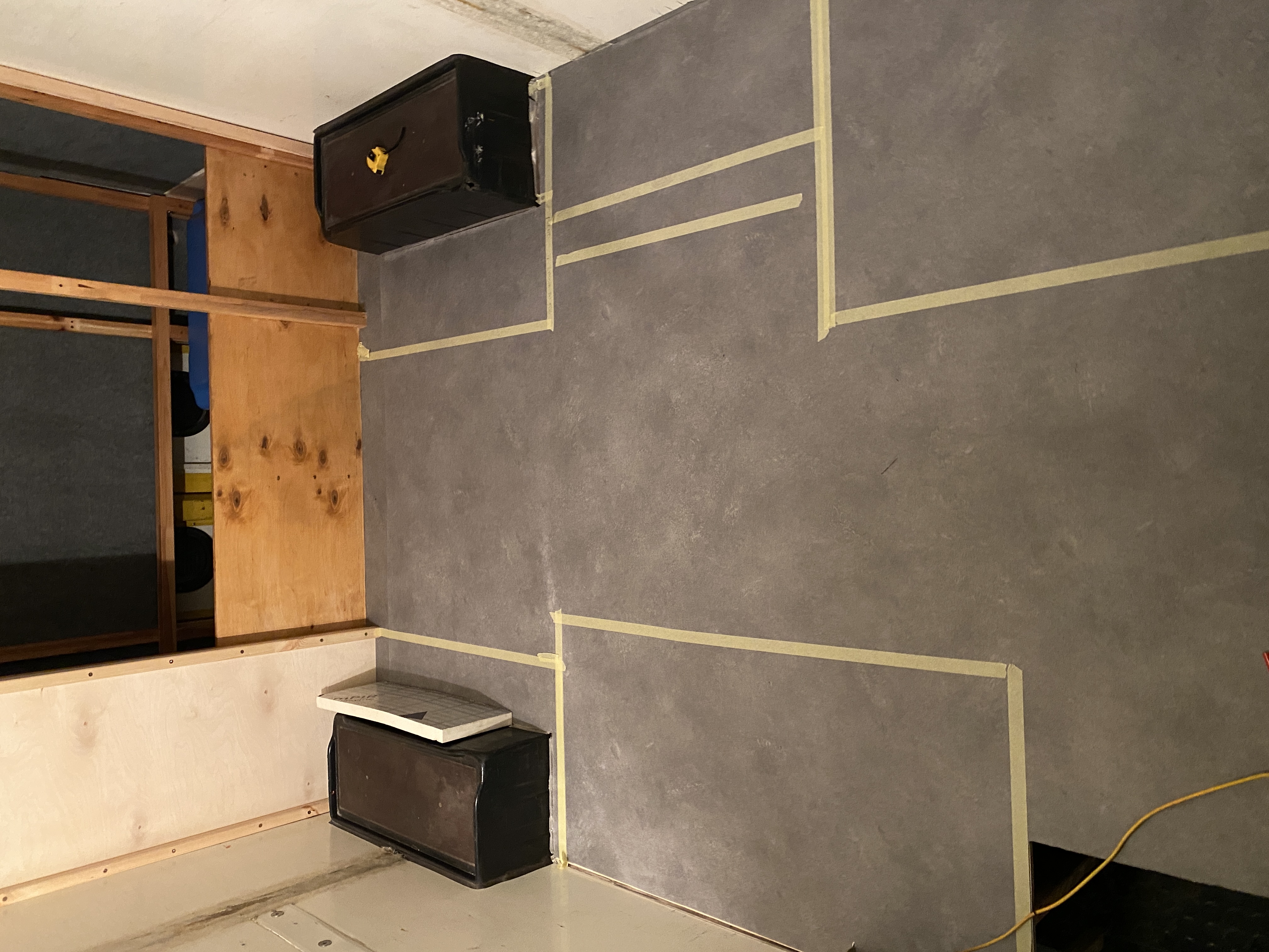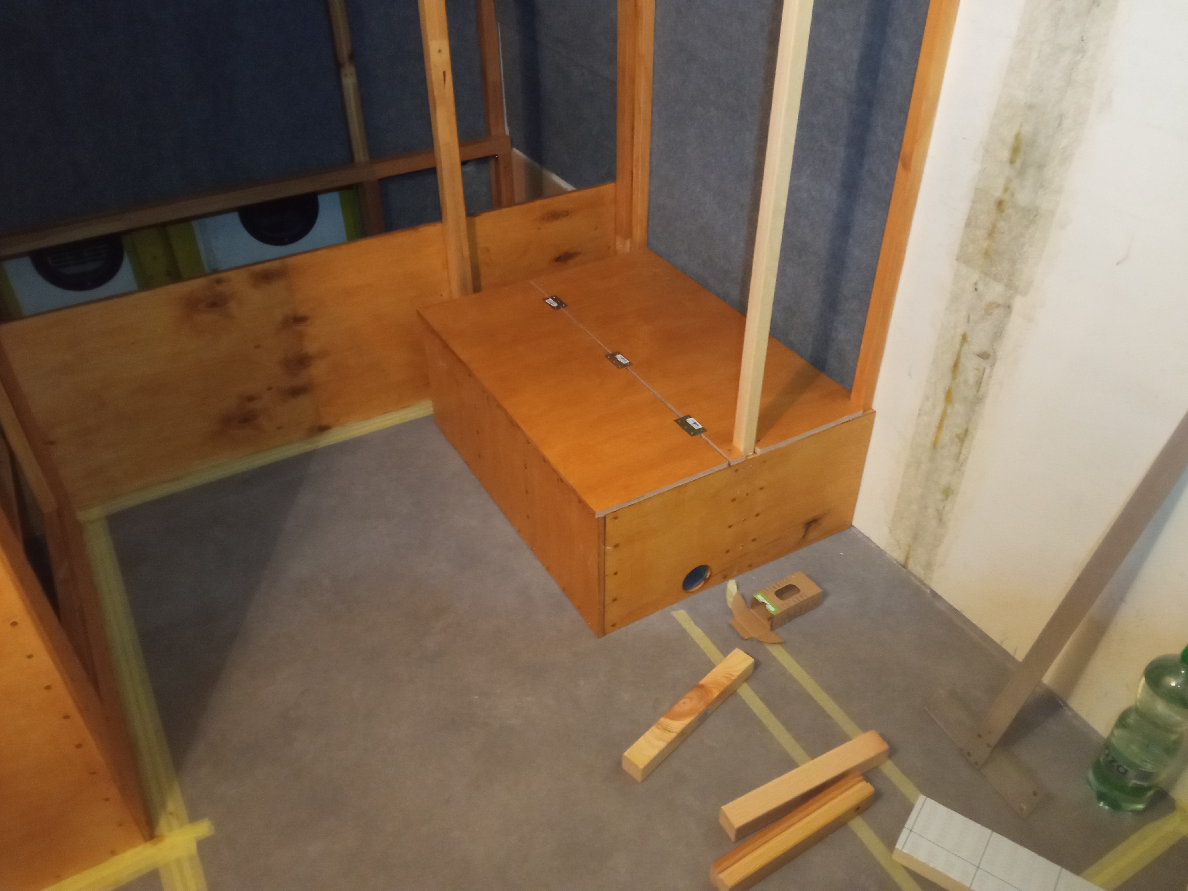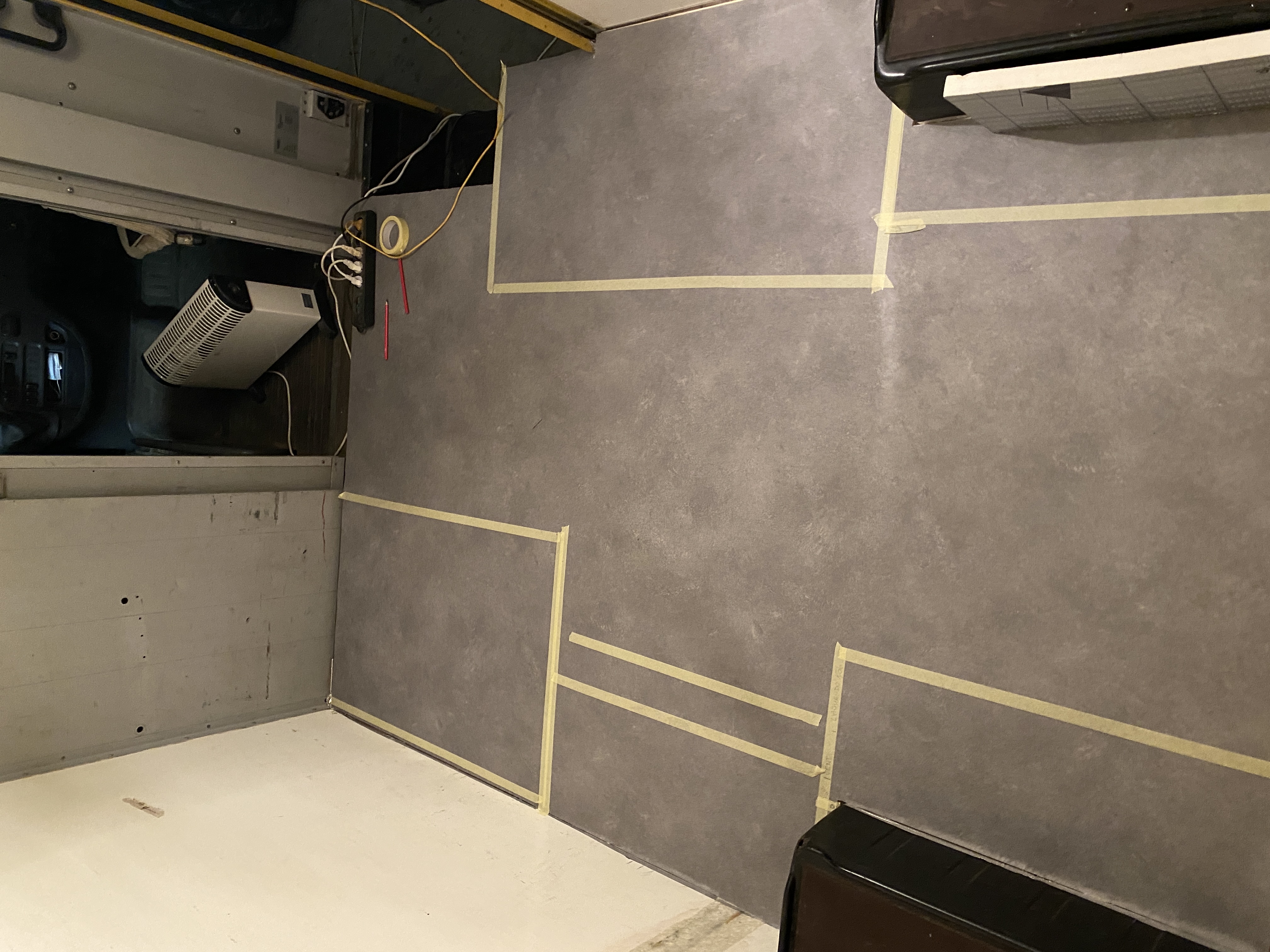 - po ułożeniu wykładziny zapaliło się w głowie światełko - zanim pójdziemy z dalszą zabudową, rozrysujmy układ wnętrza już na położonej wykładzinie. Tak zrobiliśmy, używając do oznaczenia granic zabudowy taśmy malarskiej. Za jej pomocą, zaznaczyliśmy krawędzie siedziska, szafki pod Trumę, aneksu kuchennego, łazienki. Tu nie było żadnych niespodzianek, ale ta operacja w połączeniu ze wspomnianym wcześniej otworem pilotowym pod Trumę upewniła nas w przekonaniu, że idziemy w dobrym kierunku. To odpowiednik metody rozrysowania układy markerem, wspomnianej wcześniej przez Roberta