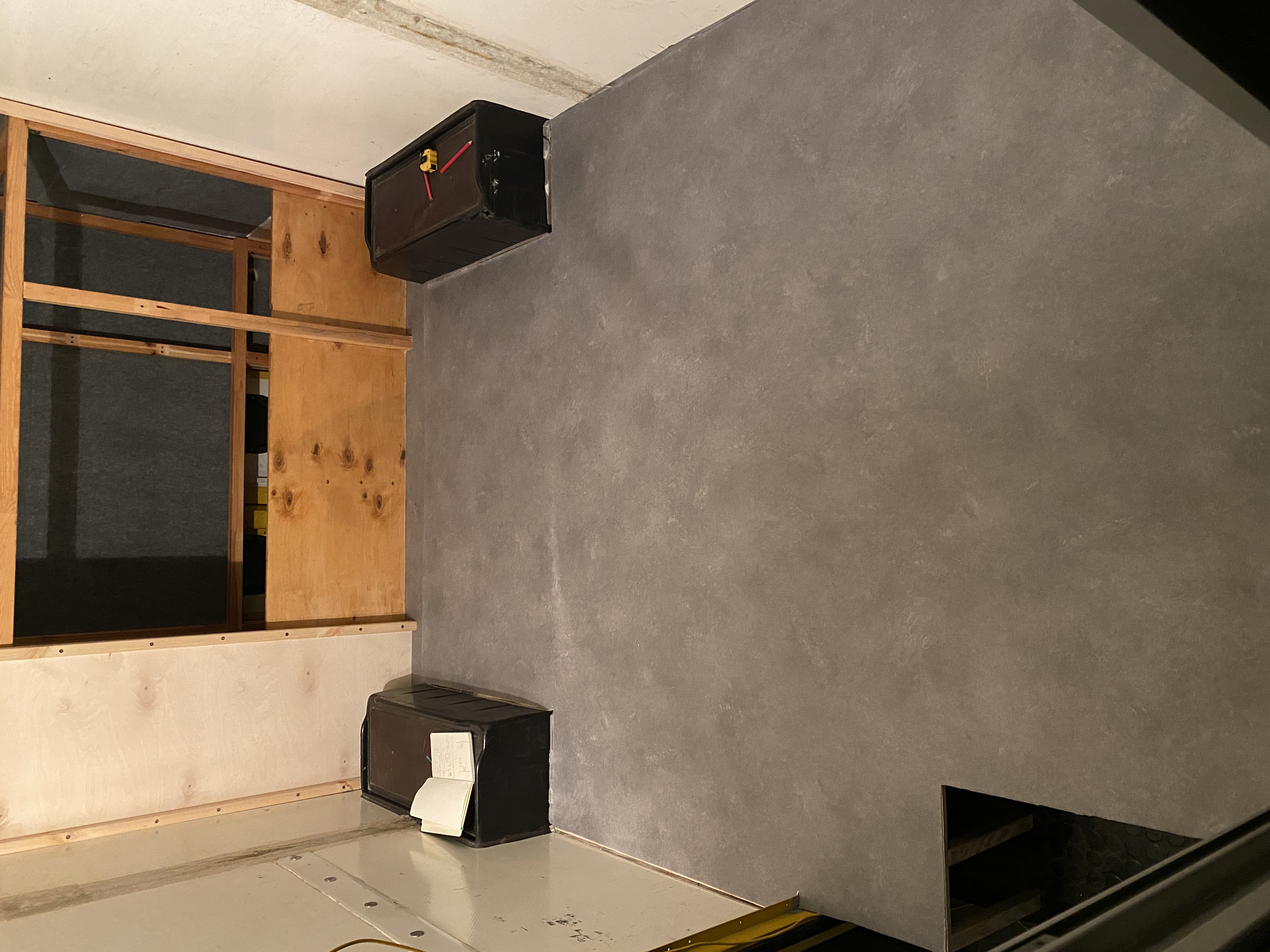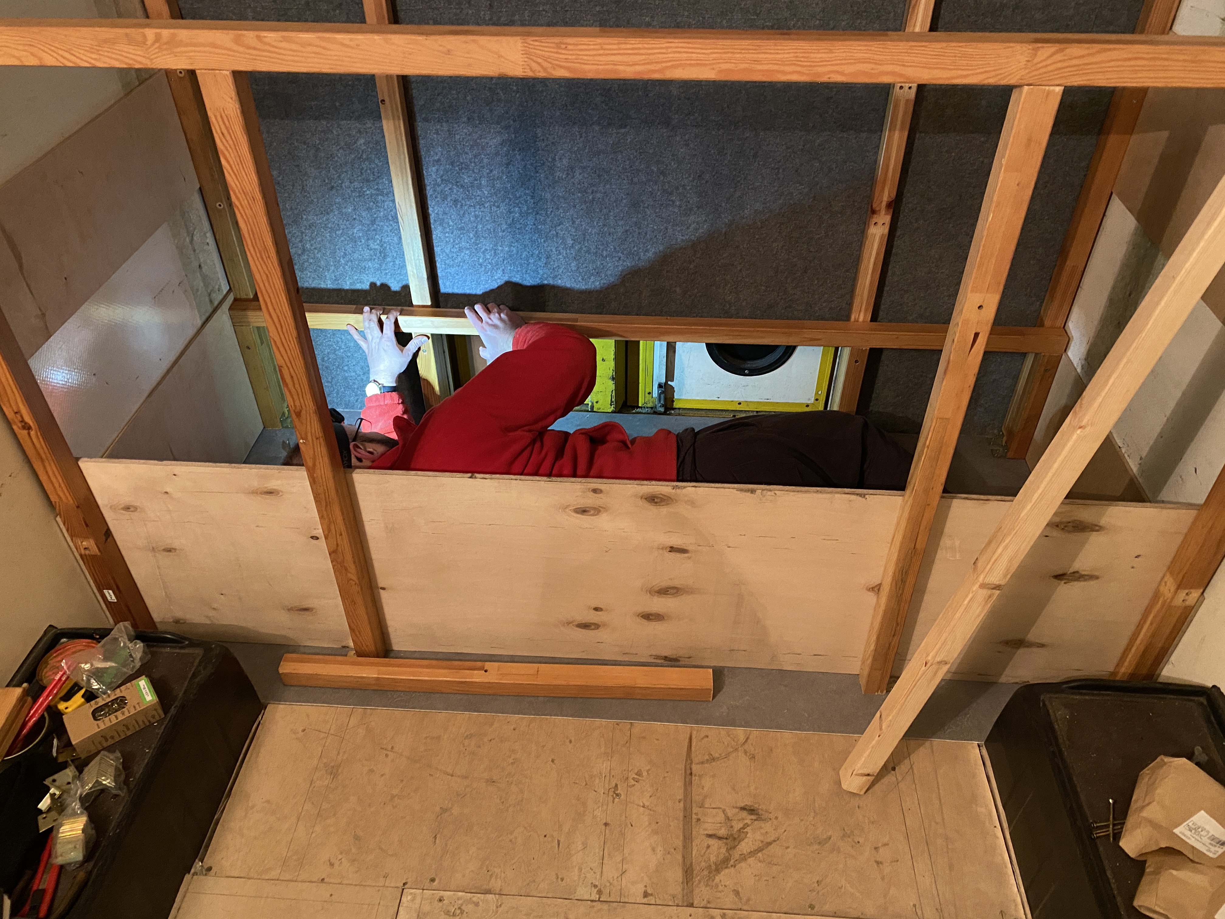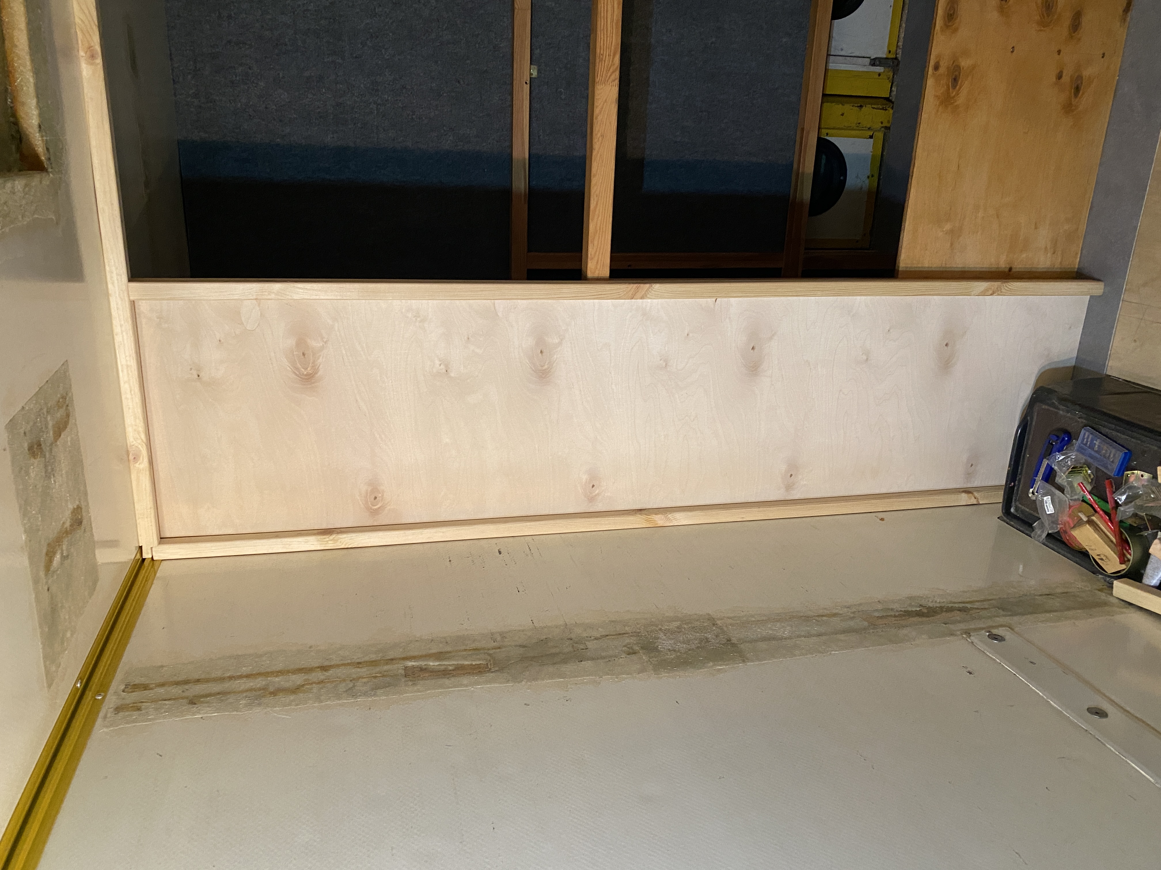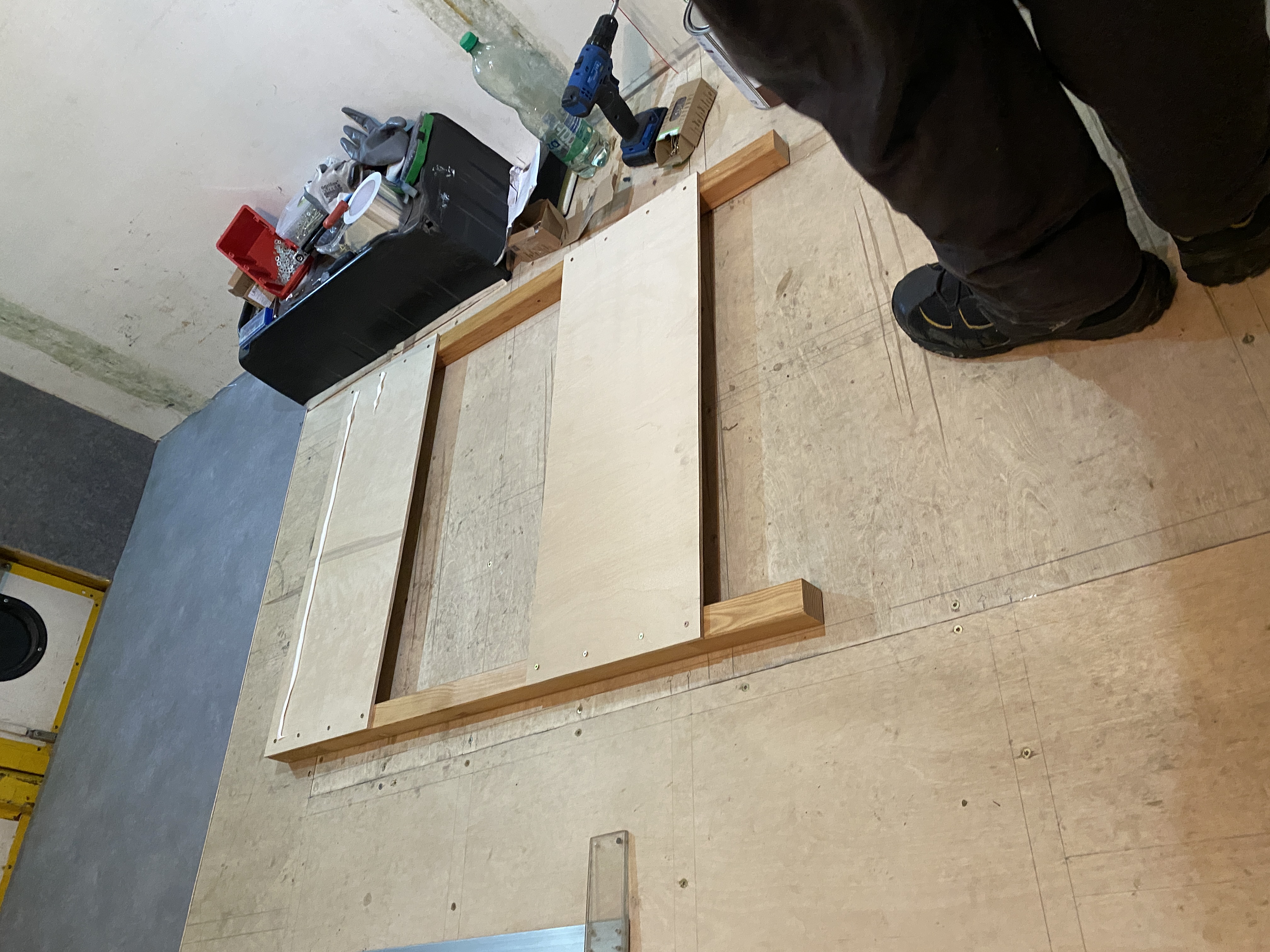 - po ułożeniu wykładziny zapaliło się w głowie światełko - zanim pójdziemy z dalszą zabudową, rozrysujmy układ wnętrza już na położonej wykładzinie. Tak zrobiliśmy, używając do oznaczenia granic zabudowy taśmy malarskiej. Za jej pomocą, zaznaczyliśmy krawędzie siedziska, szafki pod Trumę, aneksu kuchennego, łazienki. Tu nie było żadnych niespodzianek, ale ta operacja w połączeniu ze wspomnianym wcześniej otworem pilotowym pod Trumę upewniła nas w przekonaniu, że idziemy w dobrym kierunku. To odpowiednik metody rozrysowania układy markerem, wspomnianej wcześniej przez Roberta