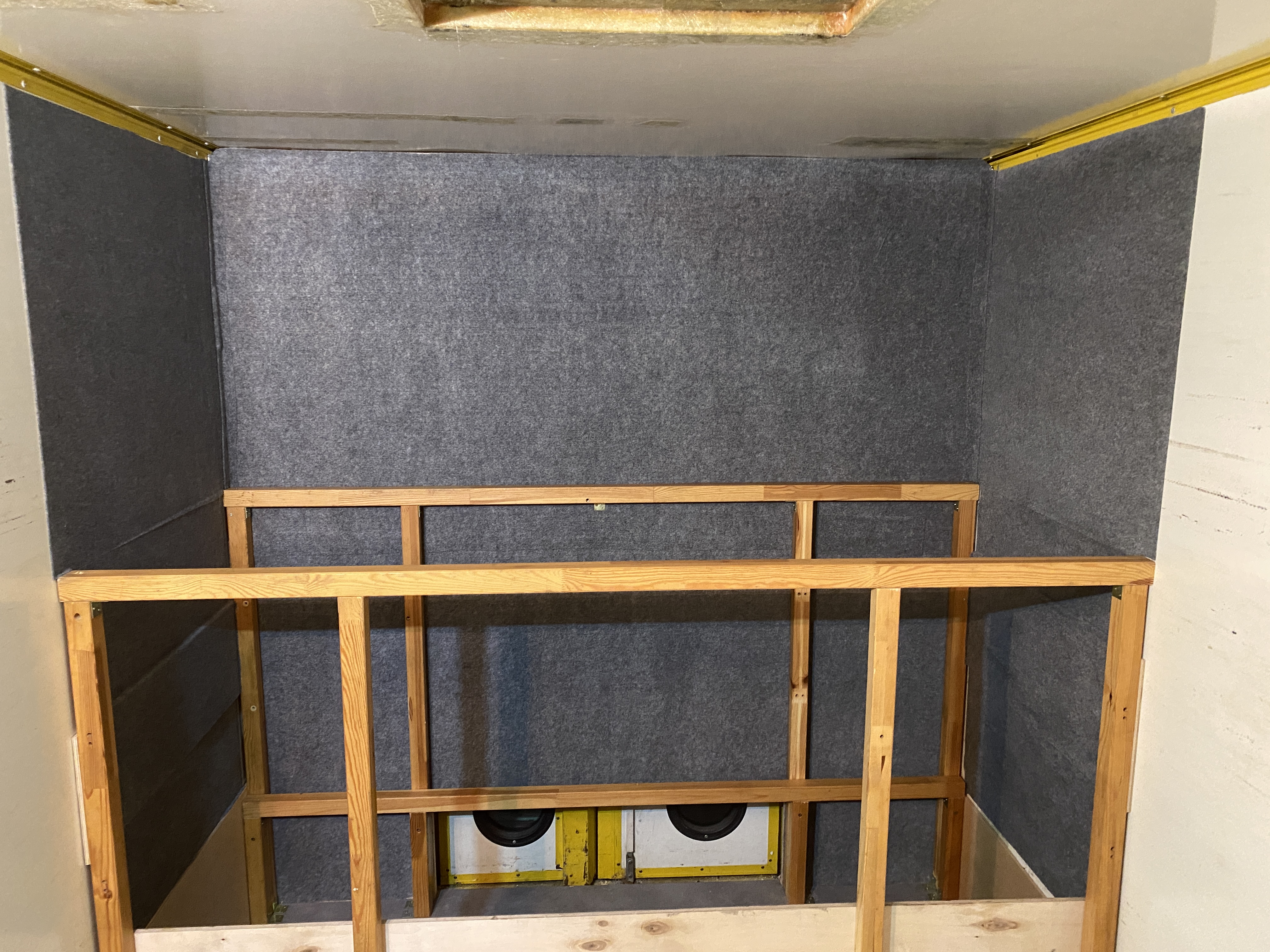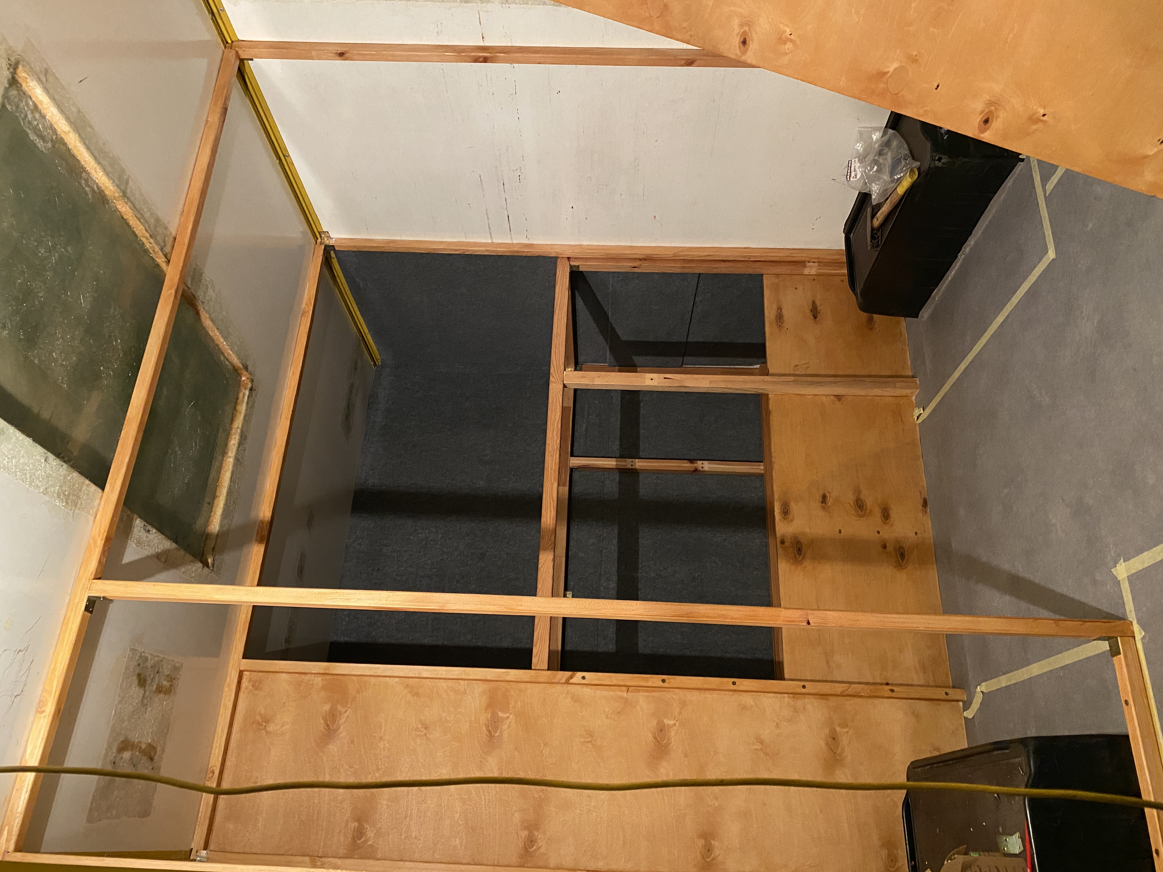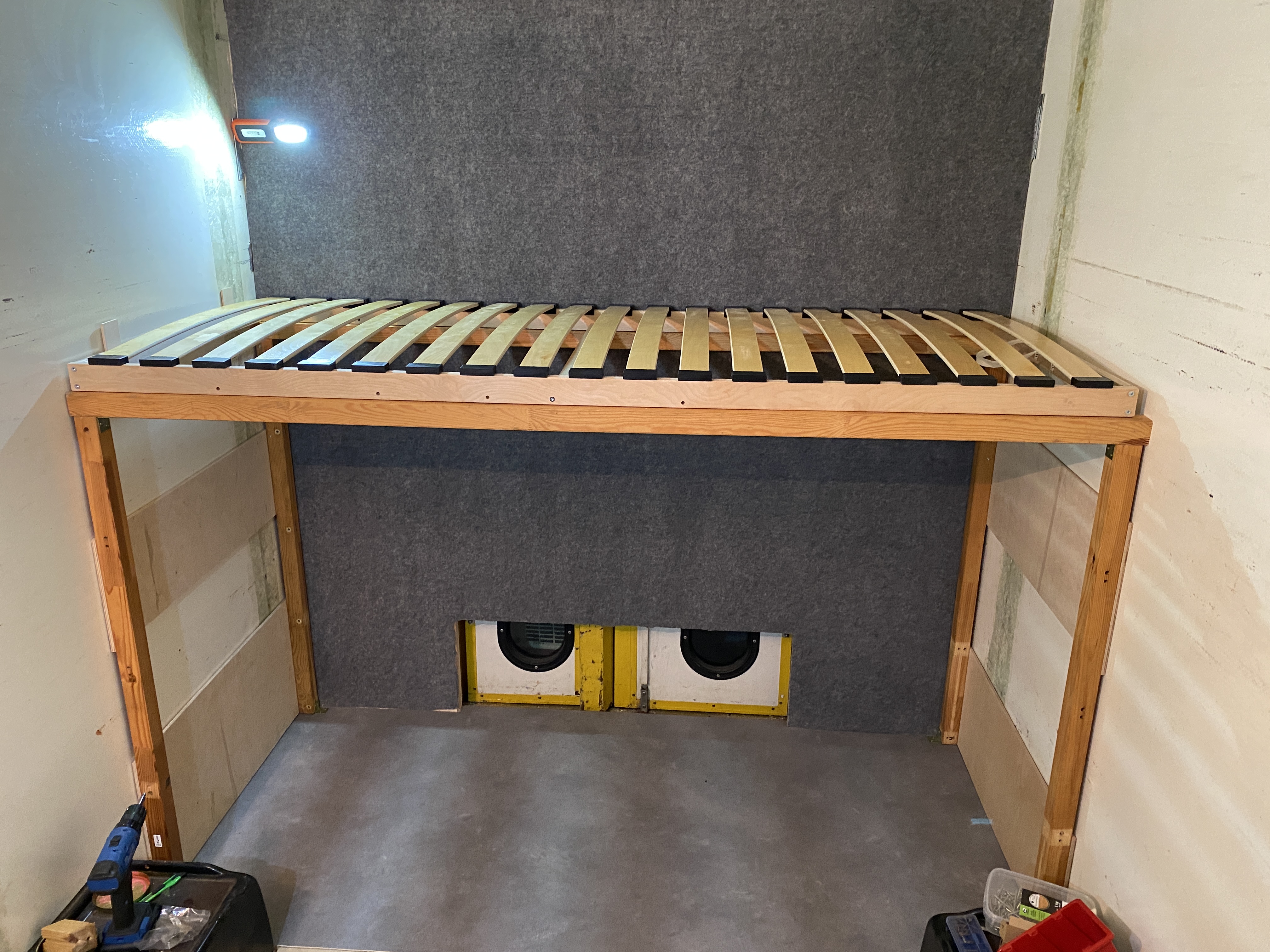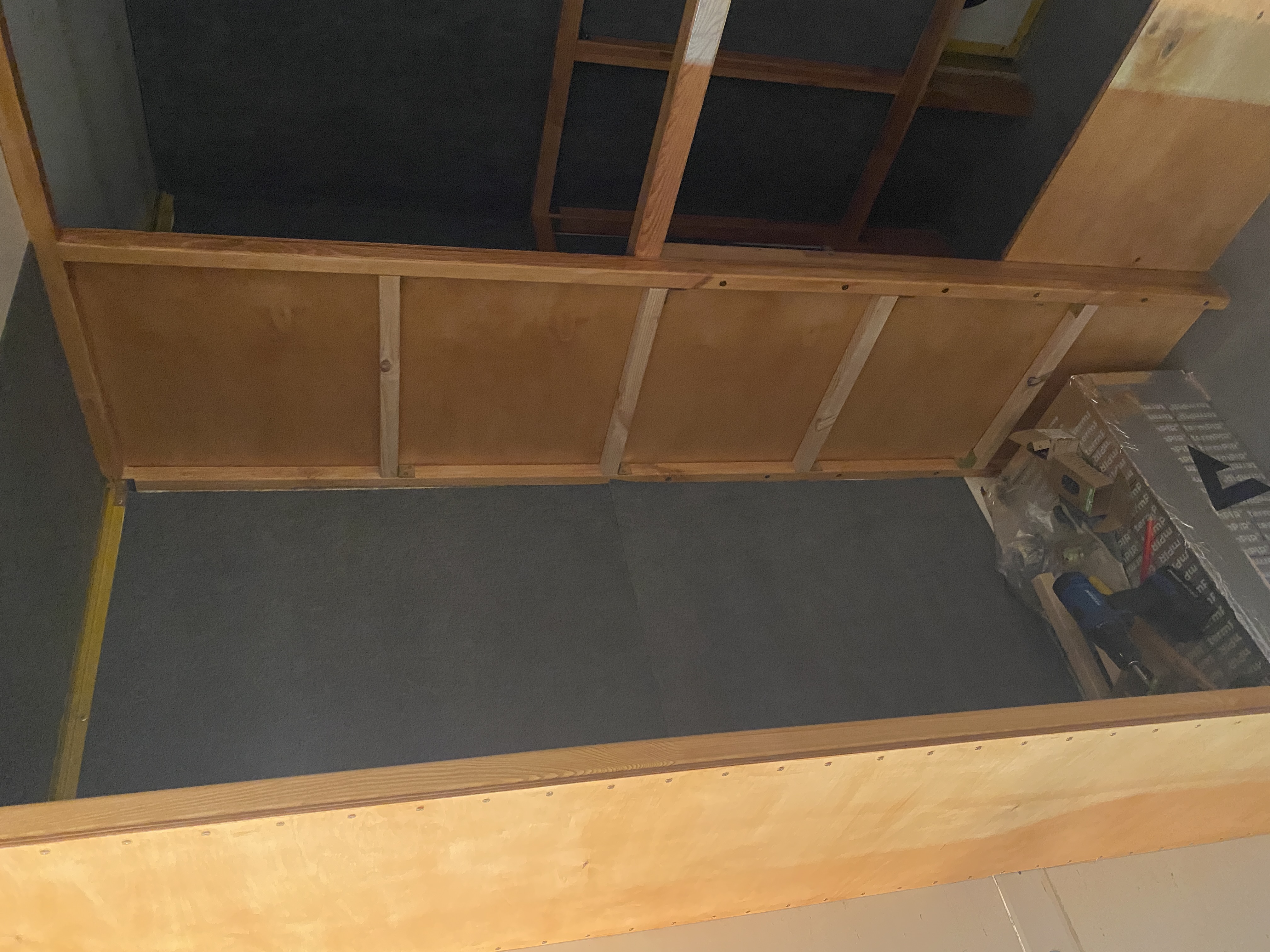 Sciany za głową oraz za nogami łóżka zostały oklejone filcem samoprzylepnym, wspomnianym wcześniej. Taki sam filc powędruje na sufit, ale potem.