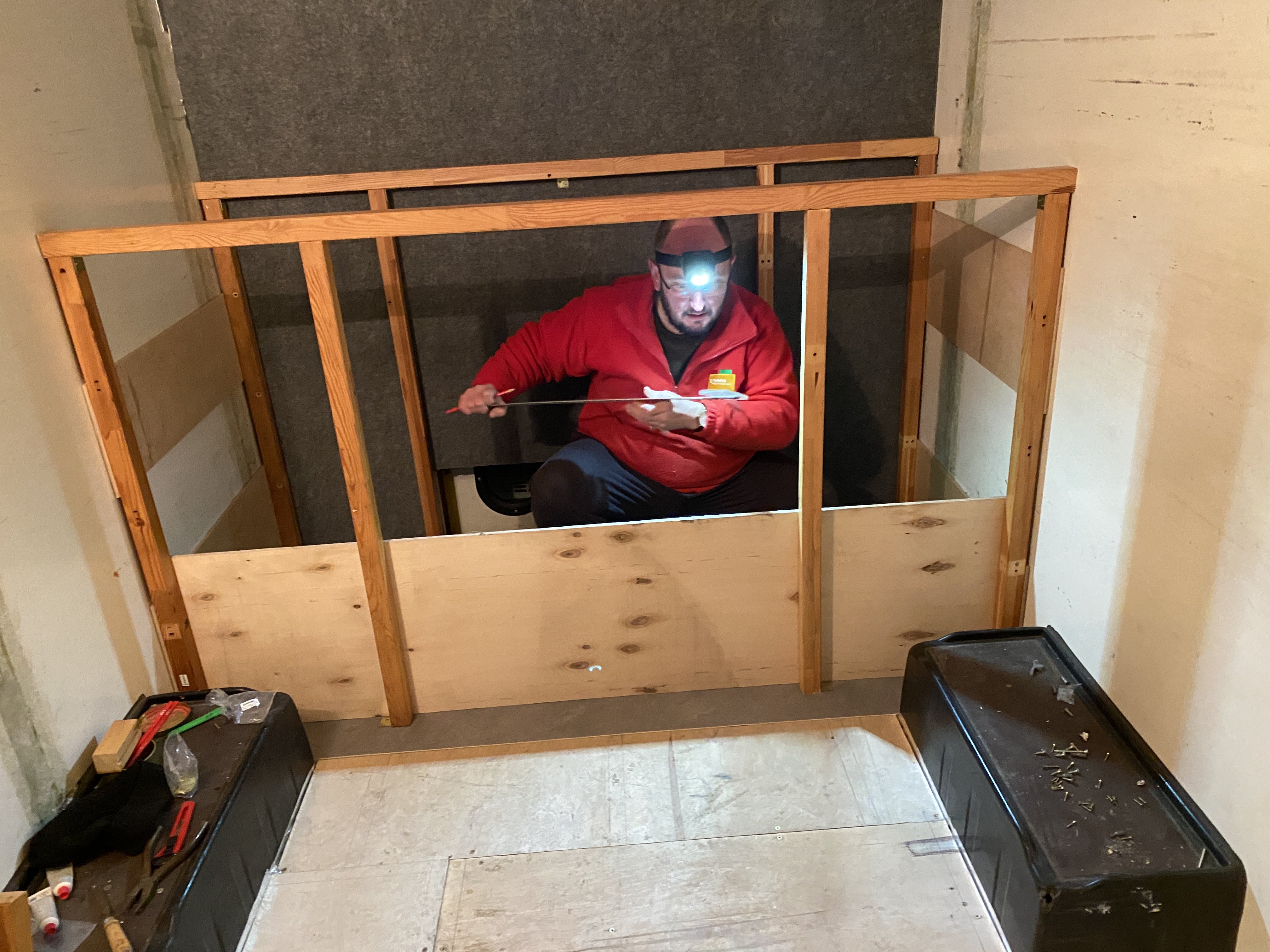 - następnie zrobiliśmy szkielet ściany szafy "od strony szoferki", analogicznie do tego przy łóżku - tu również ściana szafy jest podparciem sufitu