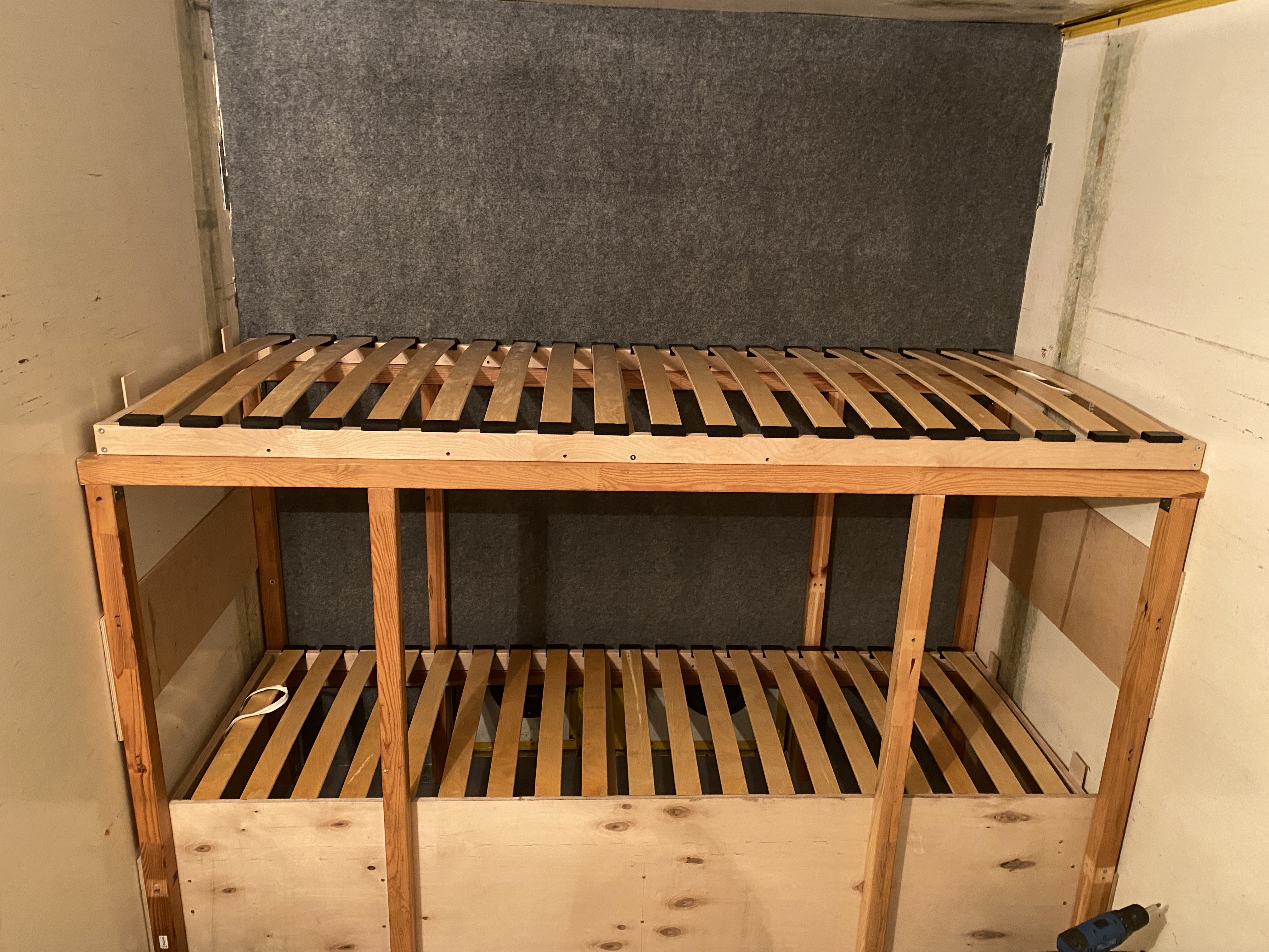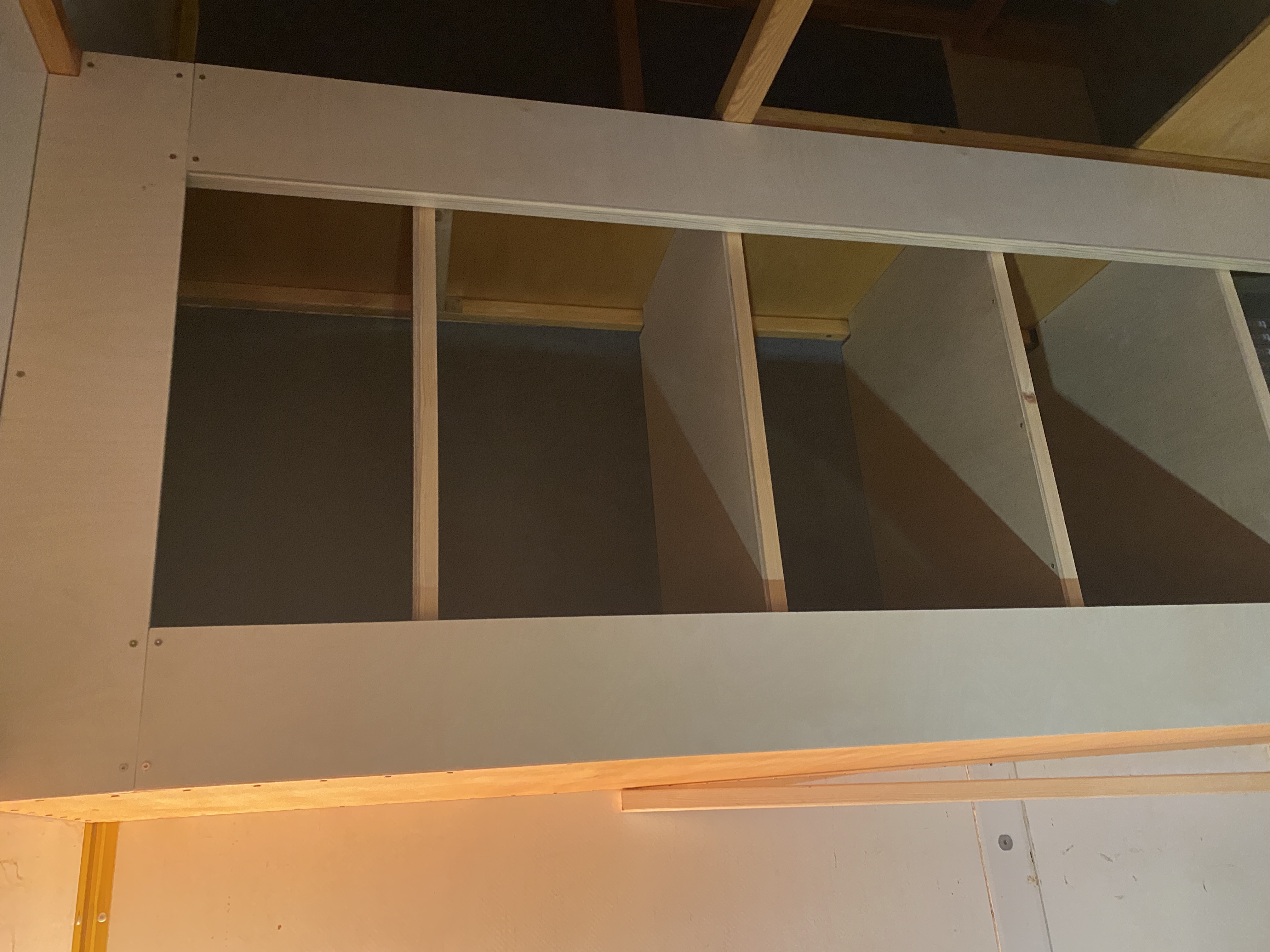 Ściana bakisty dolnego łóżka została zabudowana sklejką 11mm, która pięknie usztywniła konstrukcję. Sklejka ta jest między pionowymi kantówkami łóżka górnego (wystają w kierunku pomieszczenia), a pionowymi kantówkami łóżka dolnego (schowane w bakiście) - wszystko się ładnie sztywno trzyma i niweluje fakt, że wcześniej różnica szerokości obu łóżek wynosiła około 80mm, a więc dolny stelaż mógłby być ciut za wąski.