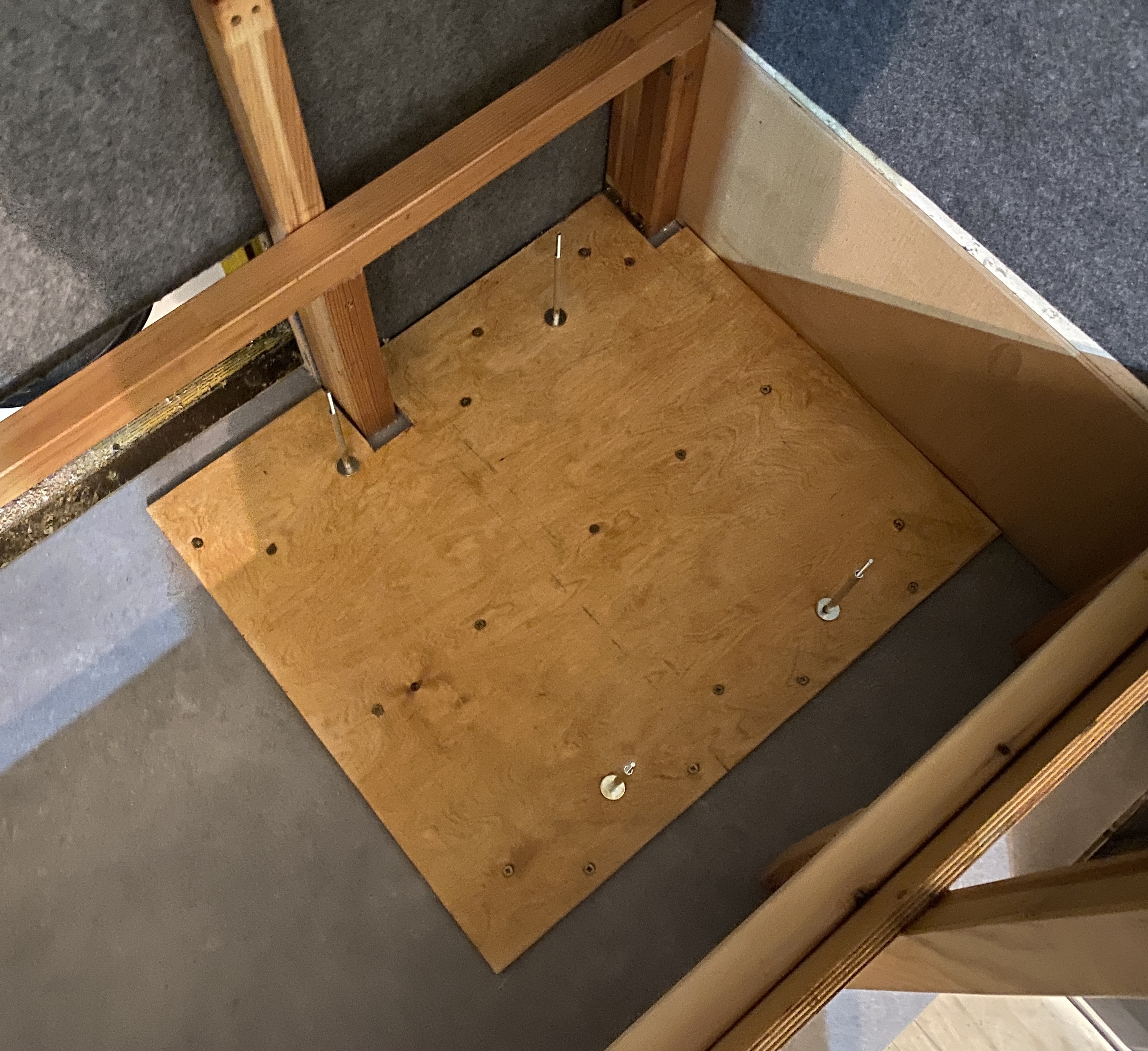 Przygotowane miejsce pod zbiornik Fiamma 70l - 4 szpilki mocowane do podstawy sklejkowej, która to podstawa jest solidnie przykręcona do właściwej podłogi wieloma wkrętami