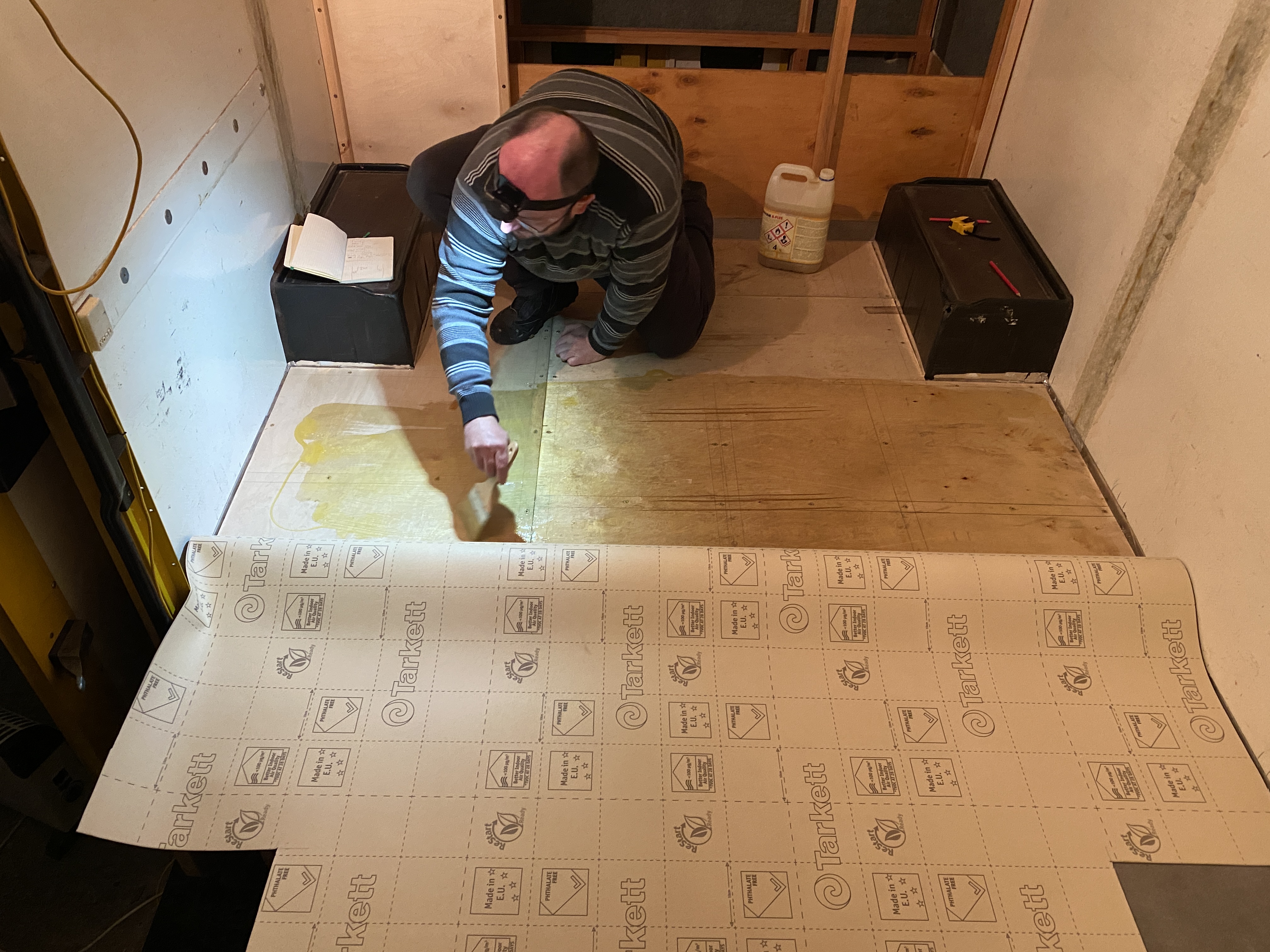 - następnie - przycięliśmy wykładzinę pod całą resztę powierzchni podłogi. Wykładzina powędrowała na sklejkę, przyklejona Bonatermem. Pamiętam, że w Niewiadce była to dość niewdzięczna robota, tu udało się to zrobić o dziwo bez błędów i wtop, nawet pasowanie z wcześniej położonym fragmentem wykładziny wyszło idealnie.