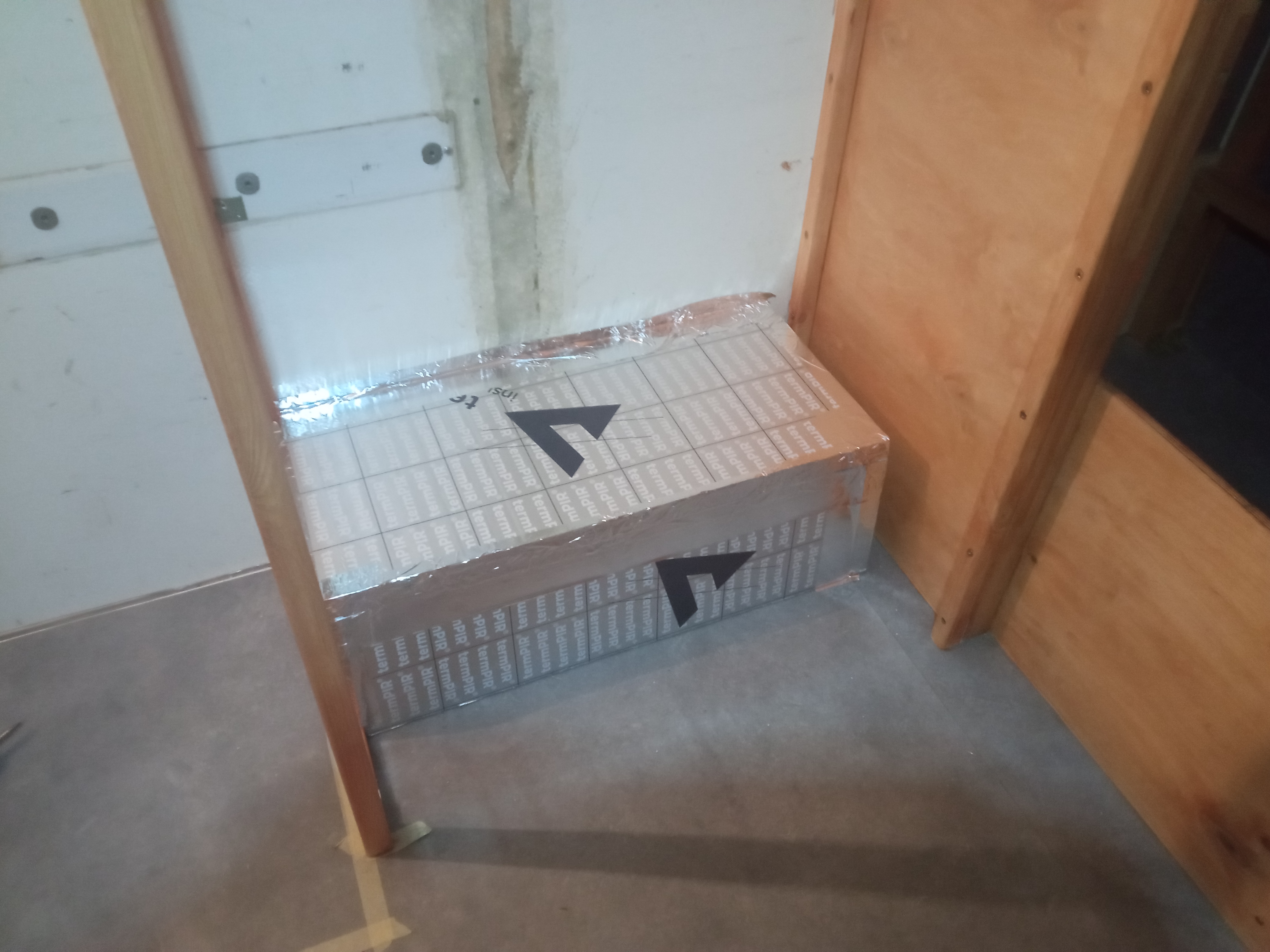 - przed jakimikolwiek następnymi pracami przy szafie, zaizolowałem nadkole. Jest ono prawie prostopadłościenne - no właśnie, prawie :) Więc trzeba troszkę porzeźbić. Do izolacji użyłem płyty PIR, którą kleiłem do nadkola Mamutem. Łączenia płyt pir uszczelniłem taśmą samoprzylepną ameliniową, taką samą jak w przypadku podłogi.
