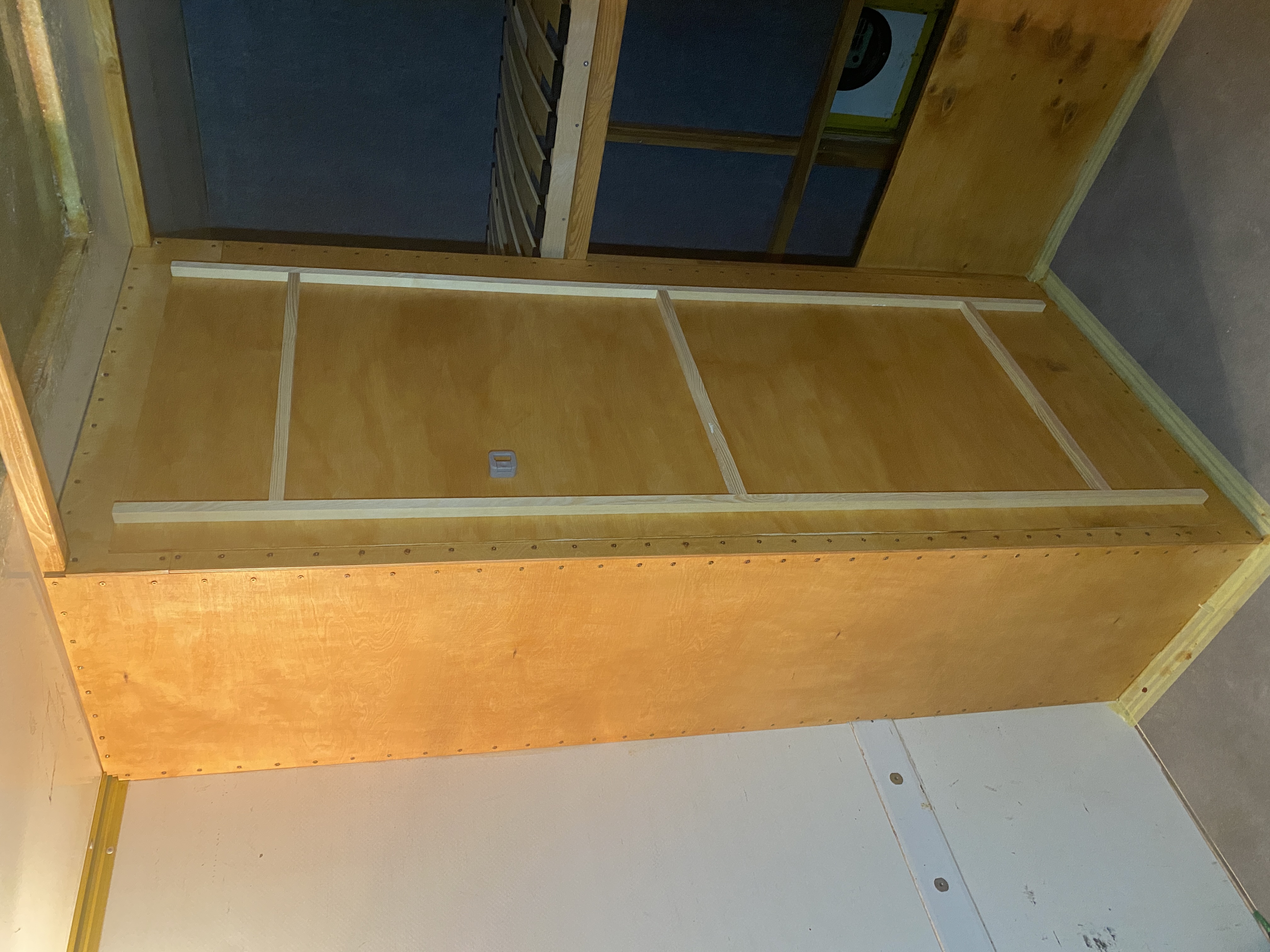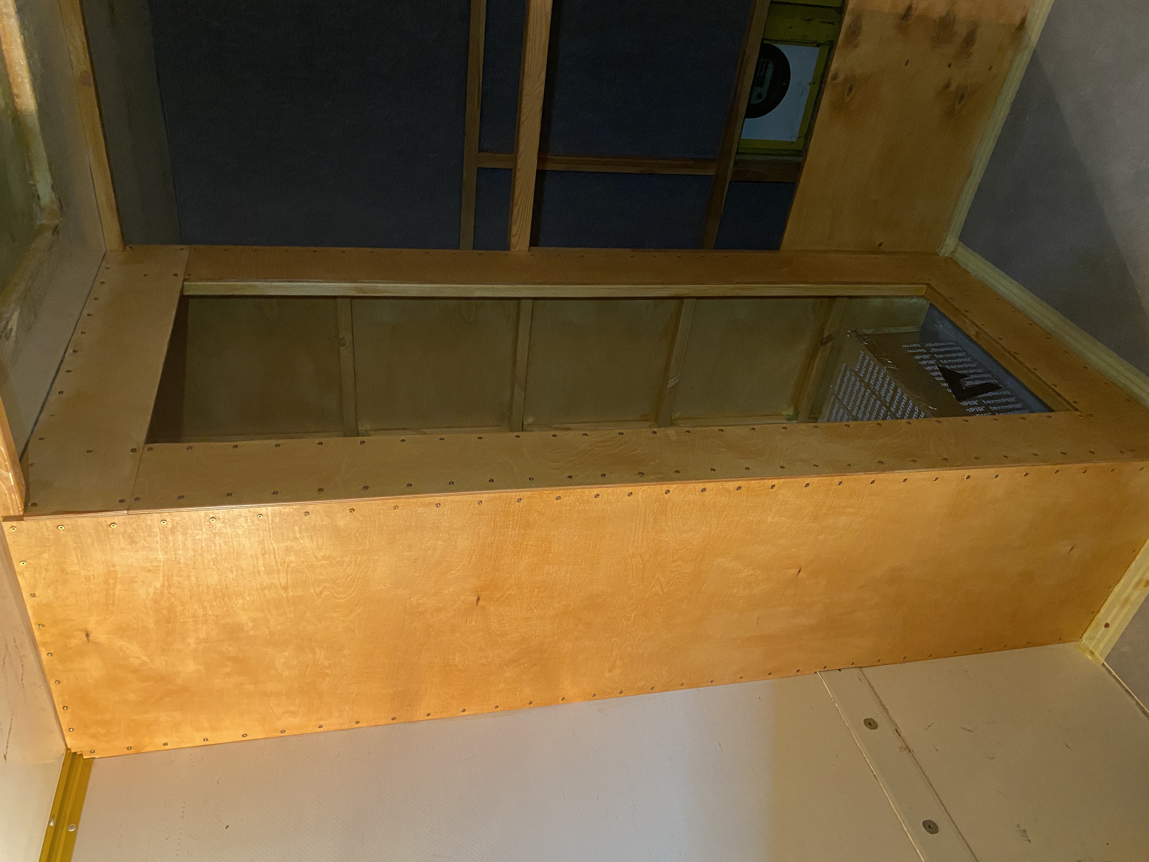 - pod dolnym łóżkiem będzie przestrzeń na zbiornik z wodą, akumulator, rury od wenta, inne elementy instalacji pokładowych, oraz w miarę możliwości zostanie przestrzeń na "graty", przy czym dostęp do owych gratów będzie z zewnątrz