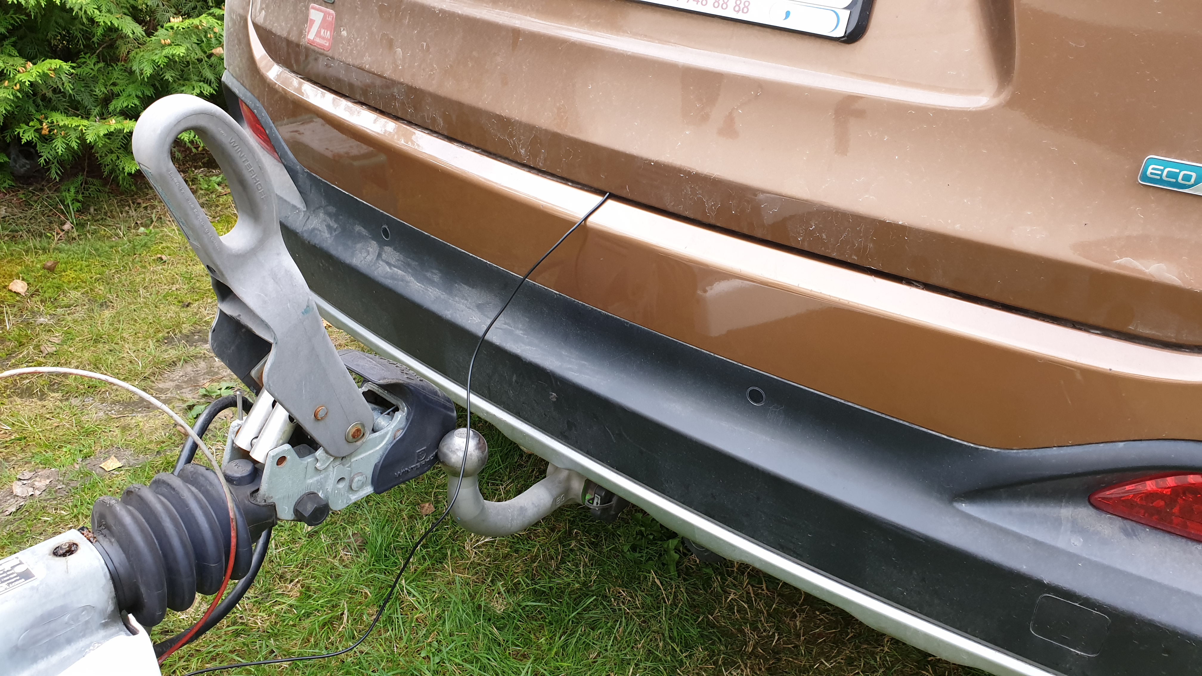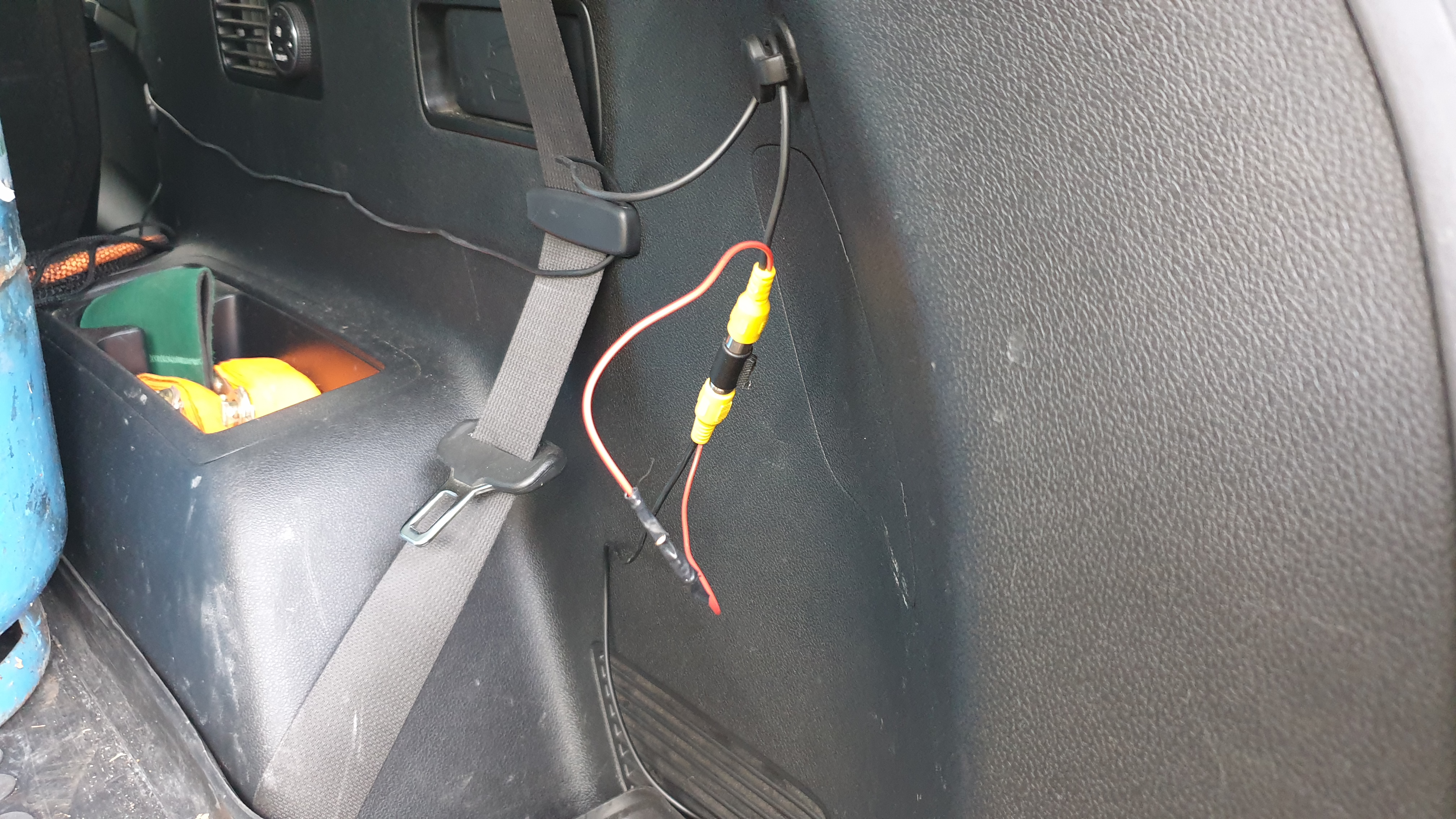Ostatecznie położyłem kabel od kamery do dyszla i drugi od wyświetlacza do bagażnika. W bagażniku łączę je złączką cinch-cinch, taka akcja żeby przy przypinaniu/odpinaniu przyczepy nie przeciągać kabla przez całe auto. Zauważyłem przy testach, że im dłużej jadę tym częściej zrywa się sygnał z kamery. Obstawiam, że problem bierze się z nie przystosowania modułu bezprzewodowego do tak długiej pracy. Te moduły są w miarę OK do cofania, ale nie do bycia lusterkiem wstecznym.