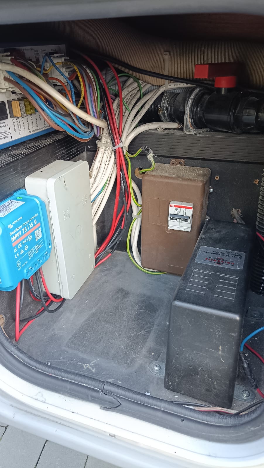W związku z tym podłączyłem to tak, że aku będzie równolegle ładowany z EBLa i z Victrona czyli dokładnie tak jak w poradniku. (Dzięki Bartek, nie pierwszy raz on mi ratuje rzyć).