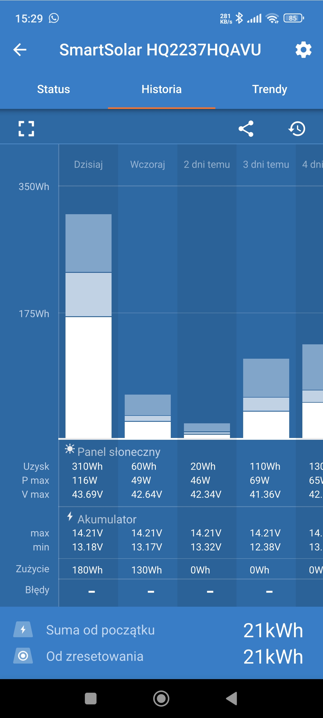 Niestety pomiar ten nie uwzględnia, jak już wspomniałem wcześniej, poboru prądu przez urządzenia w zabudowie i ładowania z alternatora w czasie jazdy więc obarczony jest pewnym błędem ale na pewno da jakieś rozeznanie w temacie, a biorąc pod uwagę tylko tak skromne dane z kilku godzin to jestem pełen nadziei że prądu na wakacjach nie braknie, chociaż z tyłu głowy mi się kołacze żeby może jeszcze 100W na dach dołożyć, bo Victron może obsłużyć do do 75V
