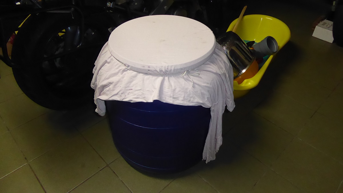 Beczka przykryta jedynie materiałem bo w tej fazie gazowanie jest ogromne. Wnętrze szybko wypełnia się produkowanym CO2 które chroni zawartość przed utlenieniem.