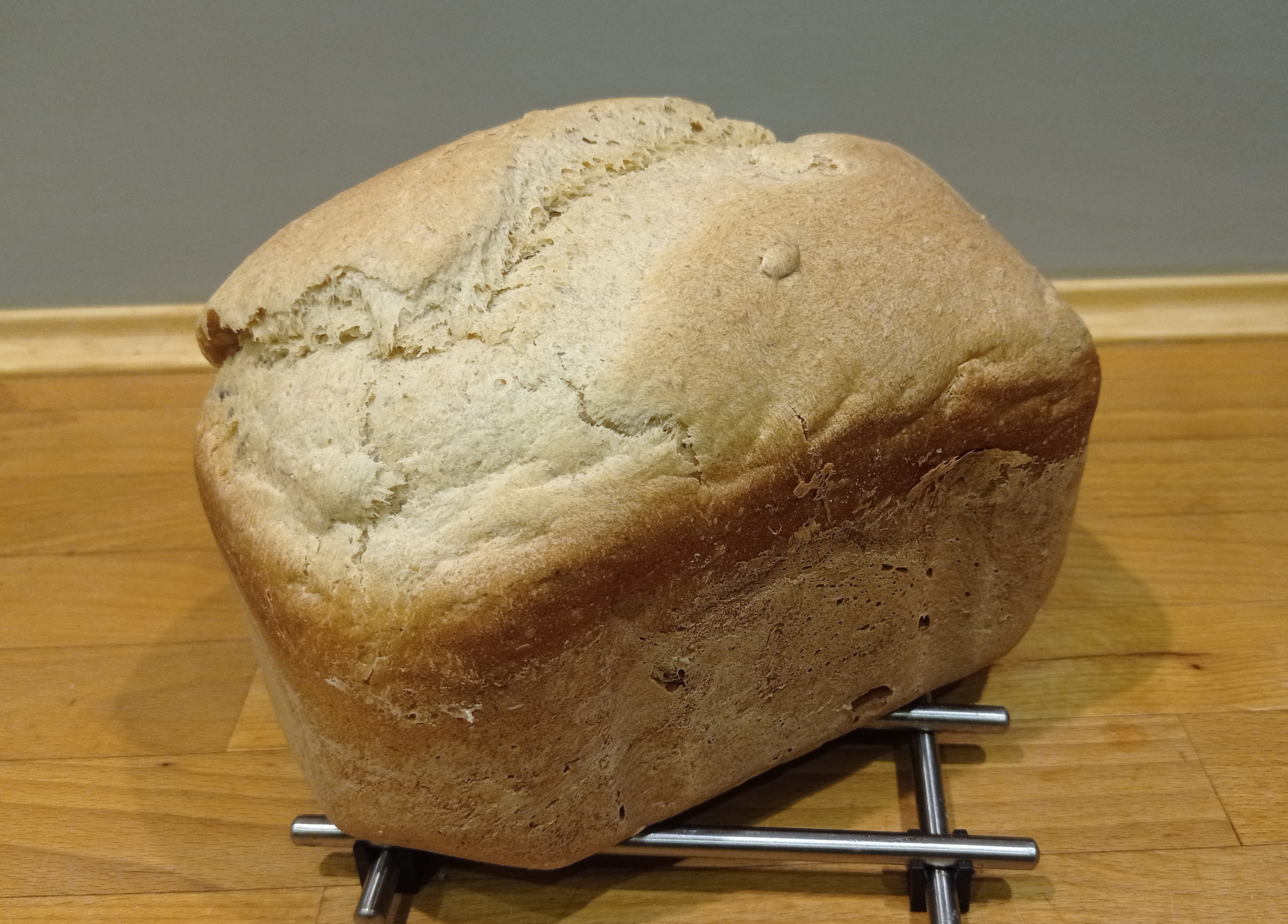 Może żaden to wyczyn, ale się pochwalę. Kilka dni temu nabyłem automat do wypieku chleba. Temat swojskiego chleba chodził mi po głowie od dawna, ale żeby piec chleb do codziennego użytku to trzeba mieć sporo czasu i samozaparcia bo jest to proces dość czasochłonny. Automat ma wiele ograniczeń, ale przygotowanie chleba zajmuje jakieś 2 minuty czyli tyle ile czasu potrzeba na wsypanie produktów do naczynia i ustawienie programu. Oczywiście sam zakup nie był u mnie przypadkowy, bo mój ojciec dociera już drugi egzemplarz i od kilku lat nie kupuje chleba w sklepie. Nam jego chleb od zawsze smakuje, a że trafiła się ostatnio w Lidlu dobra promocja to zaczynam zabawę. Już wiem, że wszystkie zdefiniowane programy są za słabe, bo chleb jest zbyt blady. Ten poniżej piekł sie 10 minut dłużej niż w najdłuższym programie. Na szczęście można w maszynie definiować swoje ustawienia więc testujemy. Widać, że jeszcze z 10 minut trzeba dołożyć.