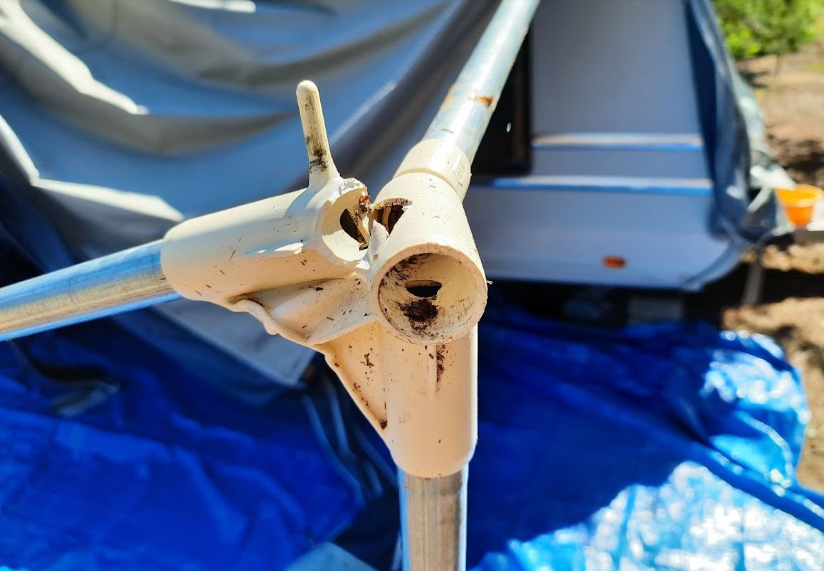 W zeszłym roku na rancho dopadła nas w środku nocy ulewa o takiej intensywności, że w efekcie opadów w jednym miejscu dach przedsionka zmienił się w ogromną "bułę" (śląskie słowo najbardziej mi pasuje) i nim zdążyłem ją opróżnić cała woda zwaliła nam się do środka, krzywiąc rurkę stelaża oraz uszkadzając plastikowe elementy mocowania rurek (vide dołączone fotki). Rurkę oraz elementy plastikowe wymieniłem ale problem pozostał.