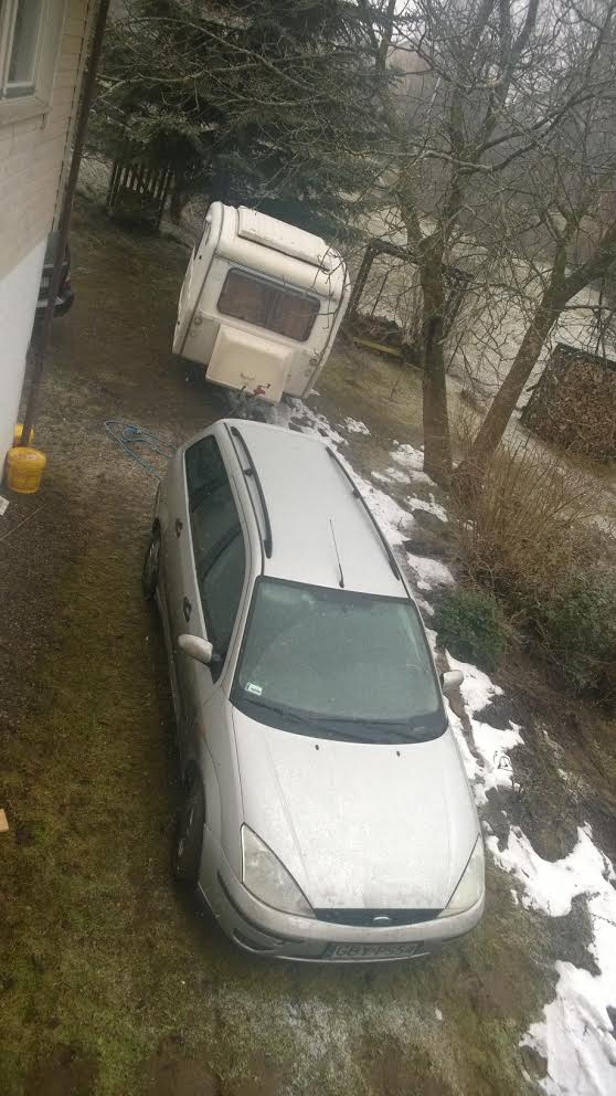 Niestety, nie przewidziałem że ziemia po roztopach i opadach jest AŻ TAK przemoknięta, i przyczepkę pięknie ustawiłem ręcznie po sprowadzeniu jej na dół podjazdu autem, ale niestety focusik już nie wyjechał - zakopał się w błocie.