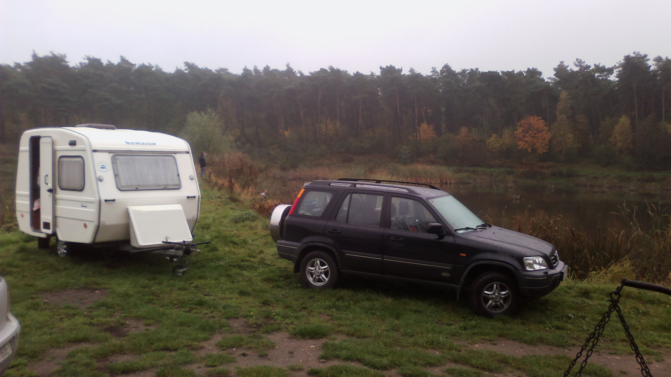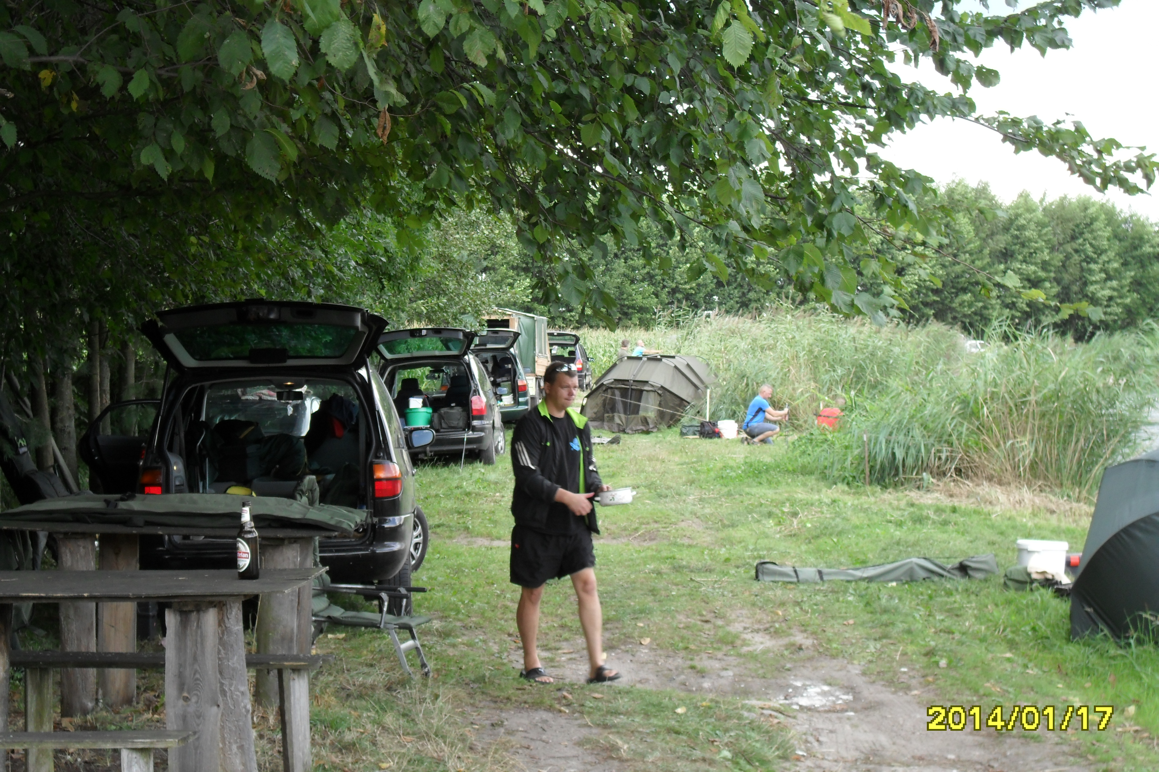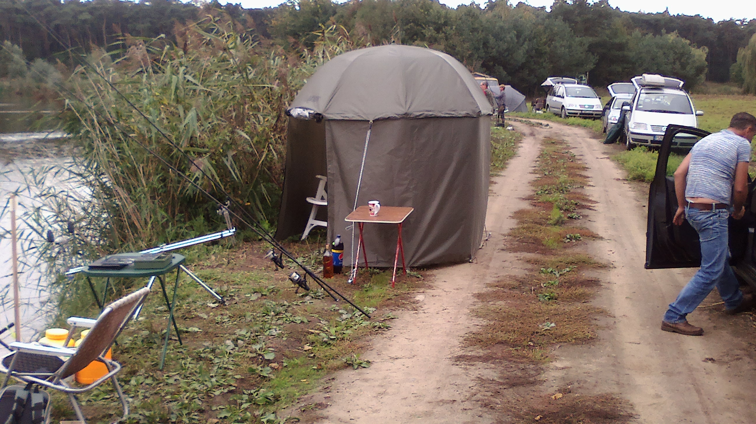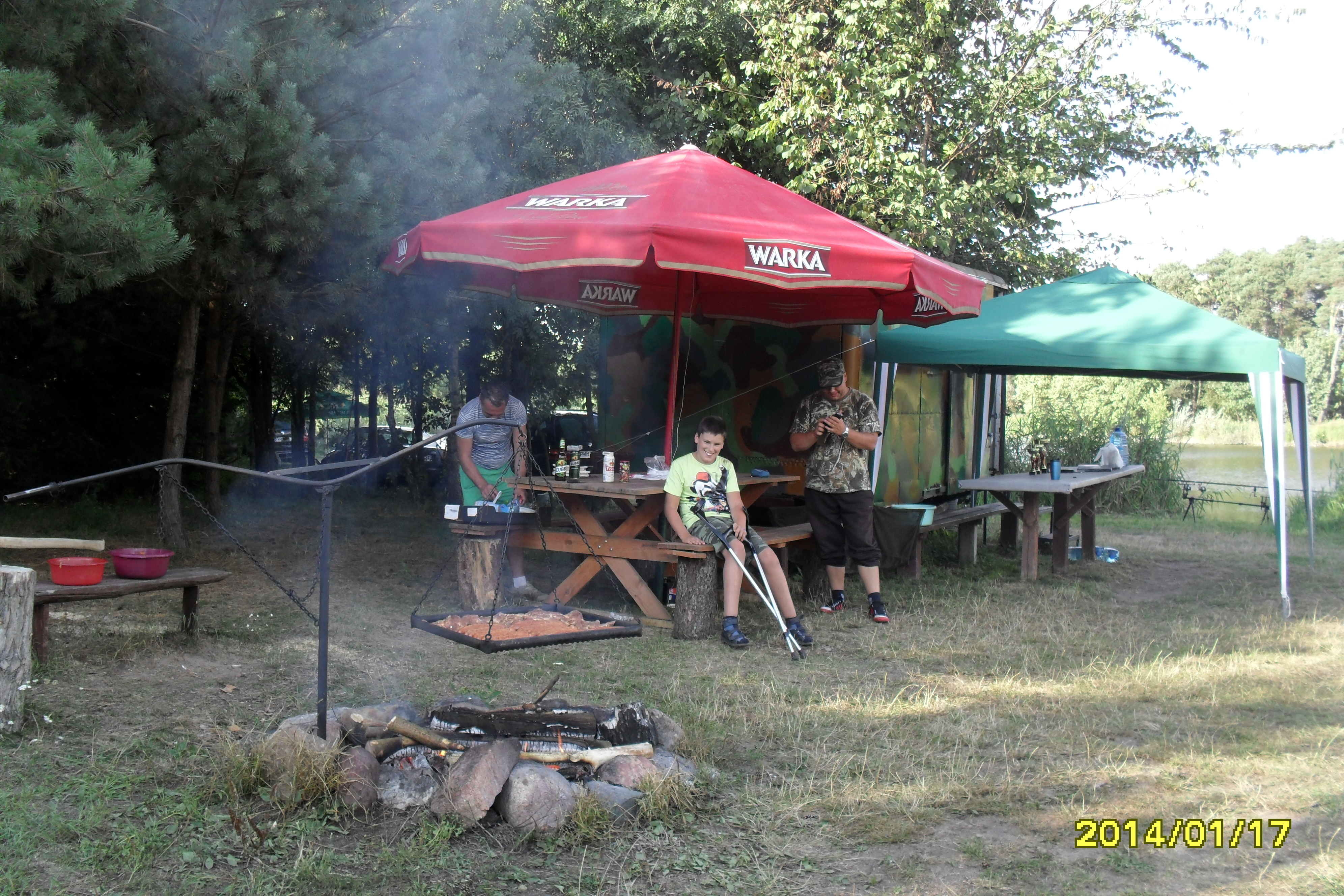 Zawody trwają na te chwilę wygrywa karp 10 kg a na drugim karp 5,35 kg . Poznałem kolesia z cepką samoróbką . Koła od trabanta czy wartburga środek rozstaw jak w mojej ence . Poszukiwane kuchenka i zlew . Jakby ktoś chciał pomóc chłopakowi za drobną opłatą to jest chętny .Na pierwszym zdjęciu fajny pomysł na ruszt nad ogniskiem , regulacja łańcuszkiem i kierownica od jawki oczywiście z dzwonkiem oznajmiającym o gotowym żarciu .Całość wkładana w wbetonowaną rurę . Można obracać i w ten sposób nie trzeba obracać mięsa nad ogniem . Warte skopiowania !!! .Zapomniałem ustawić datę w aparacie