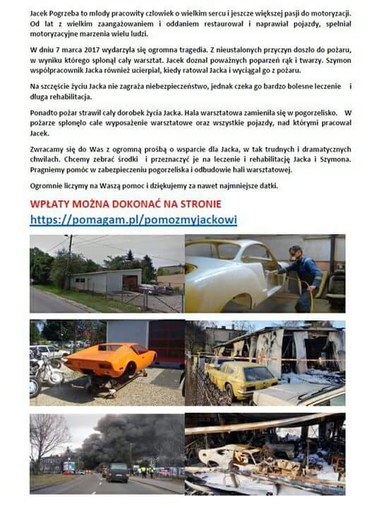 "Pomagam.pl: Jacek Pogrzeba to młody pracowity człowiek o wielkim sercu i jeszcze większej pasji do motoryzacji. Od lat z wielkim zaangażowaniem i oddaniem restaurował i naprawiał pojazdy, spełniał motoryzacyjne marzenia wielu ludzi. Nigdy nie opuścił nikogo w potrzebie, zawsze służył pomocą i poradą"