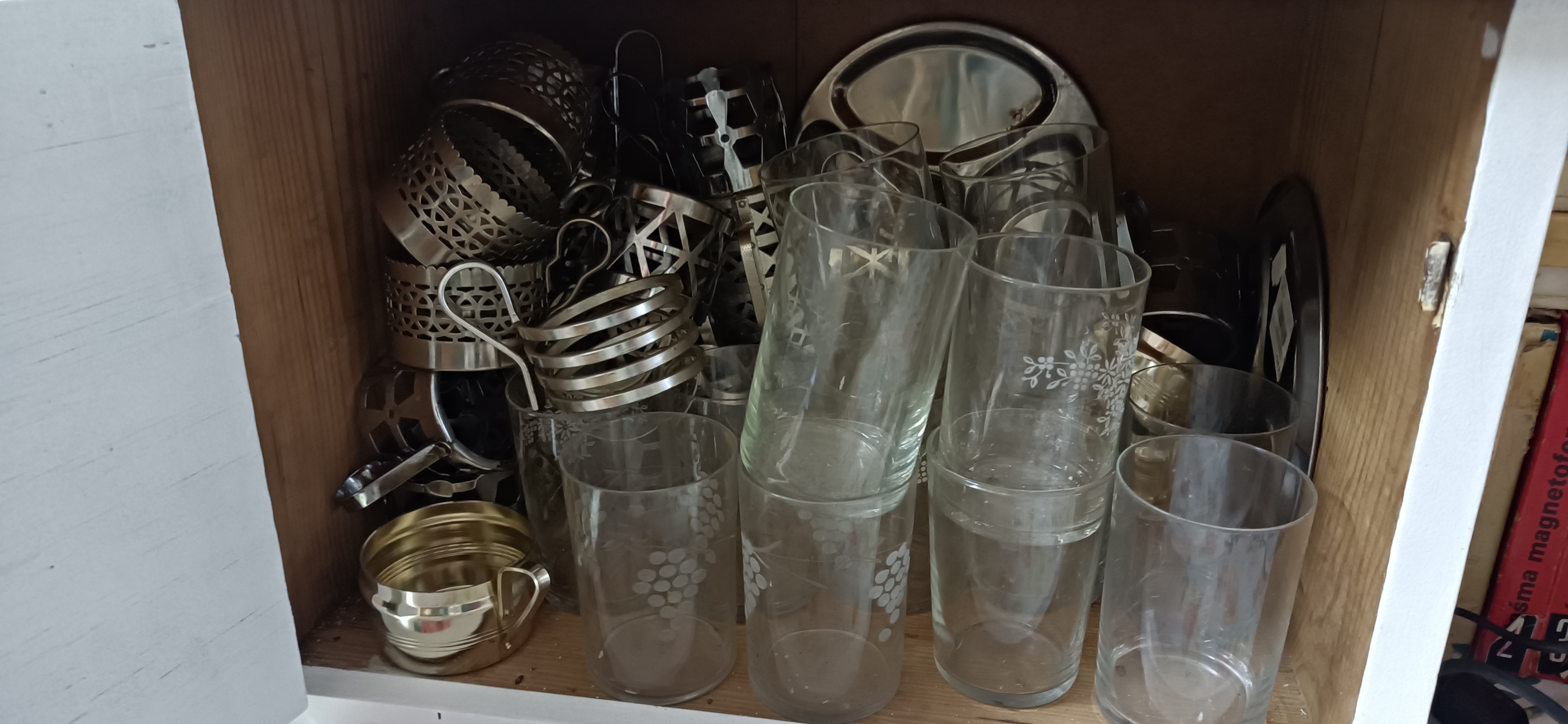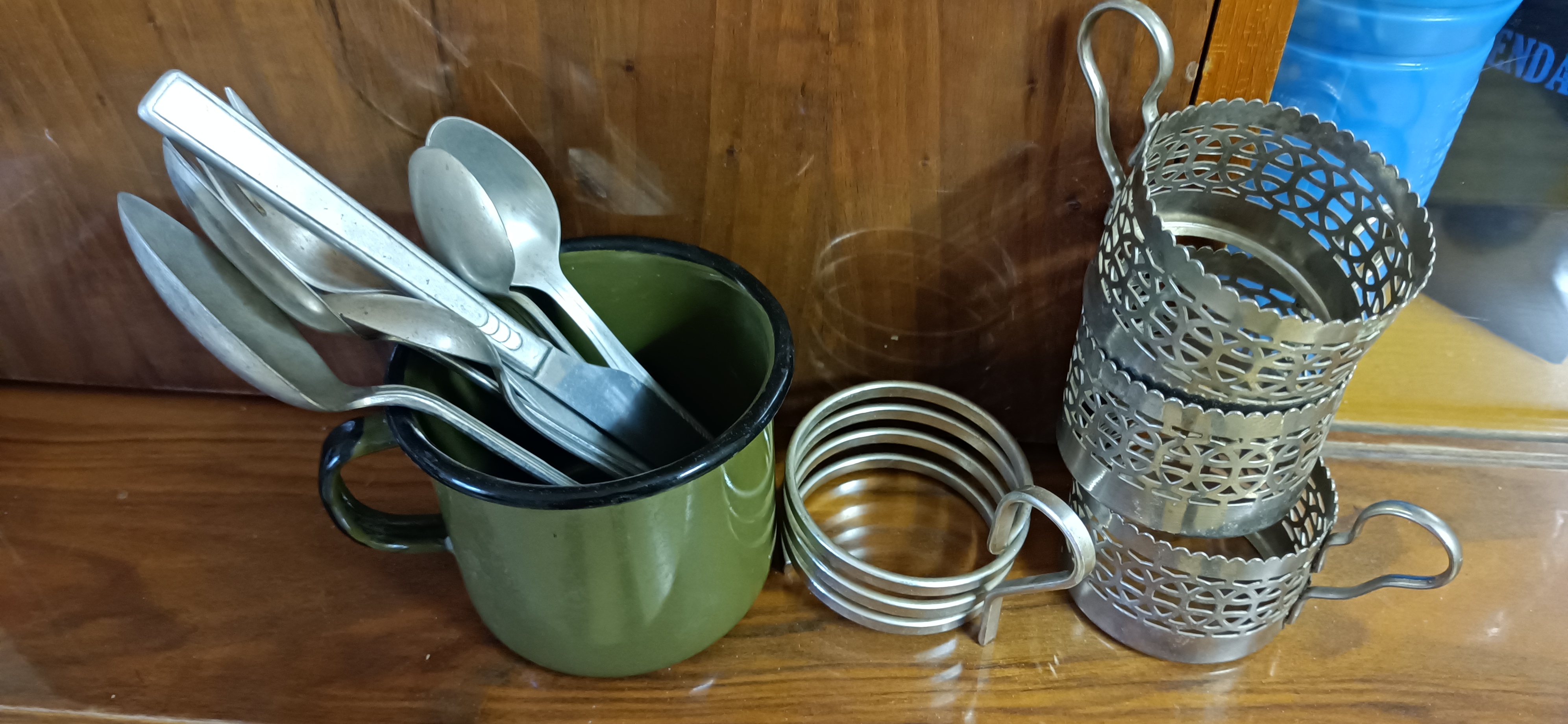 Kilka sztuk sztućców, koszyczków i kubek emaliowany zasilają zbiory w tematyce zastawy stołowej.