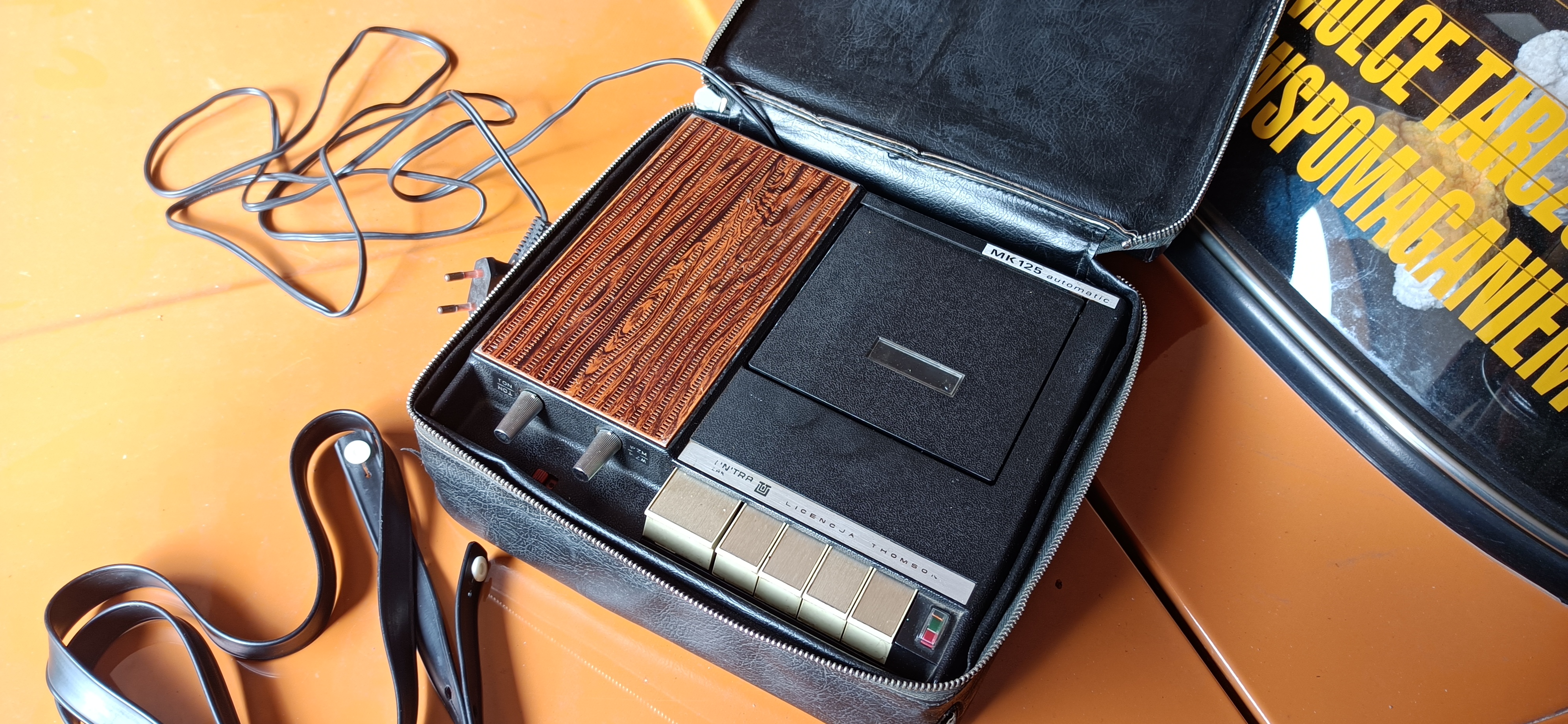 Bardzo ciekawy magnetofon MK125 na licencji Thomsona. Obsługa klawiszy w pionie i poziomie, napisy oprócz standardowego położenia także w lustrzanym odbiciu ponieważ można ten sprzęt zamontować do góry nogami pod szafką czy w aucie pod półką. Działa . Dzięki wiedzy i chęci jednego z forumowych kolegów został przeserwisował a dzięki dorobieniu adaptera na 12V z końcówką zapalniczki zostaje na stałe w dużym Fiacie!