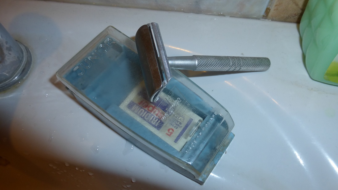 Mam też inną maszynkę, radziecką i bardziej zaawansowaną. Żeby wyjąć żyletkę nie trzeba jej rozkręcać, obraca się pierścień na rękojeści i górna część maszynki otwiera się dając dostęp do żyletki. Jest też podobnie realizowana (obracanym pierścieniem) regulacja "kąta natarcia ostrza". Przekręcając pierścień żyletka wygina się w łuk i zmienia się kąt pod jakim ostrze styka się ze skórą.