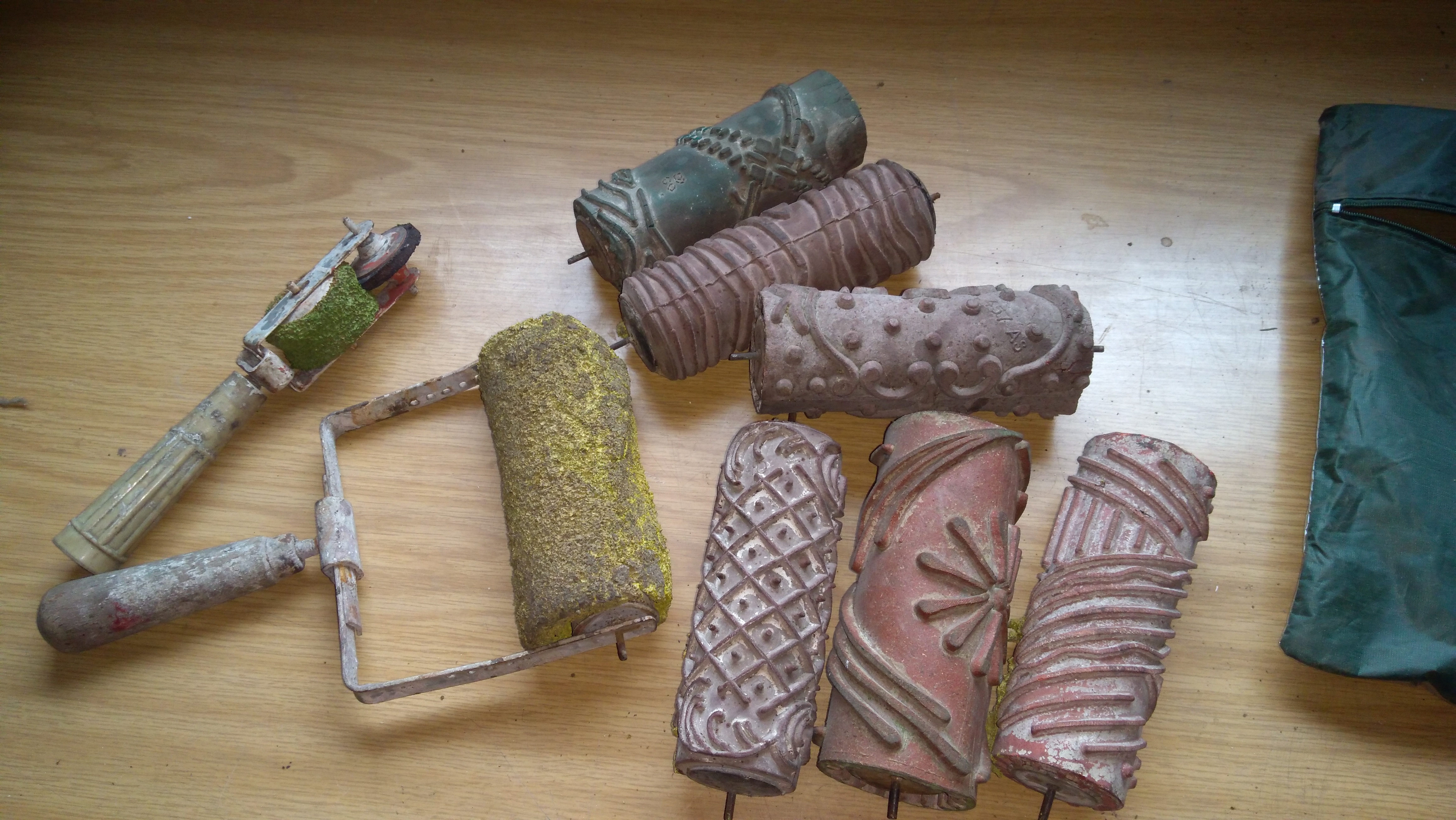 Mam kilkanaście wałków malarskich z różnymi deseniami, do tego jest maszynka z gąbką. Znalazłem też zagłówki do malucha zakładane na oparcie przednich foteli w latach 70tych i 80tych. Oddam po kosztach. Proszę dzwonić 502 892599.