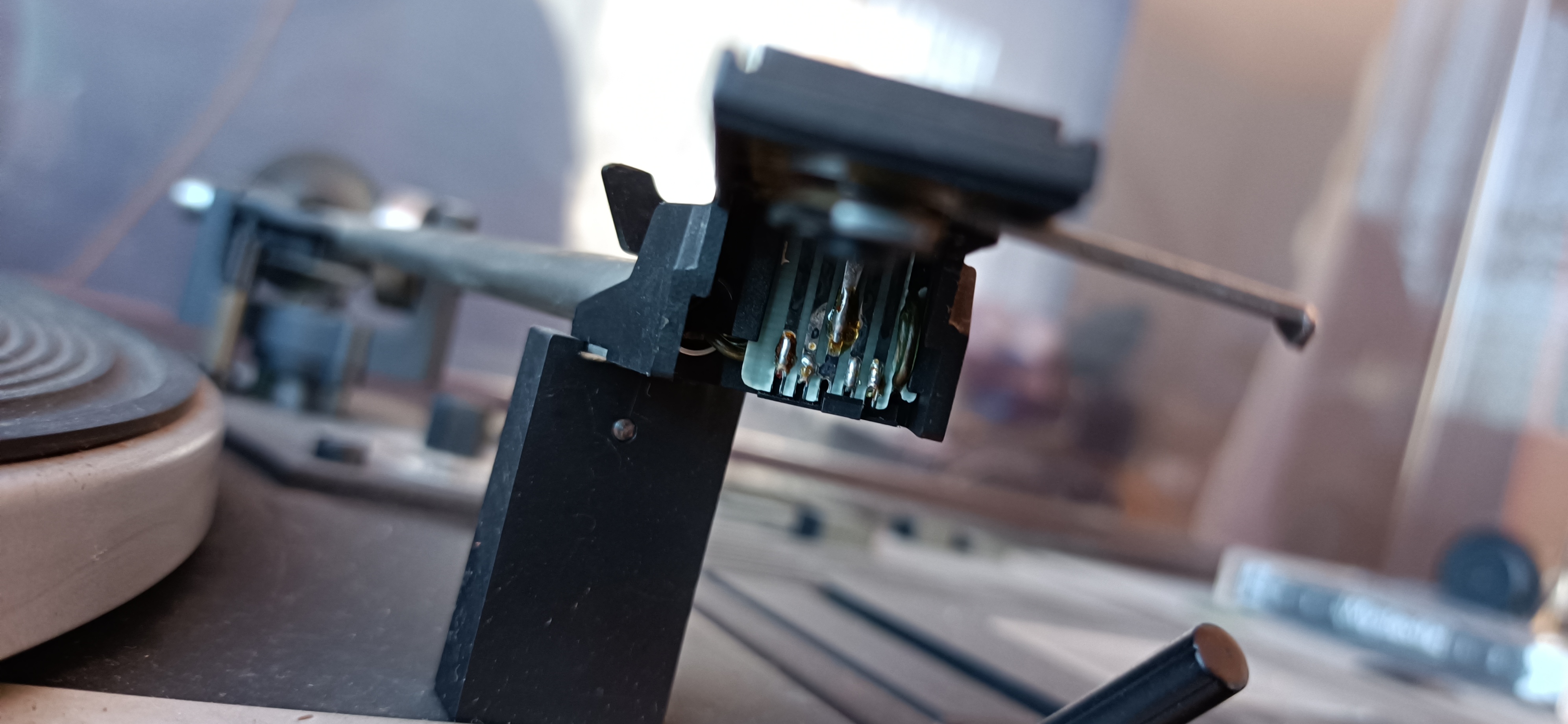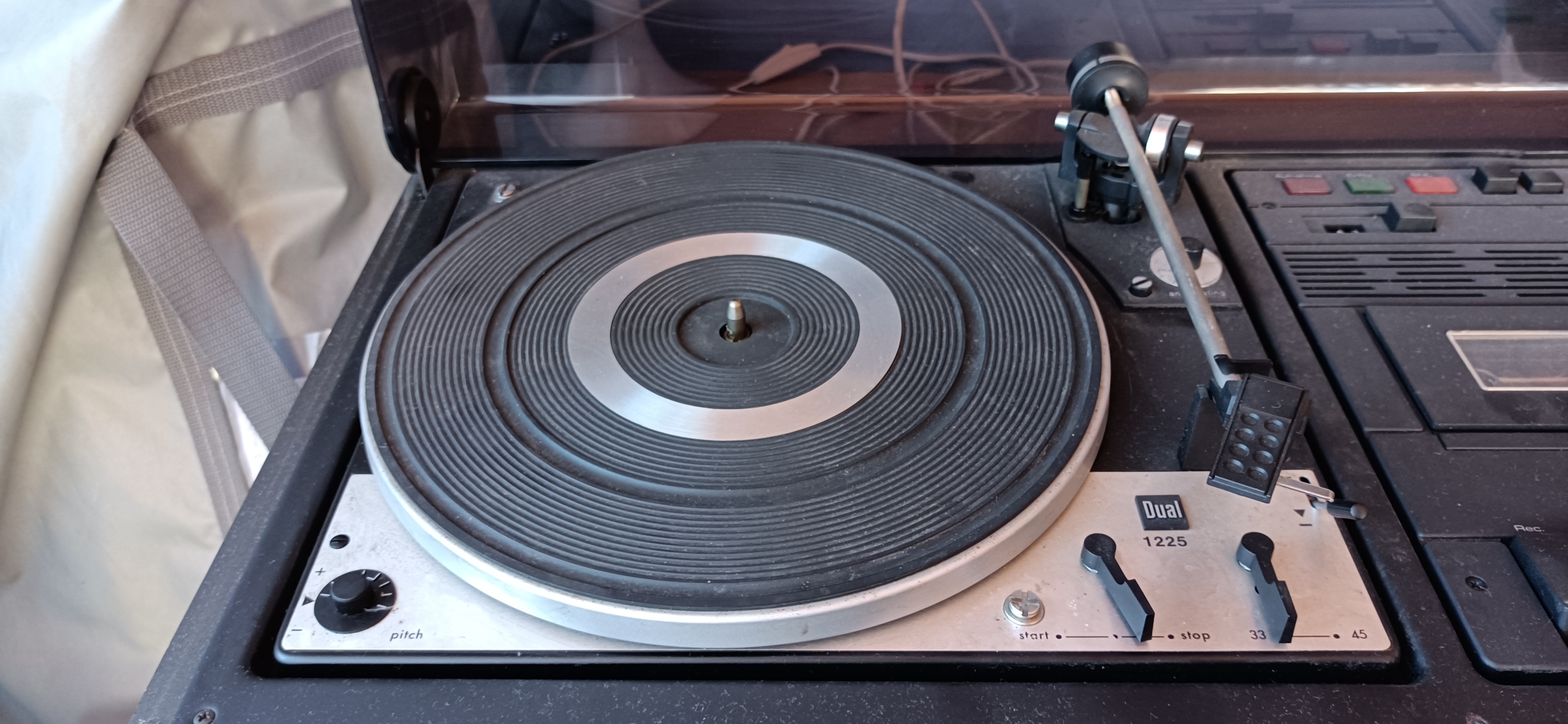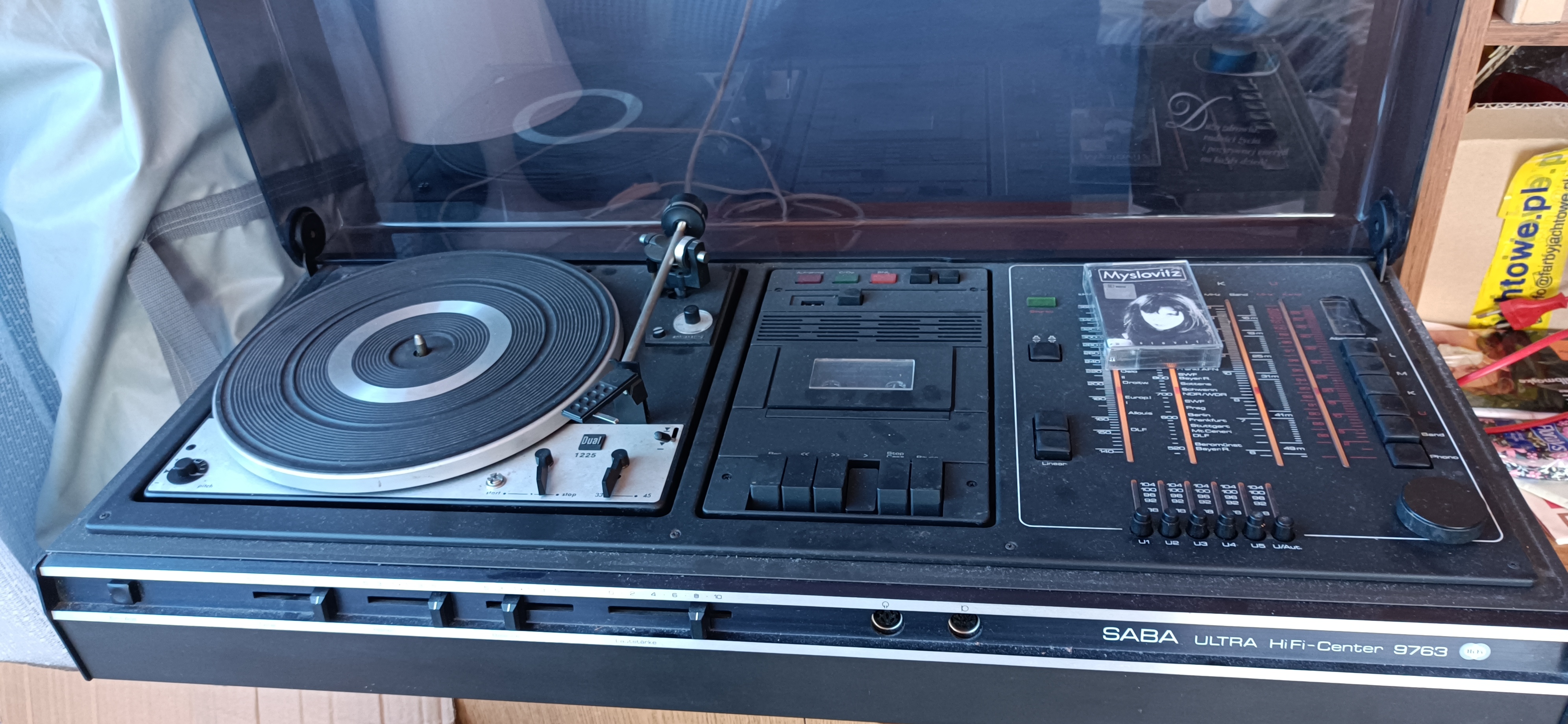 Najsłabszym punktem jest gramofon. Brak igły, prawdopodobnie coś z automatem ramienia bo pstyka ale nie zabiera go nad płytę (powrót działa). Dodatkowo jest jakieś sprzężenie w ramieniu bo przy dotknięciu mocno "buczy". Silnik i prędkości wydają się ok.