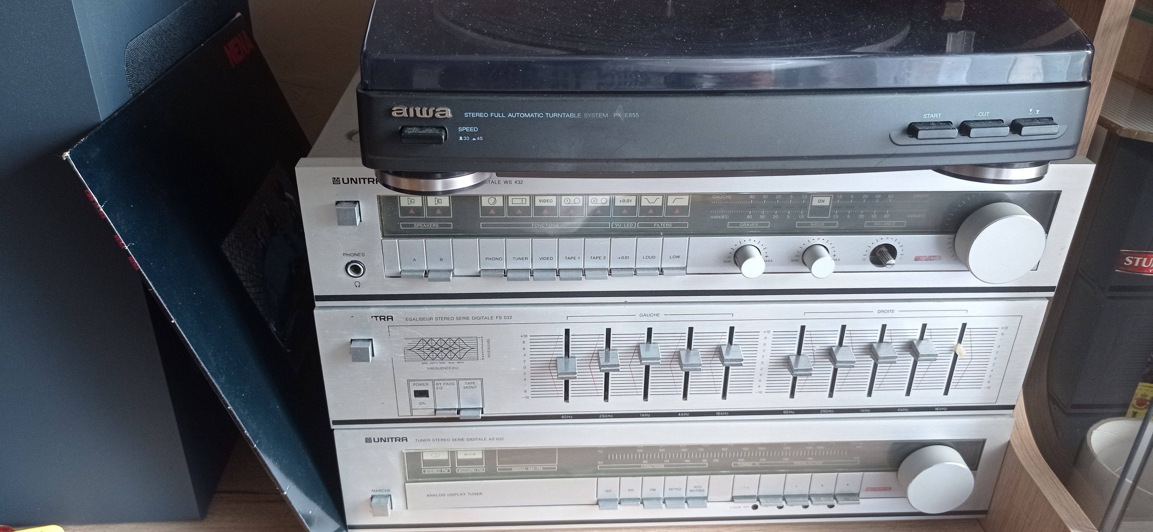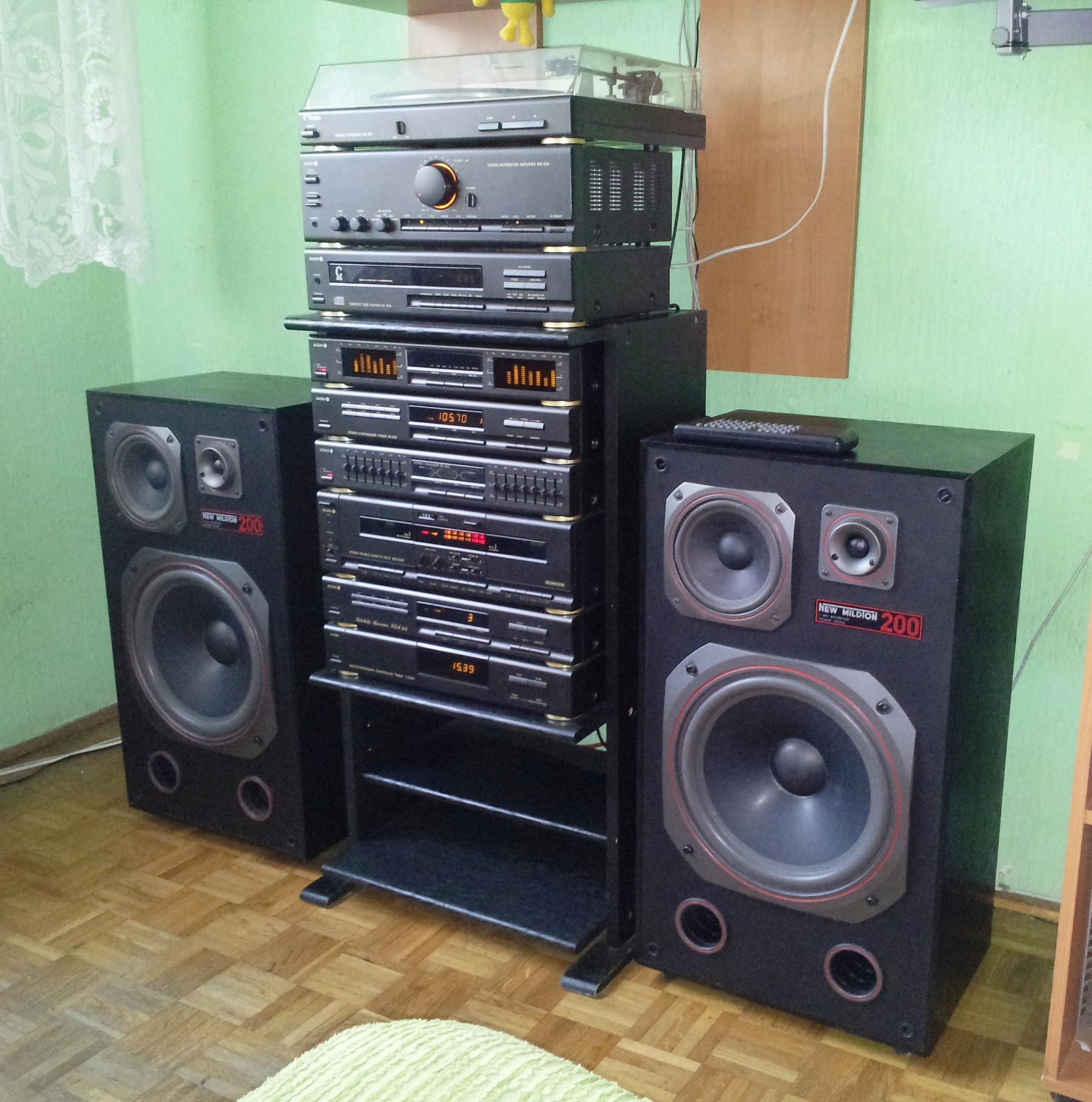 Chwilę temu wpadł mi w łapska diorowski zestaw SSL 032. Kilka dni temu za kilkadziesiąt zyli kupiłem gramofon Akai. Diora wymaga przeglądu, strojenia i gruntownego czyszczenia. Kolumny zdobyczne z jakiejś wieży technicsa. Jednym słowem zbieranina. Chwilowo gramofon wpięty do soundbara. Docelowo ma trafić pod Diorę. Fajnie by było złożyć klocki Diory SSL 500, ale odkryłem ostatnio japońską nieistniejącą już markę Sansui i korci mnie by w tym kierunku iść.