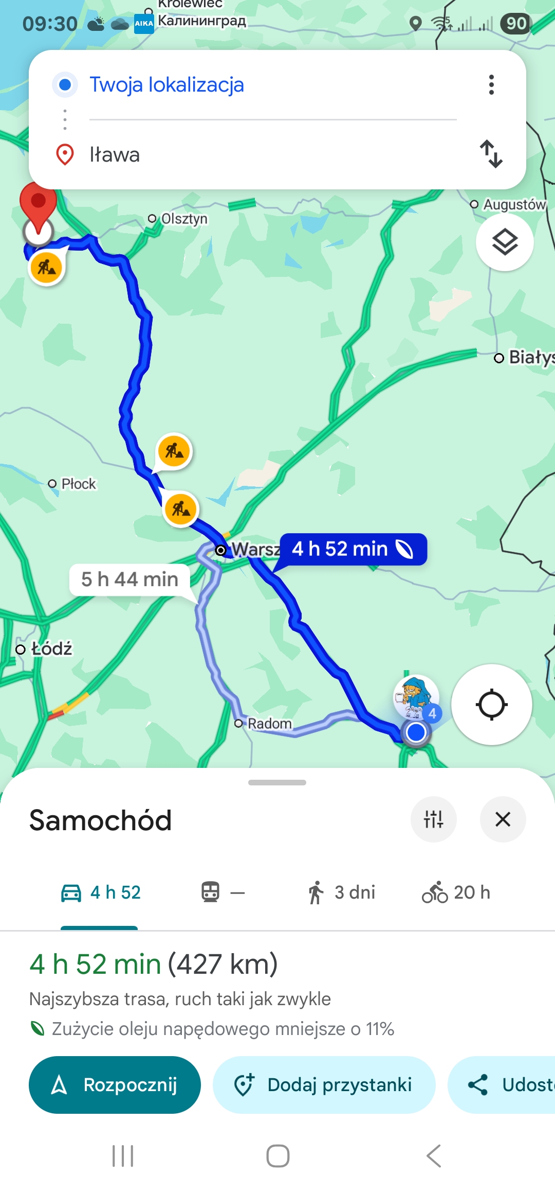 My wystartujemy około 14:30, ale niestety 5h jechania. A biorąc po uwagę, że przez Warszawę będziemy jechali koło 16 to może wyjść dłużej