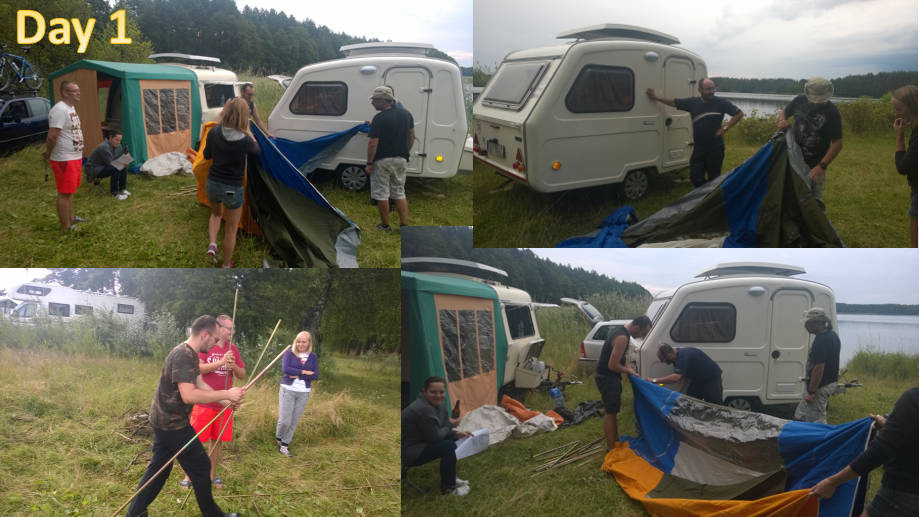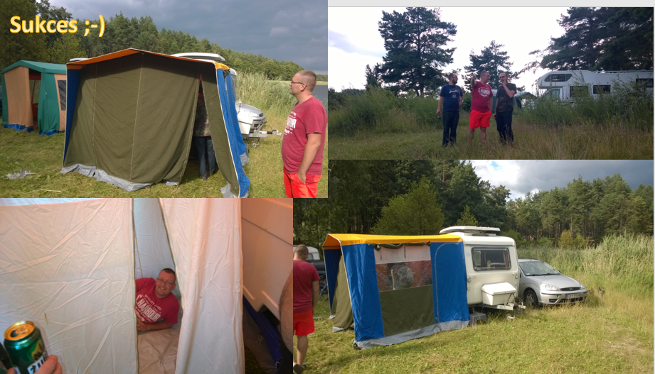 Potem okazało się że przedsionek nie ma kedry. Było to spore zaskoczenie, ale "podobno takie przedsionki są, co się je naciąga na bok przyczepy i ściąga sznurkiem". No dobra jak są to są. Nie wiem czy faktycznie takie są, ale jak są to autora patentu należałoby powiesić za jaja. W każdym razie po długiej walce z rurkami udało się założyć przedsionek, i nawet sypialnię. Wszystko super, duży przedsionek z 3 wejściami, z sypialnią...
