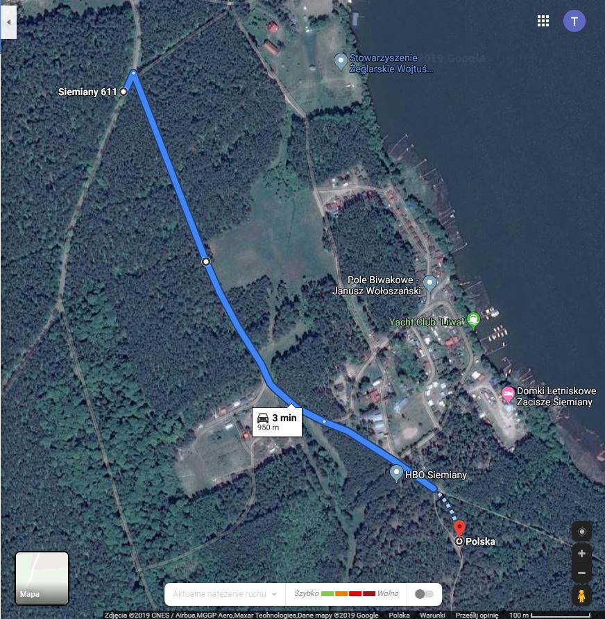 Jadąc przez las też trzeba uważać, bo droga dziurawa. Kilkaset metrów dalej najpierw mijamy po prawej jakieś domki, chwilę później po lewej zabudowania Bazy obozowej, a w oddali będą też widoczne domki i przyczepy które stoją tam cały czas. Znowu kilkadziesiąt metrów do przodu i będzie droga w prawo w las. Nasz plac jest dokładnie tu gdzie wskazuje czerwona szpilka czyli minimalnie dalej niż mapa pokazuje HBO Siemiany.