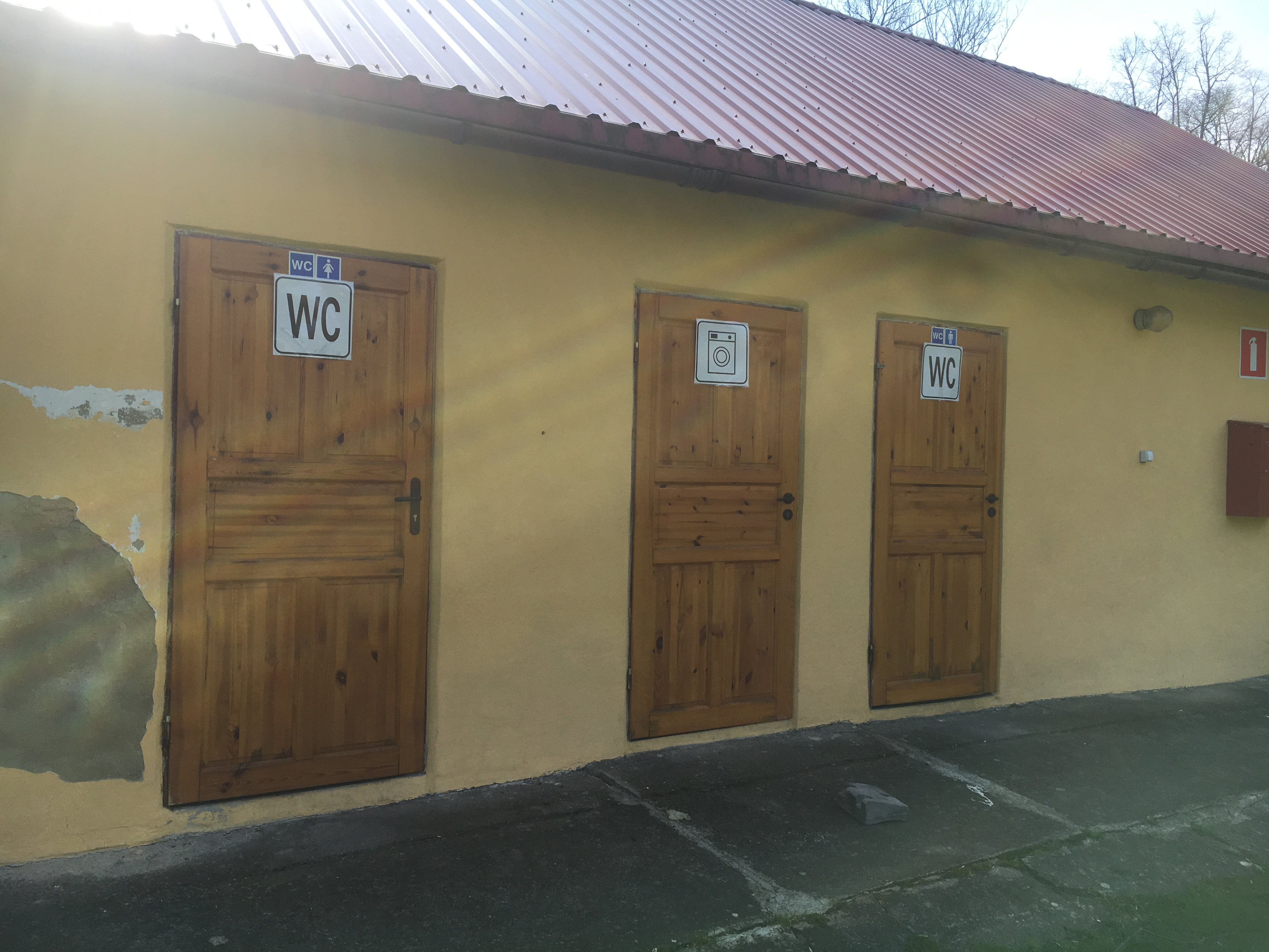 Toalety, pralnia, prysznice oraz skrzynki z prądem.
