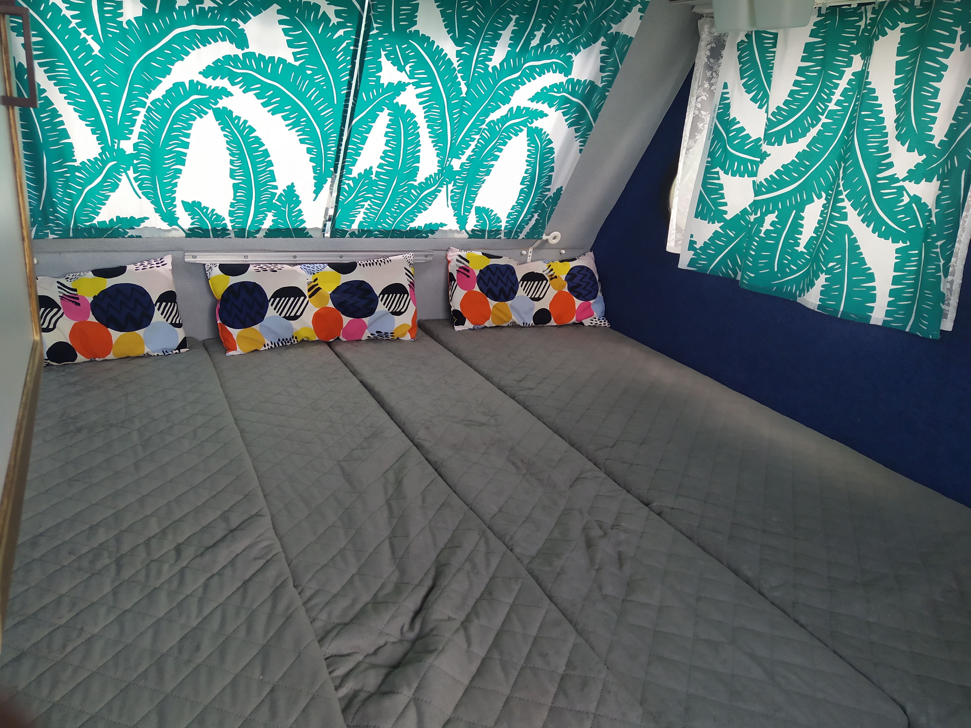 U nas na dużym rozłożonym "łóżku" śpimy z żoną z młodszym dzieckiem , a na blacie dziennym w przedniej części przyczepy rozkładamy dodatkowe materace i starszy syn ma wygodne spanie 185 x 50 cm. Blat jest w formie trapezu żeby swobodnie mieścić się w drzwiach. To jest taka wersja 2+1+1 lub 2+1.