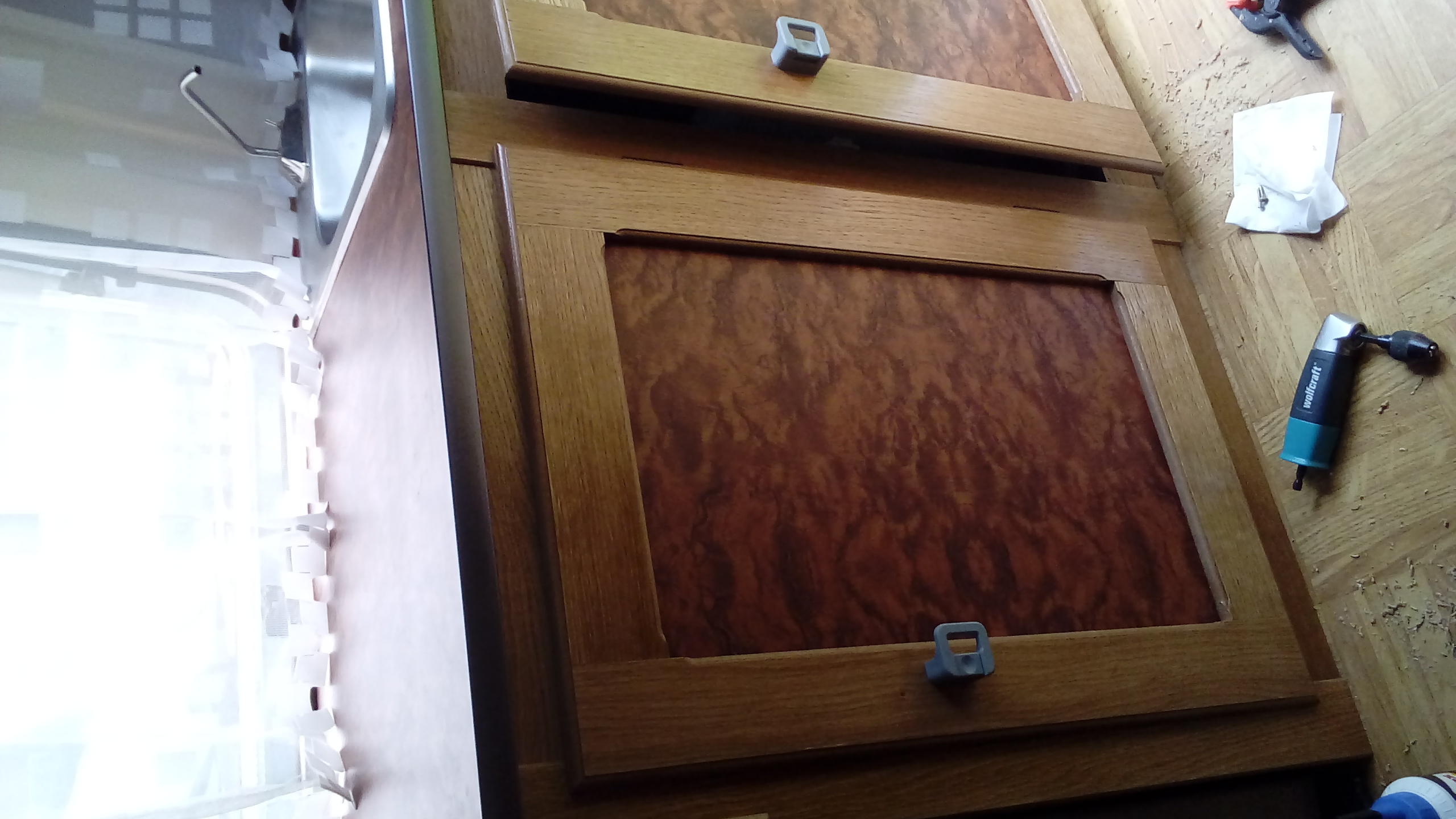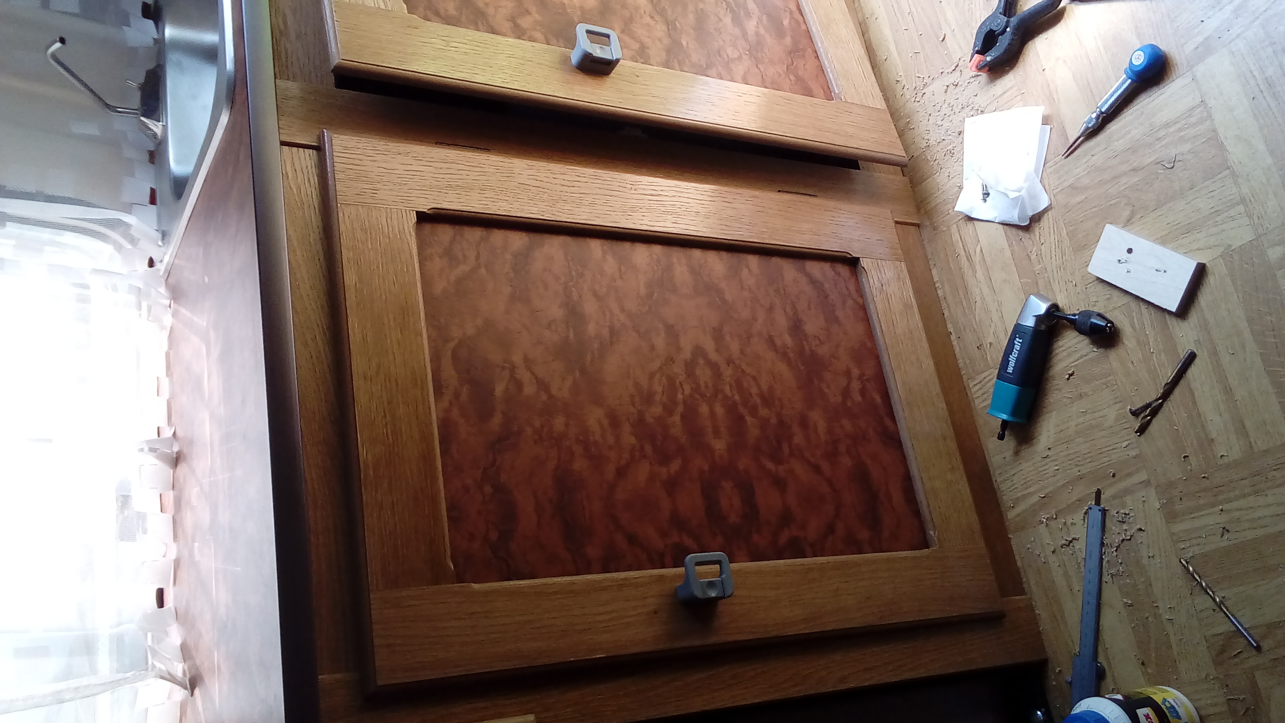 fornir dębowy ( ciemniejsze fronty ) lub bukowy ( jaśniejsze fronty ) Drzwiczki wykonać z MDF grubości 10 mm i pionowe opaski, poziome opaski z MDF grubości 6 lub 8 mm Fornir kleimy klejem PATTEX jak wcześniej można było zobaczyć na zdjęciach. Klejem smarujemy obie powierzchnie ( fornir oraz MDF ) klej nanosimy bezpośrednio z tuby ( opakowania) wężykowo jak wcześniej na foto i potem przy użyciu plastkiowej szerokiej szpachelki rozprowadzamy równo po fornirze i płycie MDF